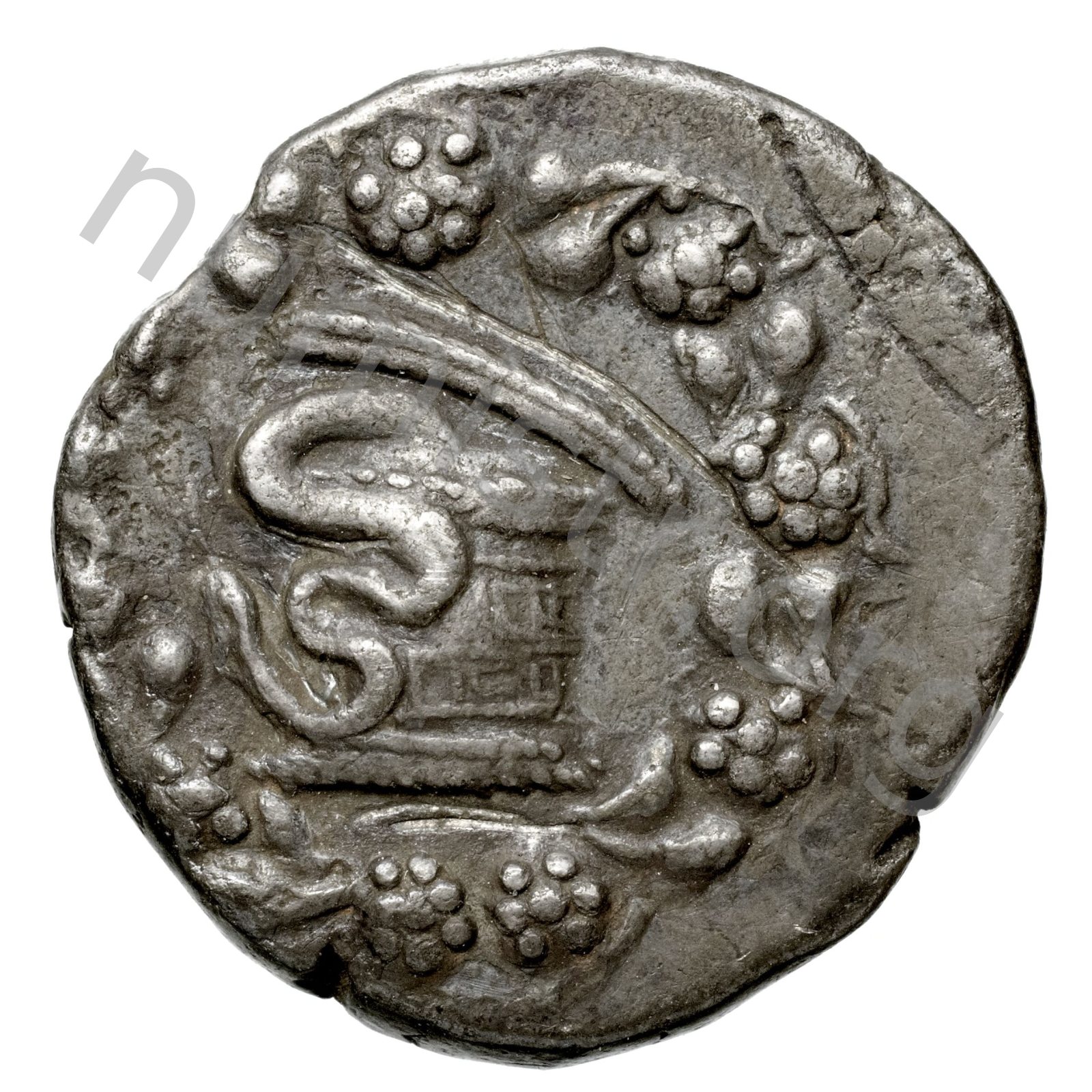 Basket (cista mystica) from which a snake emerges in a wreath of ivy -[en]
