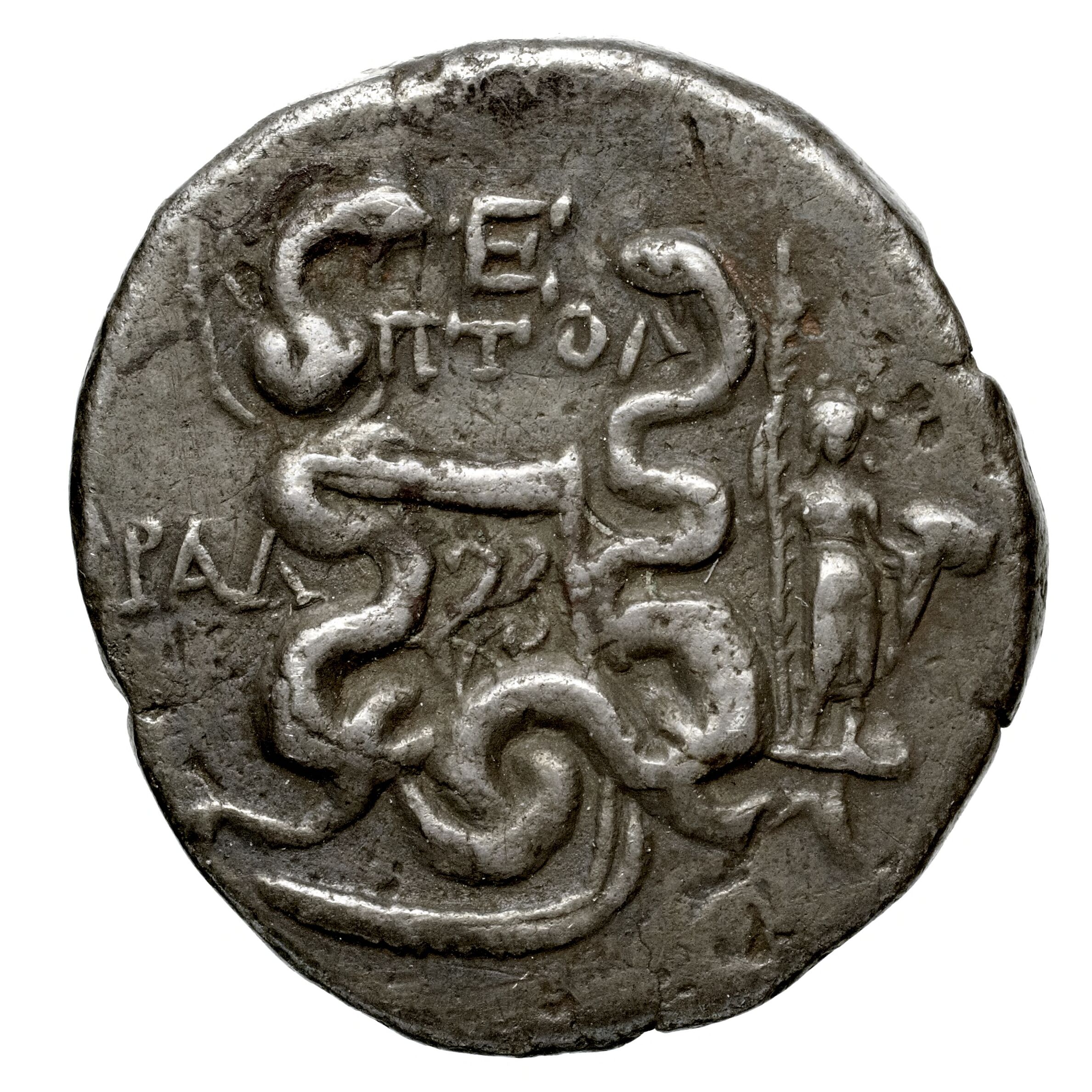 Gorytos (yay kılıfı) bir artı işaretiyle süslenmiş ve iki iç içe geçmiş yılan arasında bir yay bulunan; yan tarafta haşhaş başlı ve mısır koçanı bulunan
