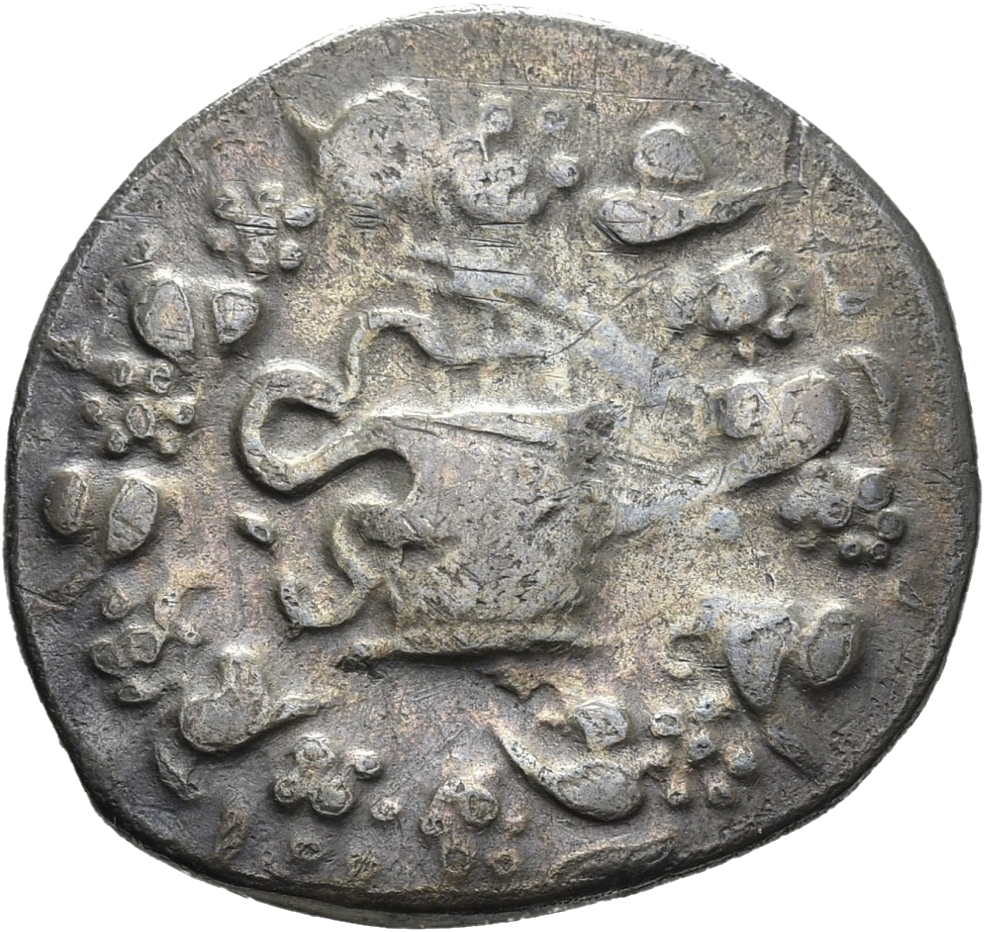 Basket (cista mystica) from which a snake emerges in a wreath of ivy -[en]