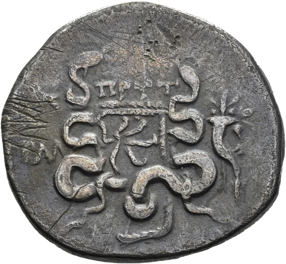 Gorytos (yay kılıfı) bir artı işaretiyle süslenmiş ve iki iç içe geçmiş yılan arasında bir yay bulunan; yan tarafta haşhaş başlı ve mısır koçanı bulunan