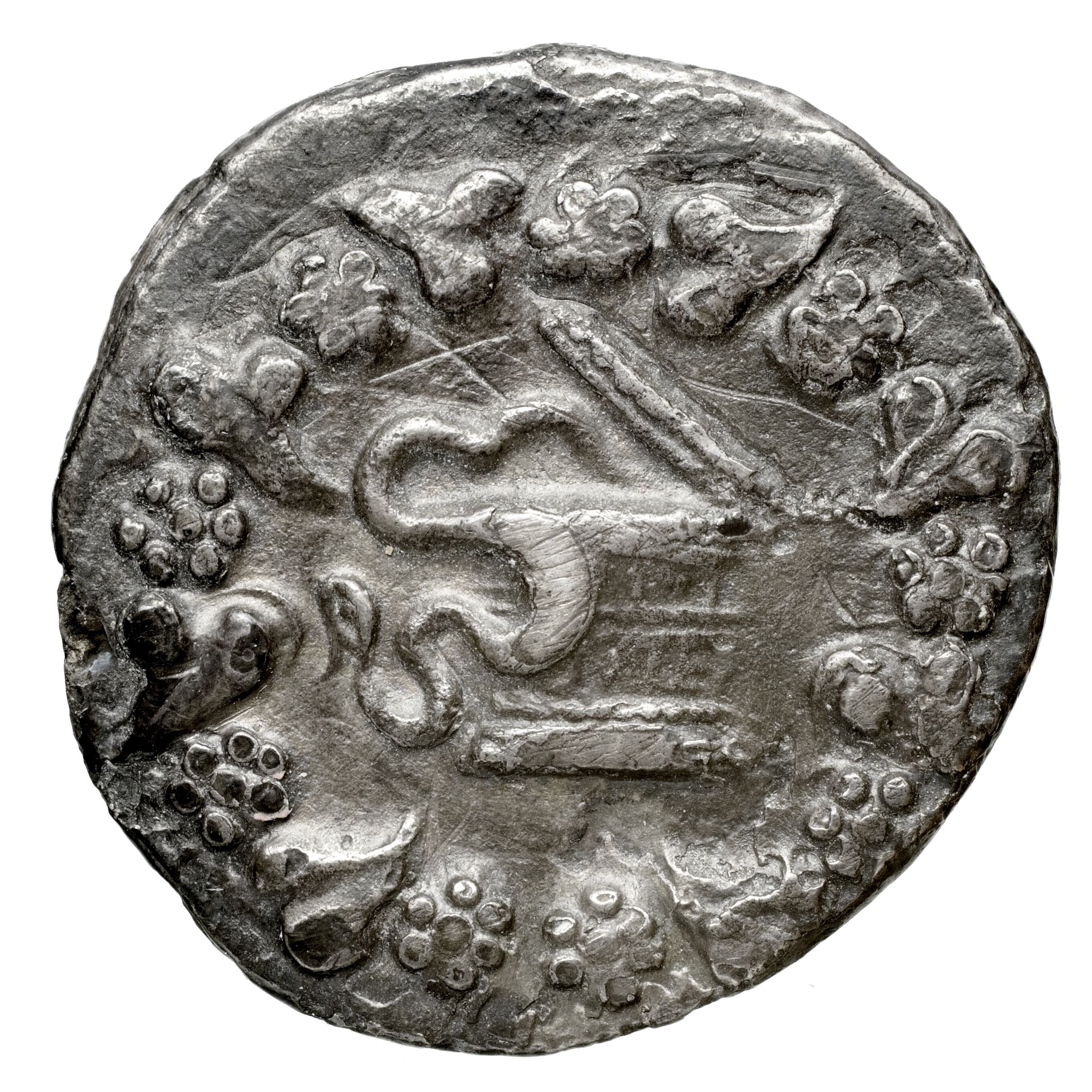Basket (cista mystica) from which a snake emerges in a wreath of ivy -[en]