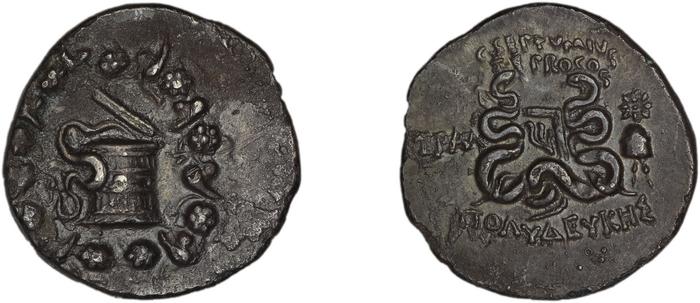 Gorytos (yay kılıfı) bir aplustre ile süslenmiş ve iki iç içe geçmiş yılan arasında bir yay içeren; yan pileus ise yıldızla taçlandırılmış