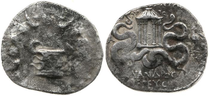 Basket (cista mystica) from which a snake emerges in a wreath of ivy -[en]