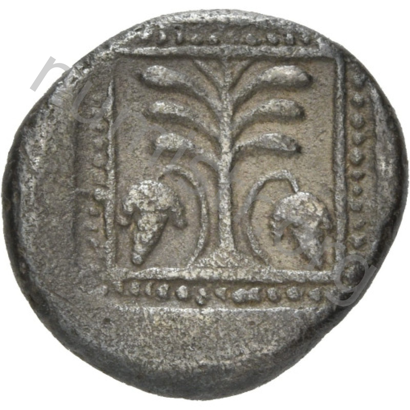 Fir-tree between two bunches of grapes within linear square and a square of dots. -[en]