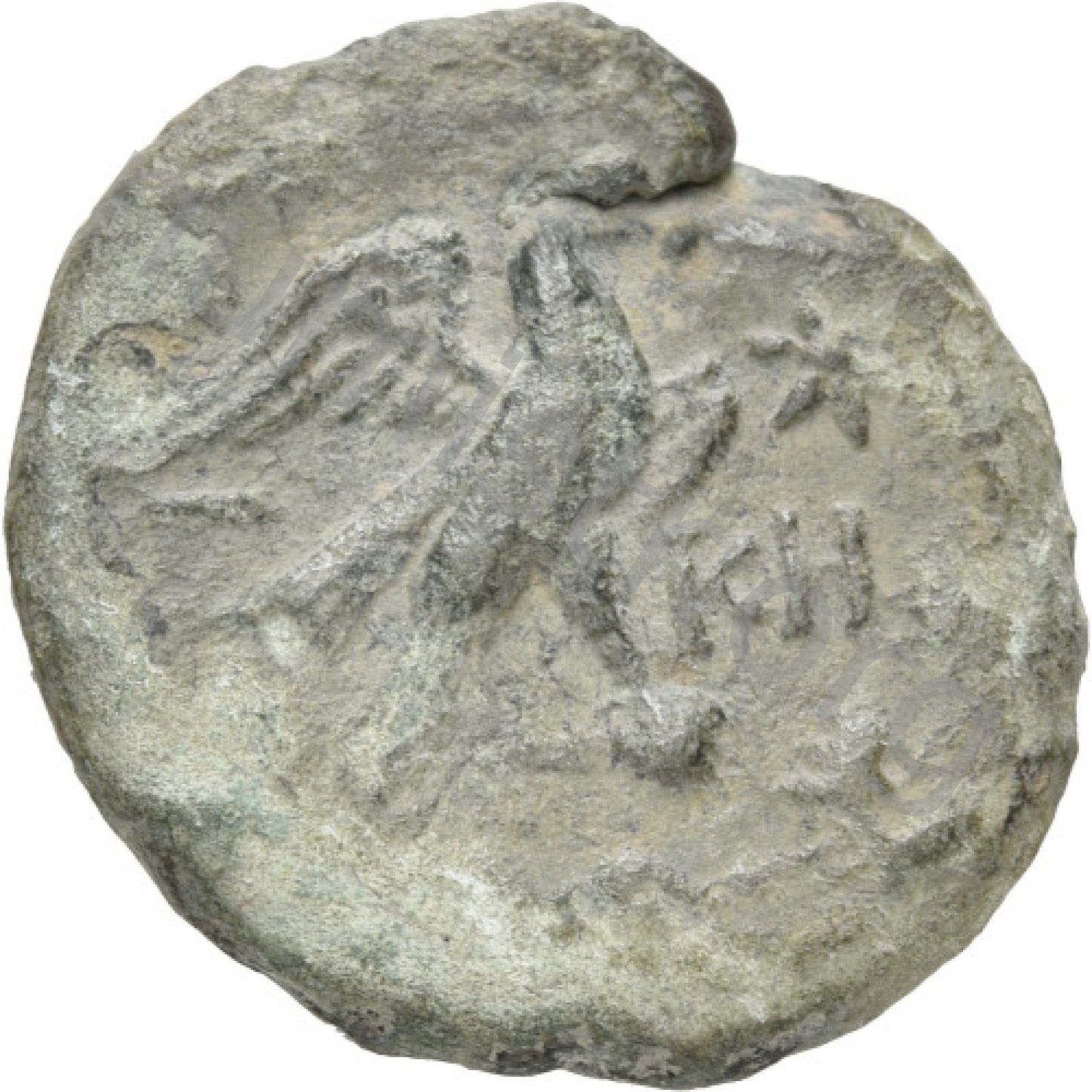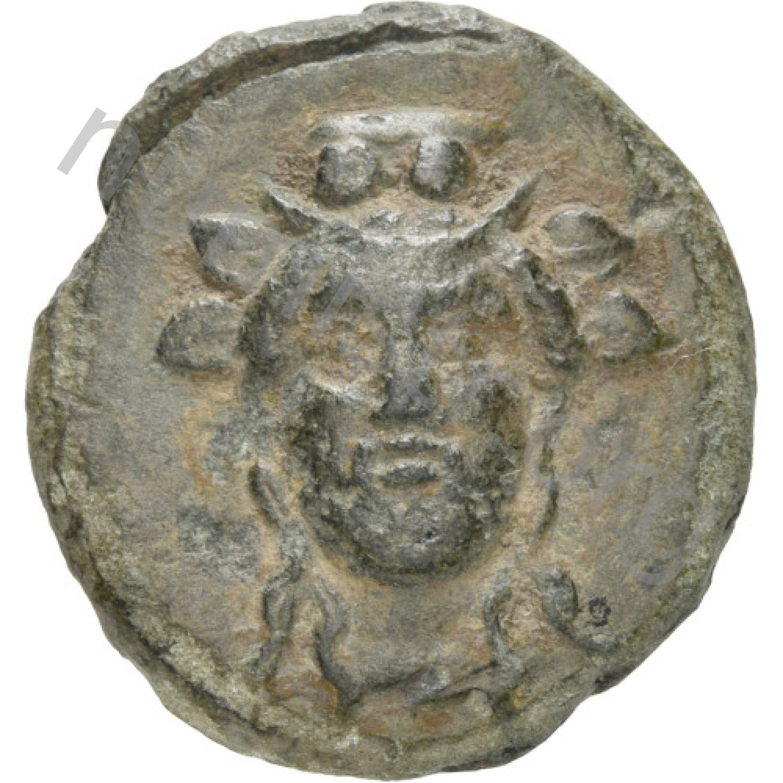 Horned head of Dionysos facing wearing kalathos and ivy wreath. -[en]