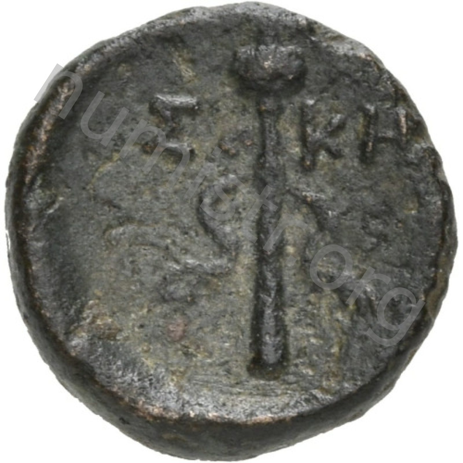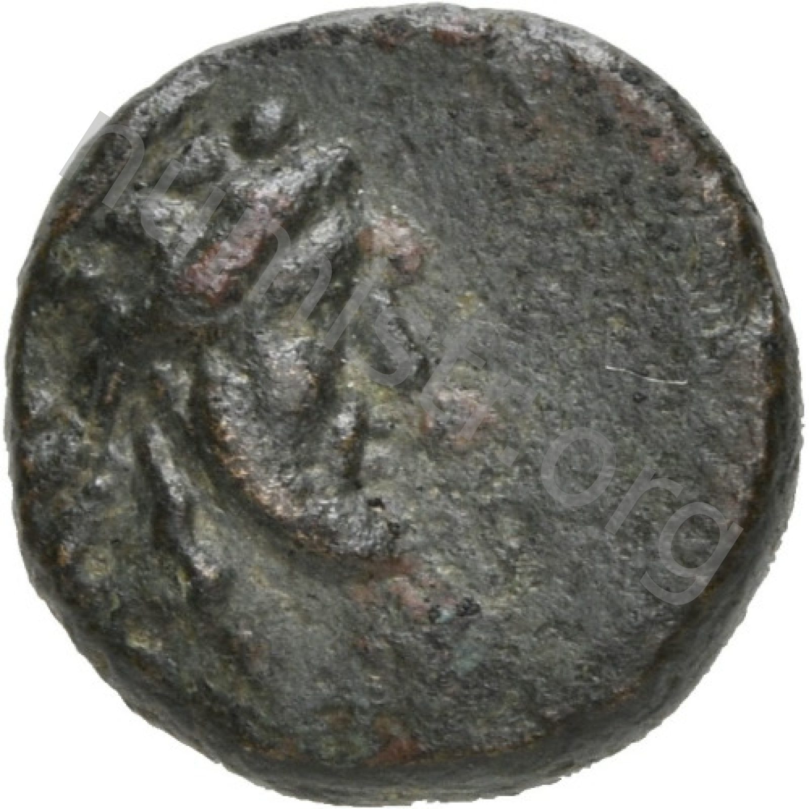 Head of bearded Dionysus right wearing kalathos and ivy wreath. -[en]