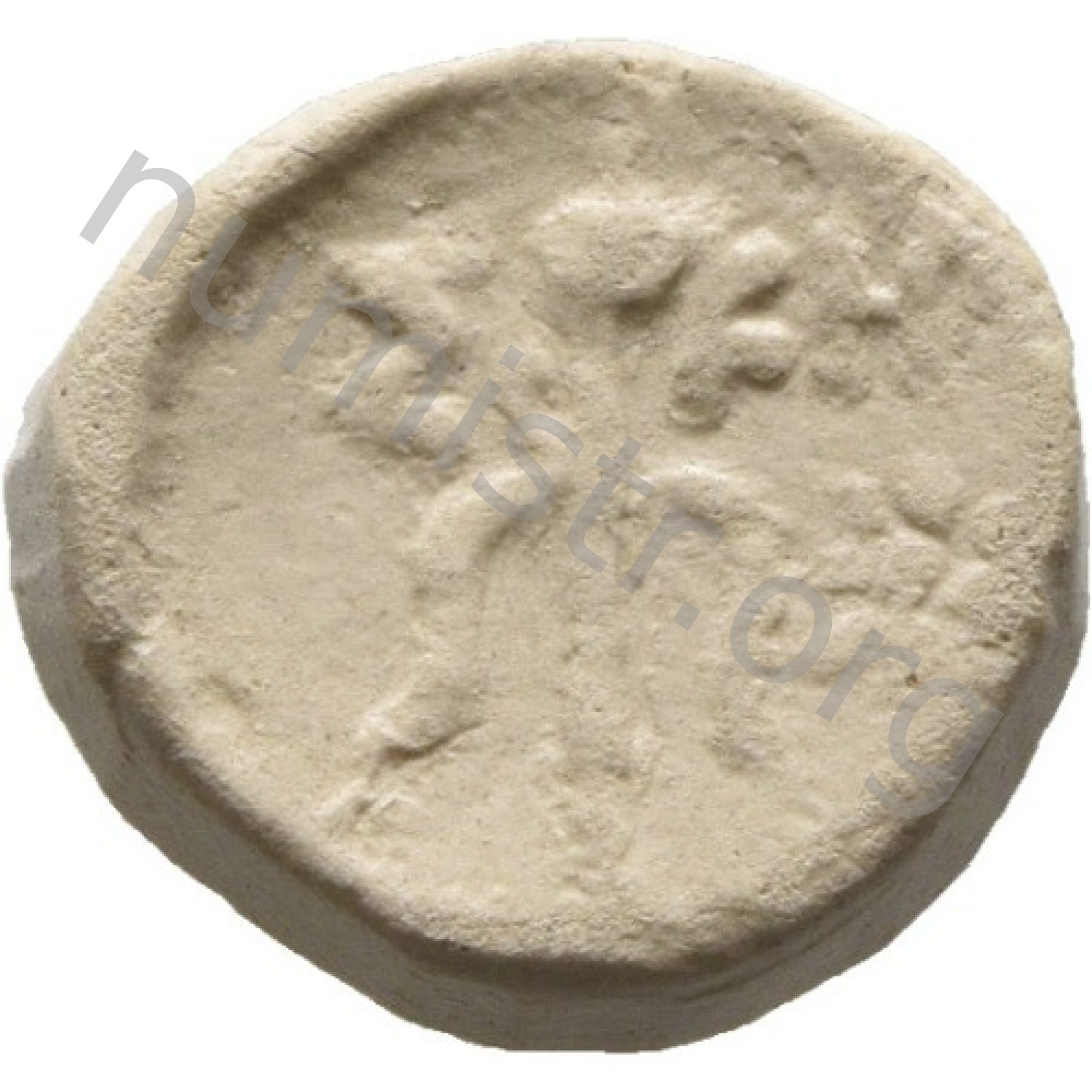 Head of bearded Dionysus right wearing kalathos and ivy wreath. -[en]