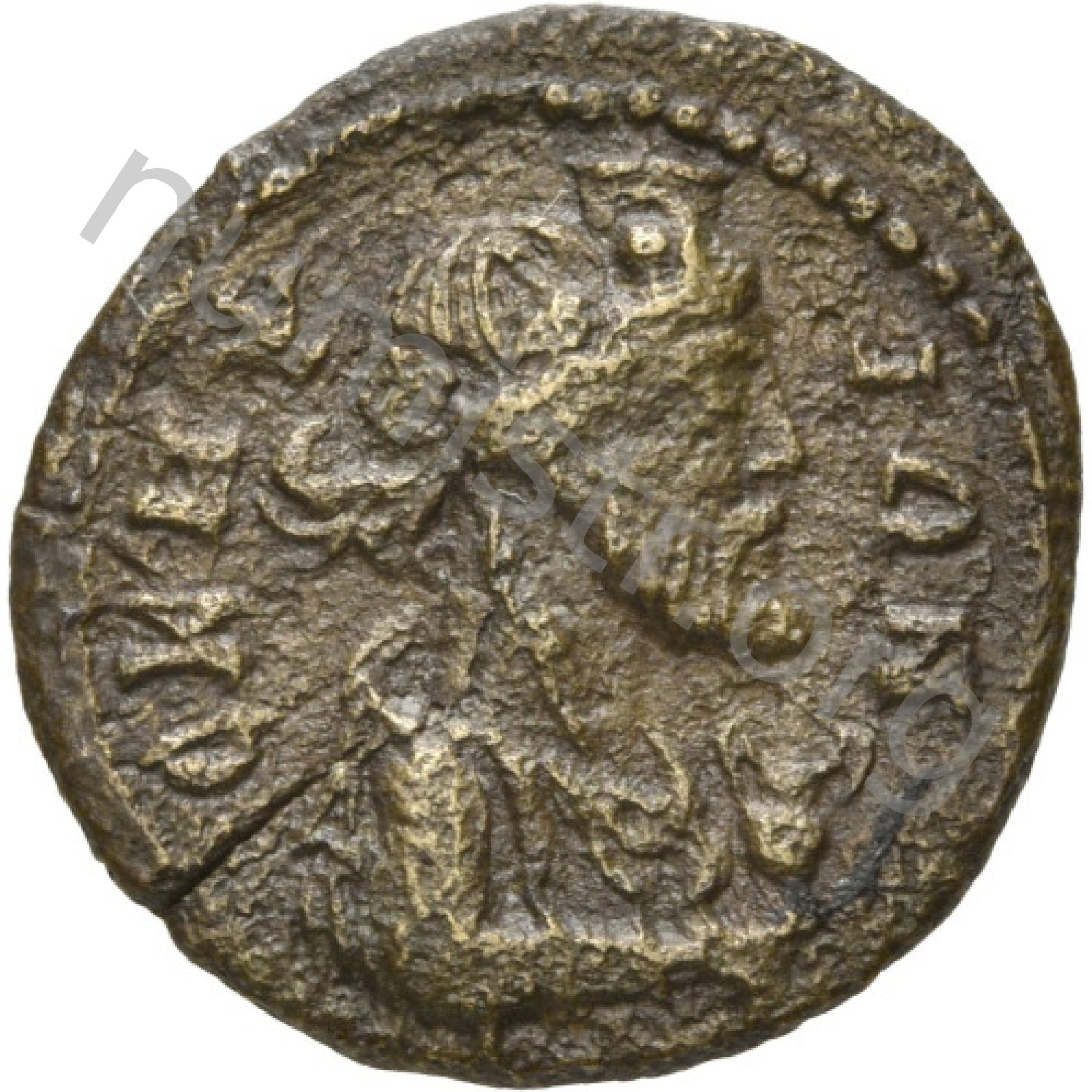 Dionysos'un örtülü sakallı büstü sağa doğru sarmaşık çelengi ve kalathos takıyor; sağ elinde kantharos tutuyor.