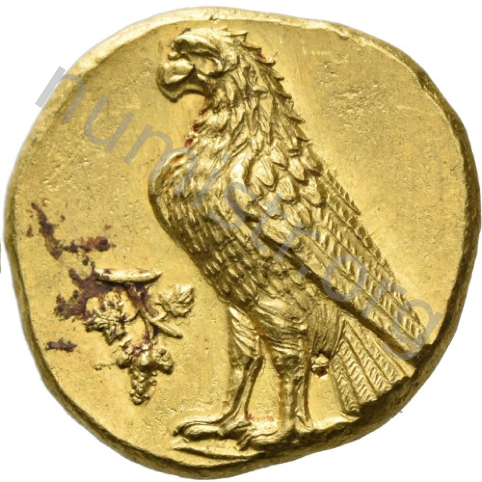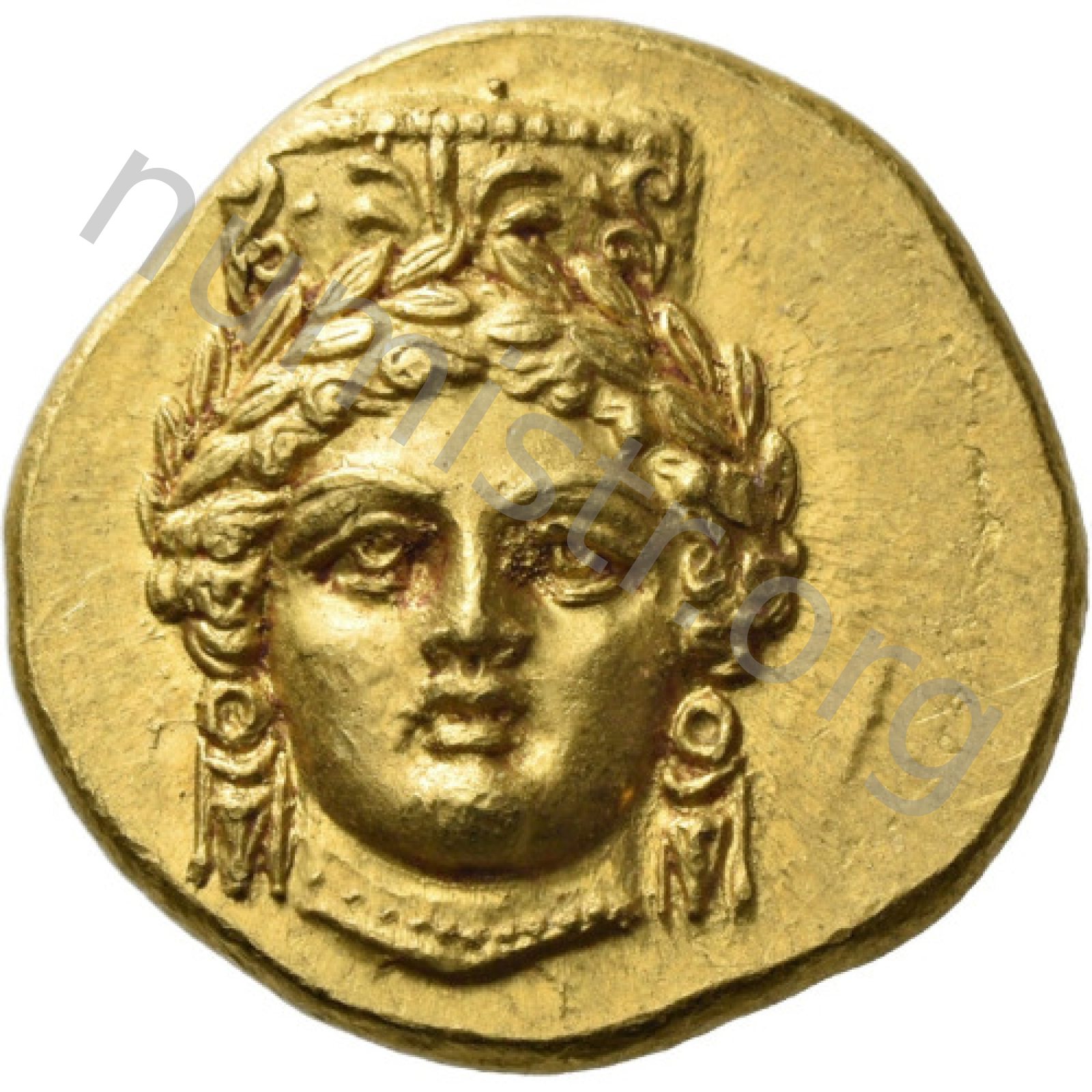 Head of Artemis facing wearing stephane and earrings. -[en]