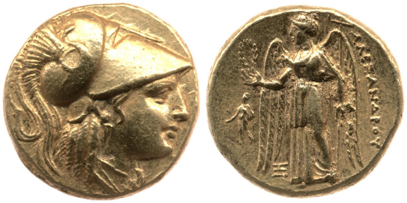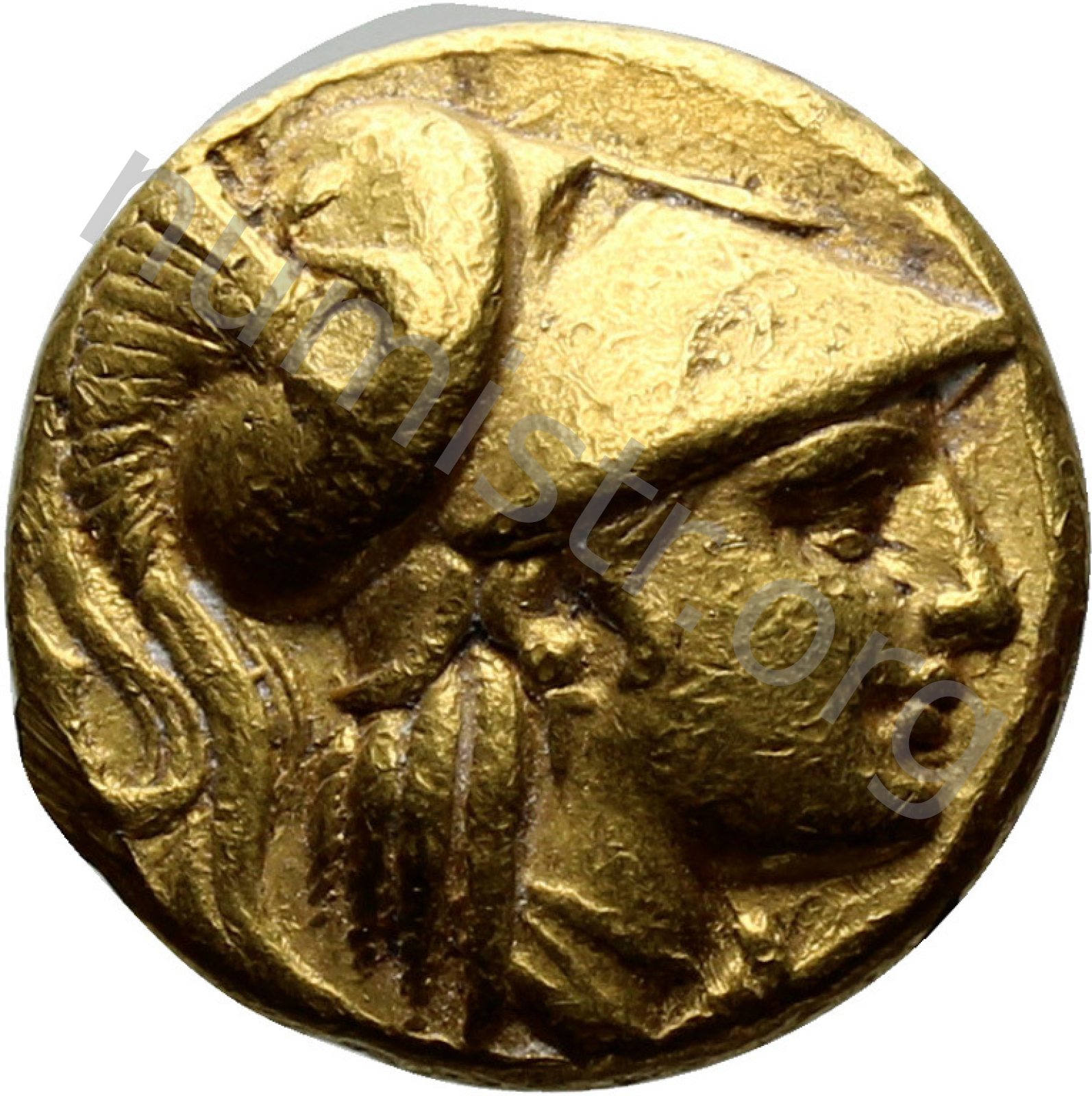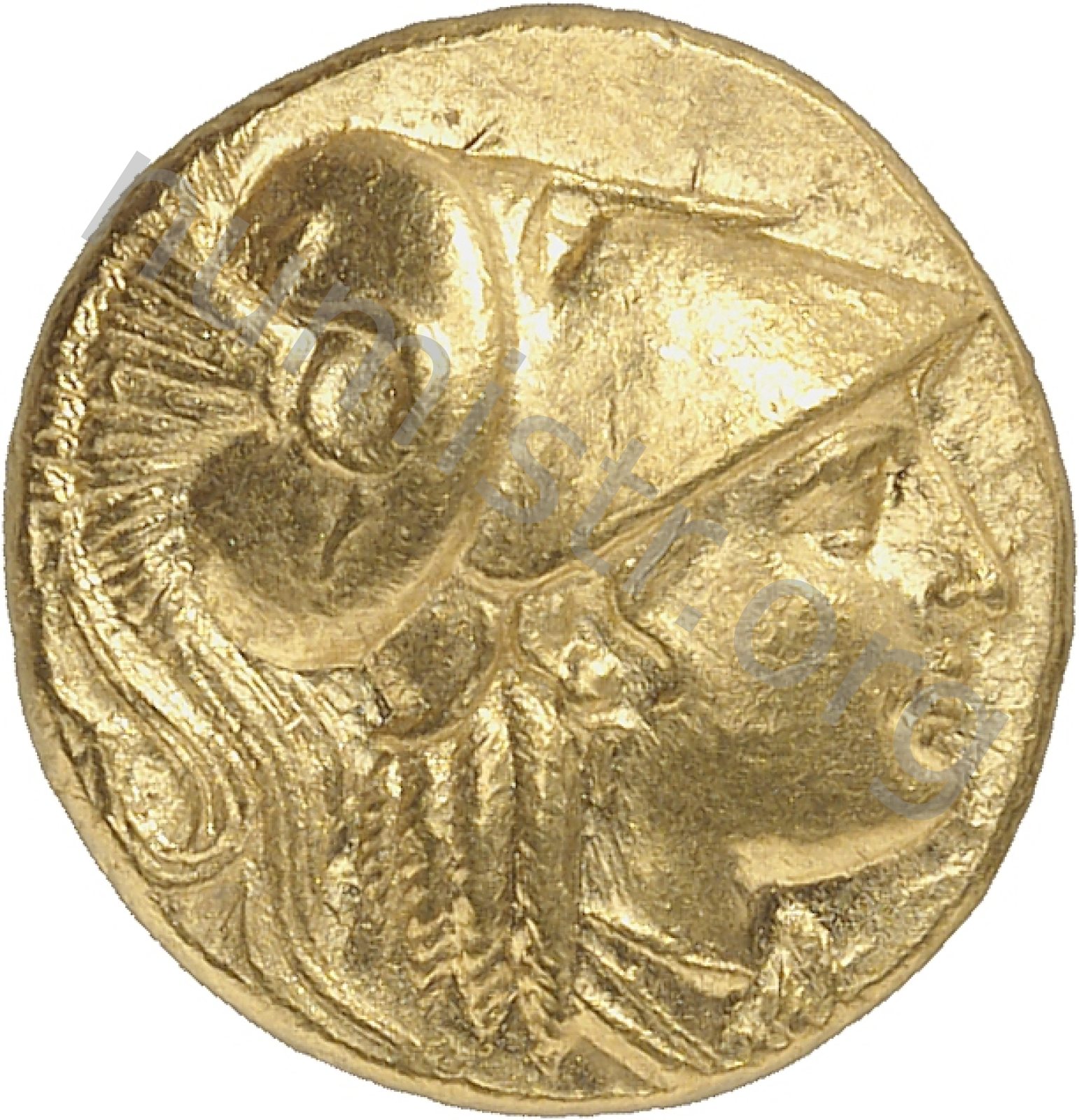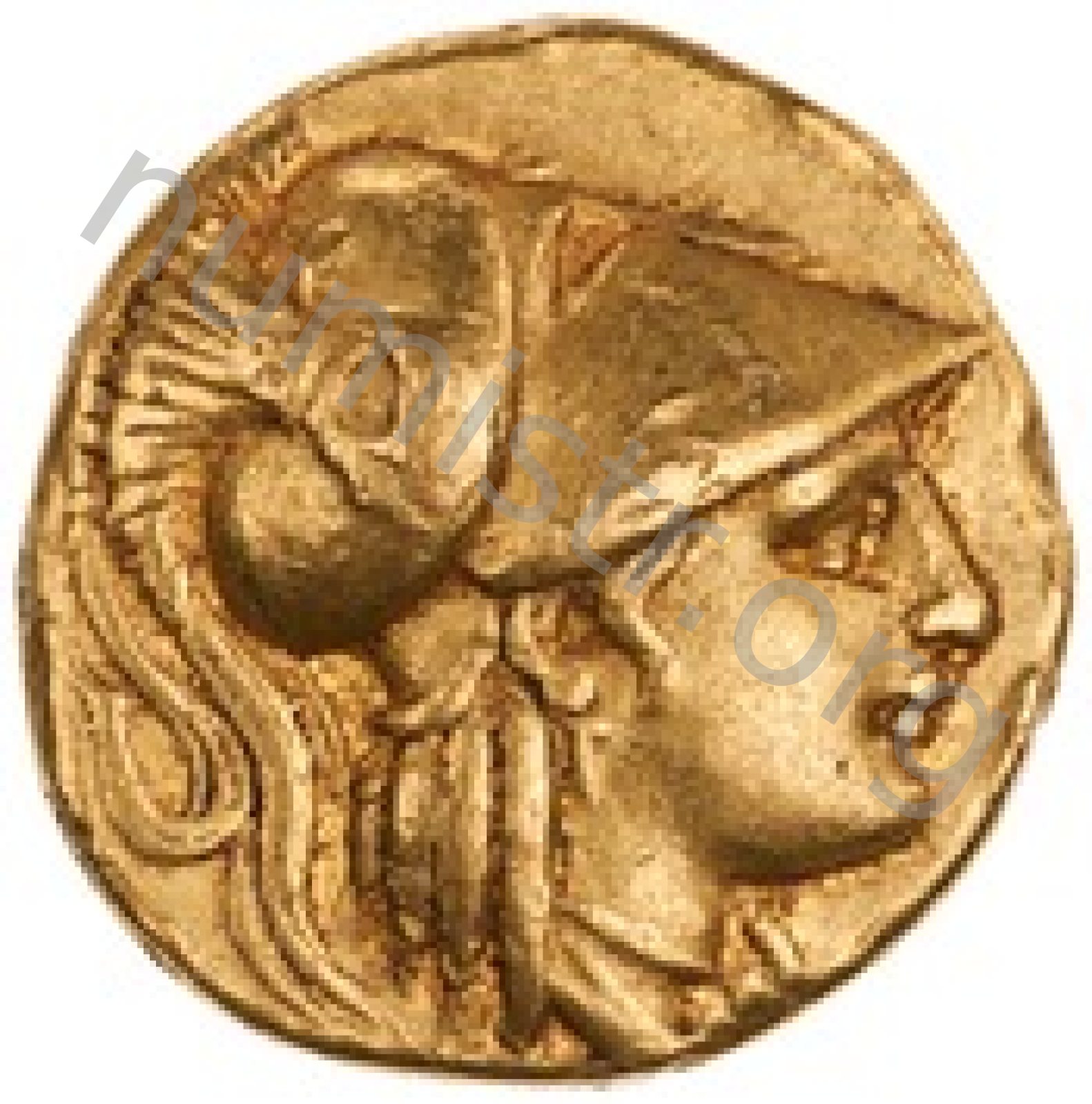 Head of Athena right wearing Corinthian helmet with crest -[en]