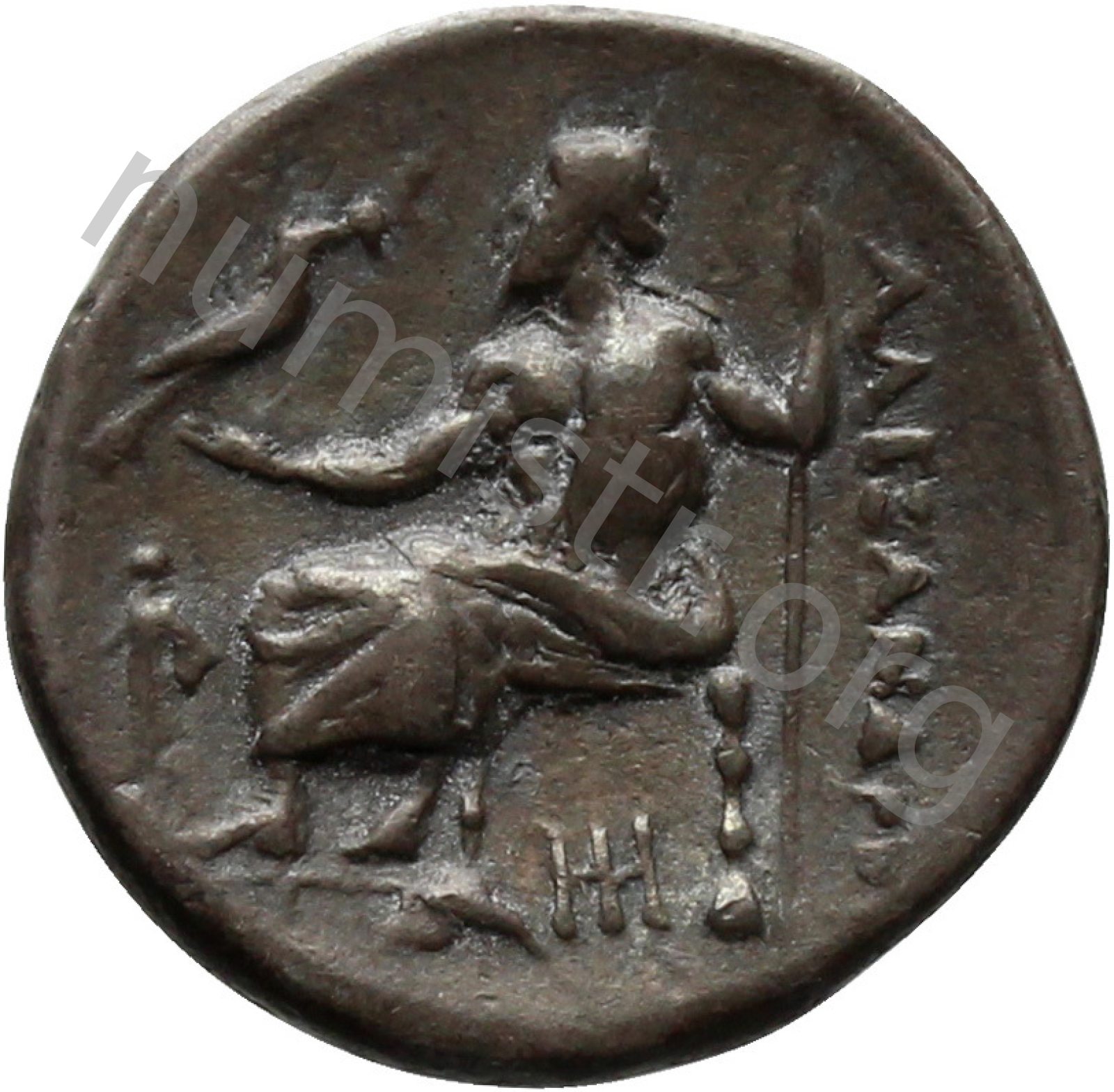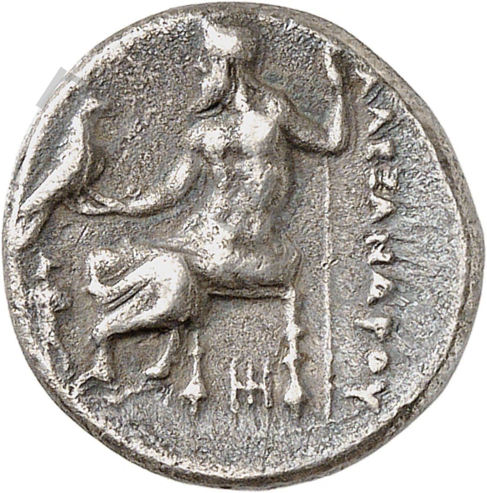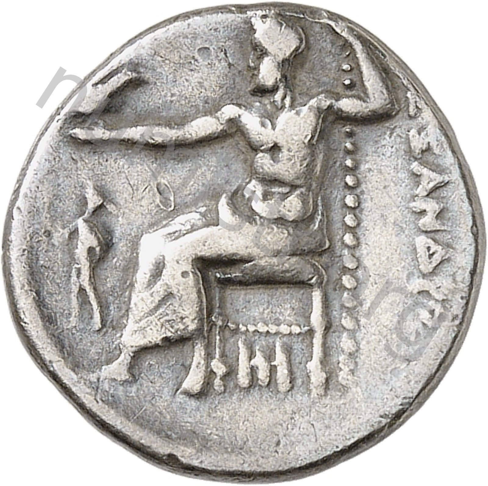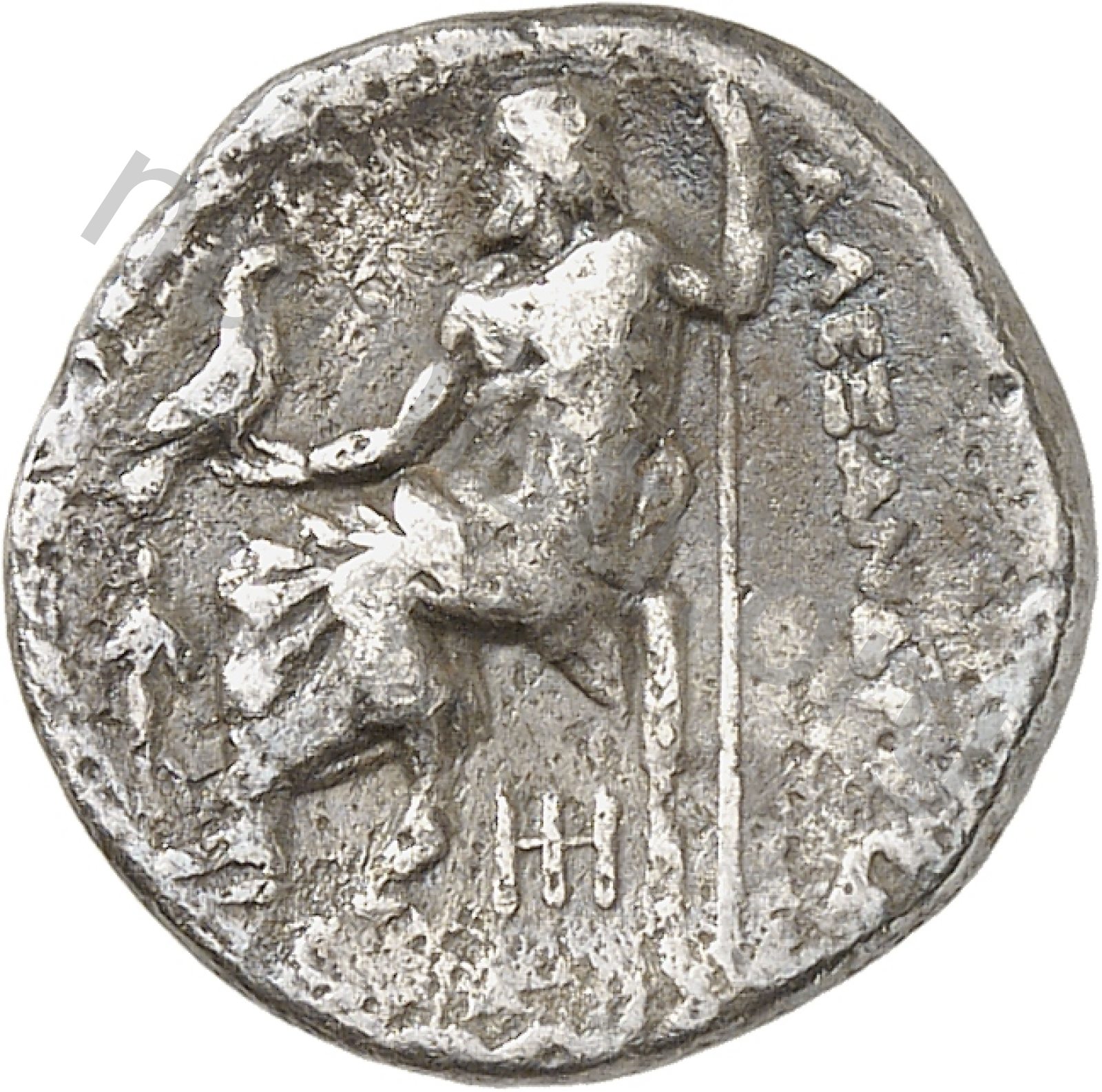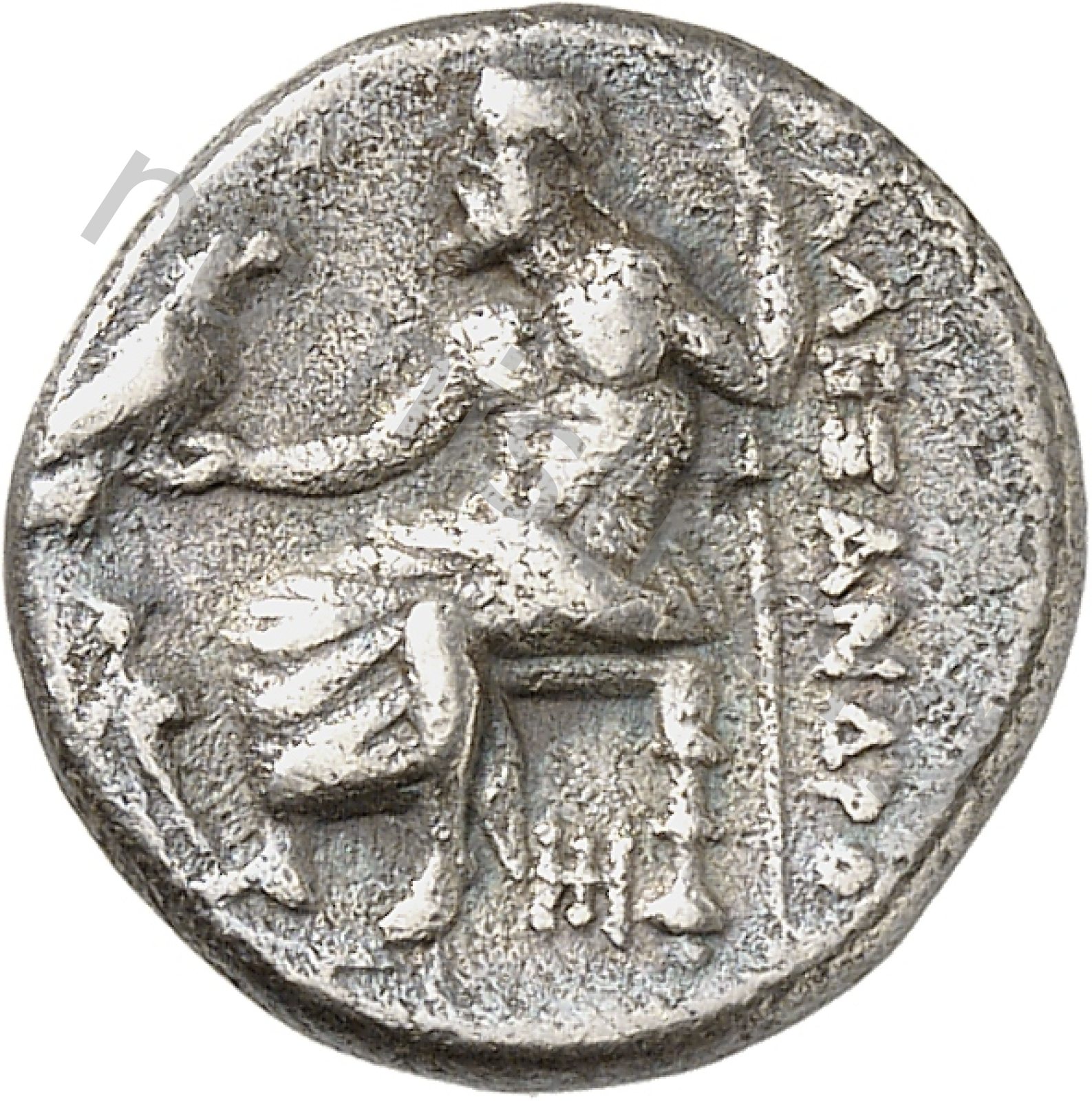 Zeus seated on stool-throne left eagle on outstretched right hand sceptre in left hand -[en]