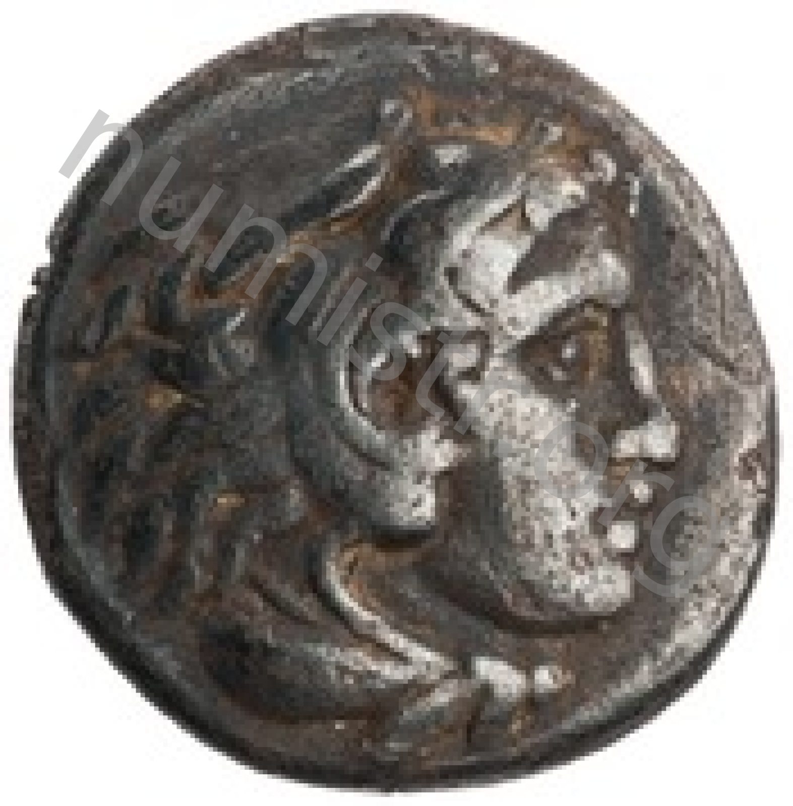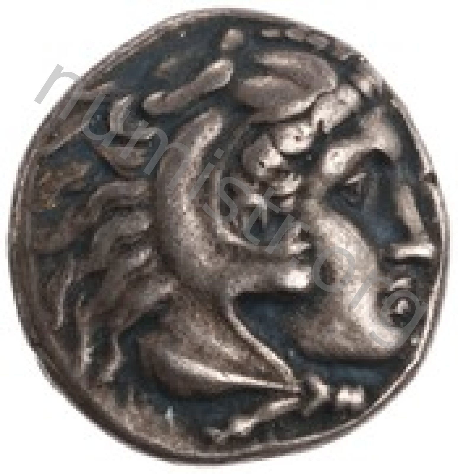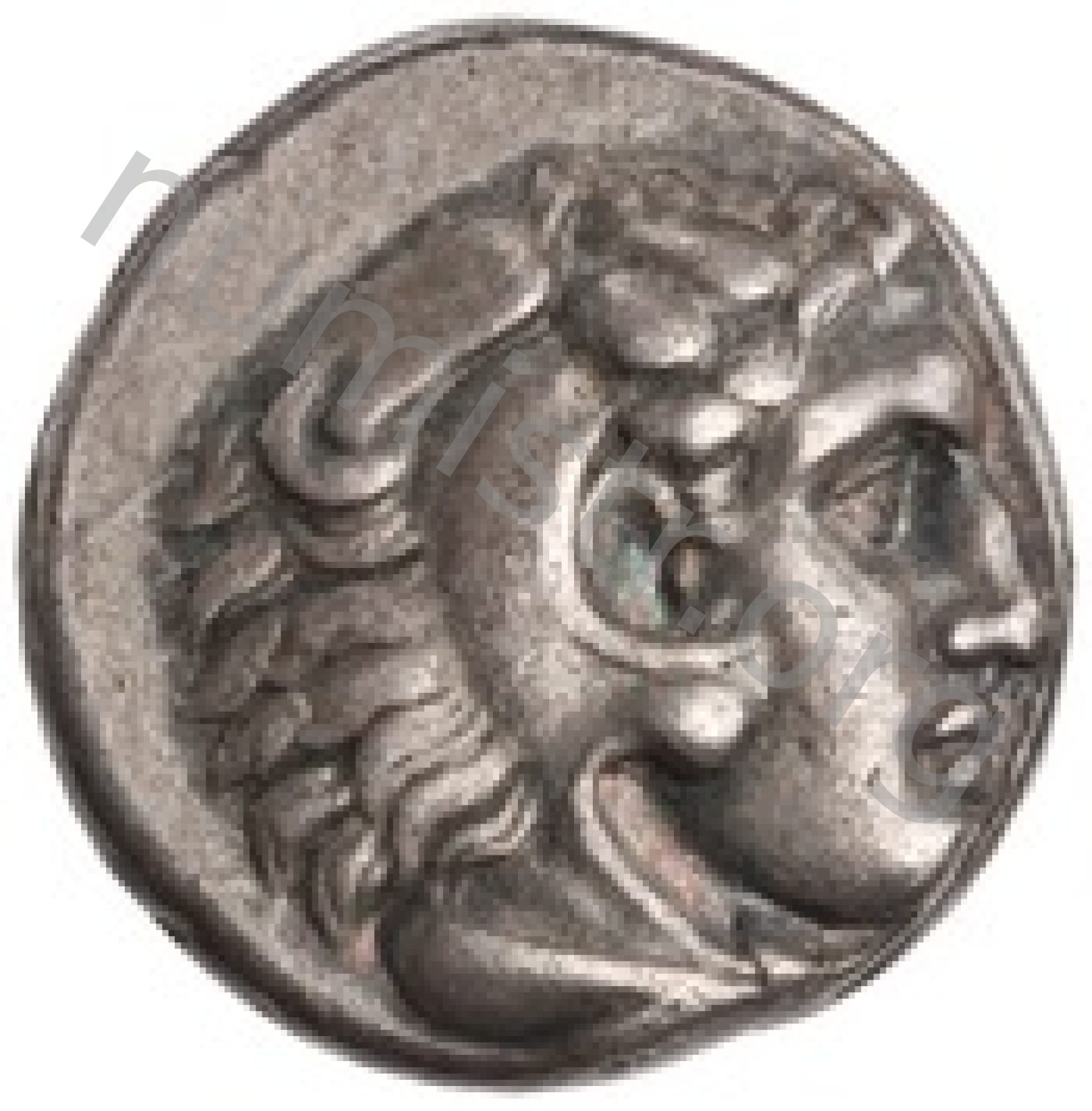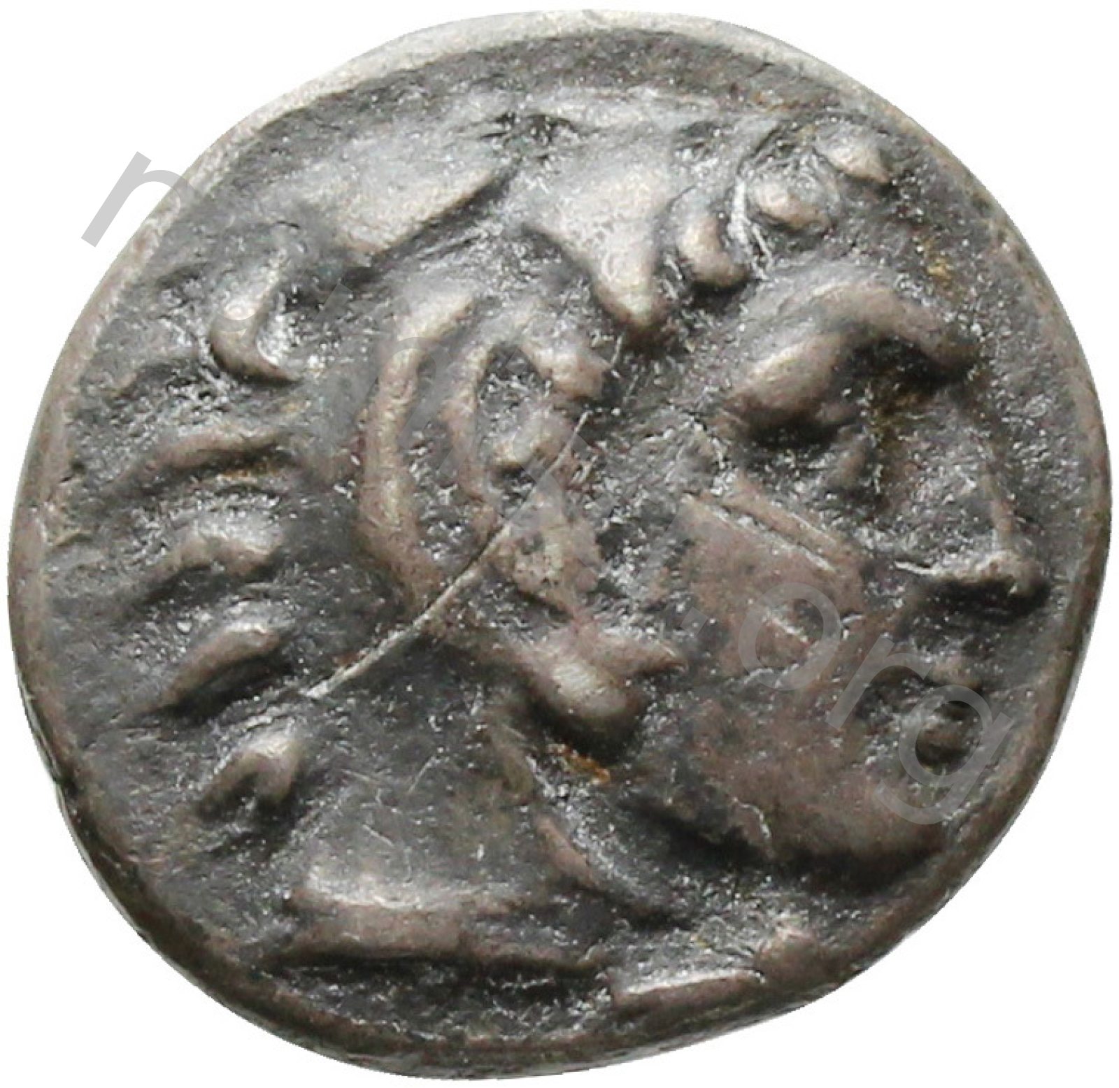 Head of beardless Heracles right wearing lion skin headdress -[en]