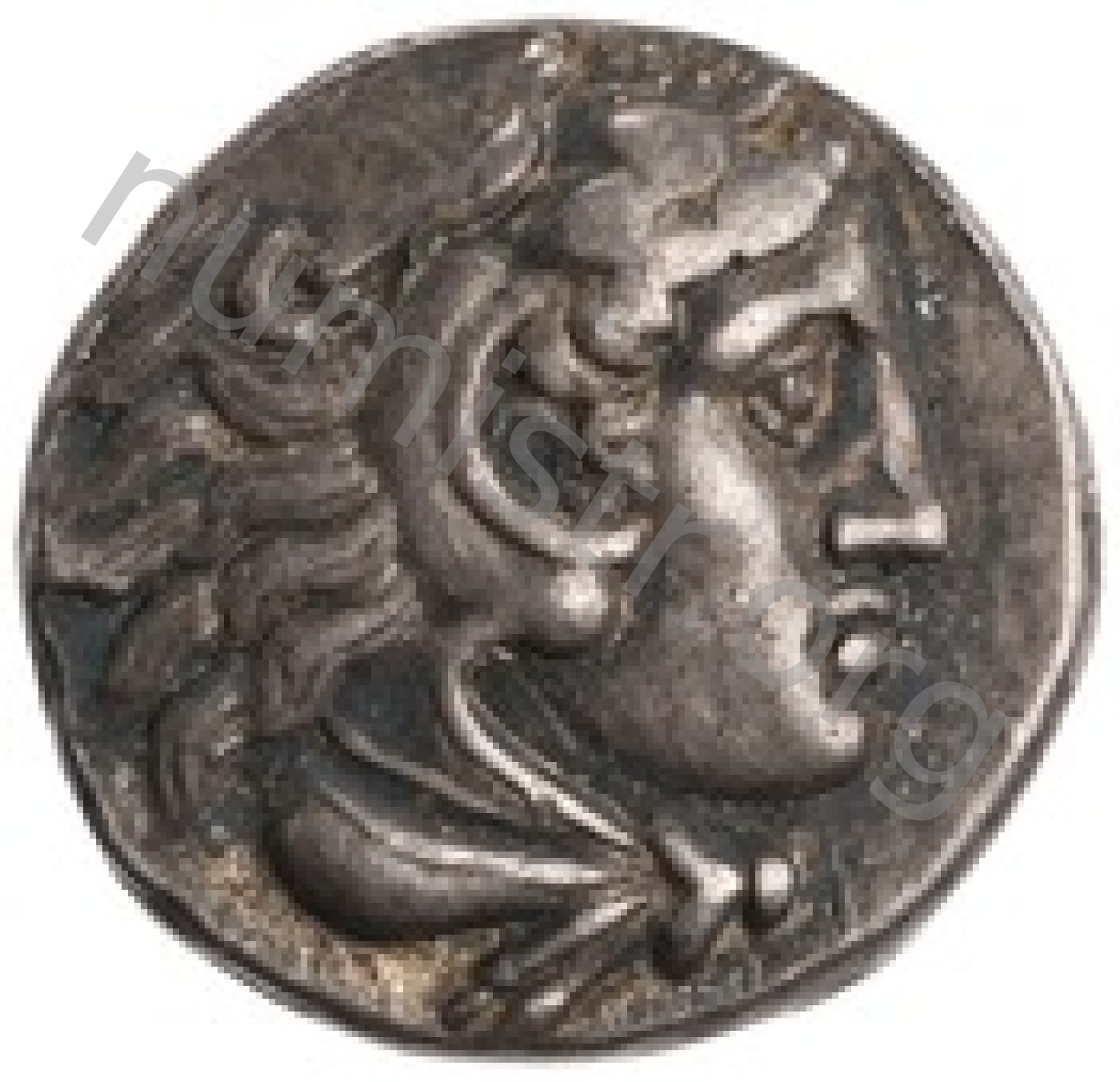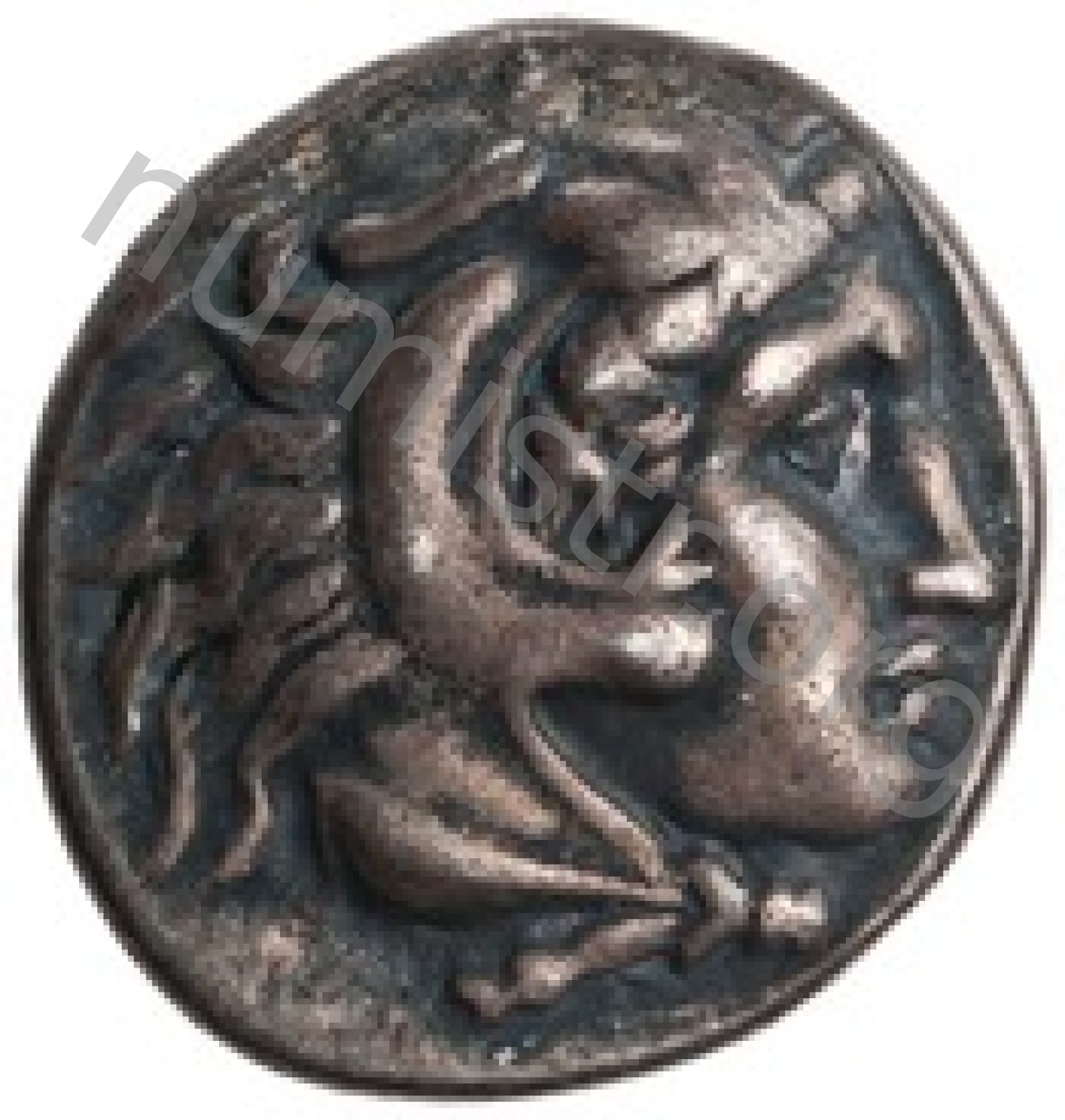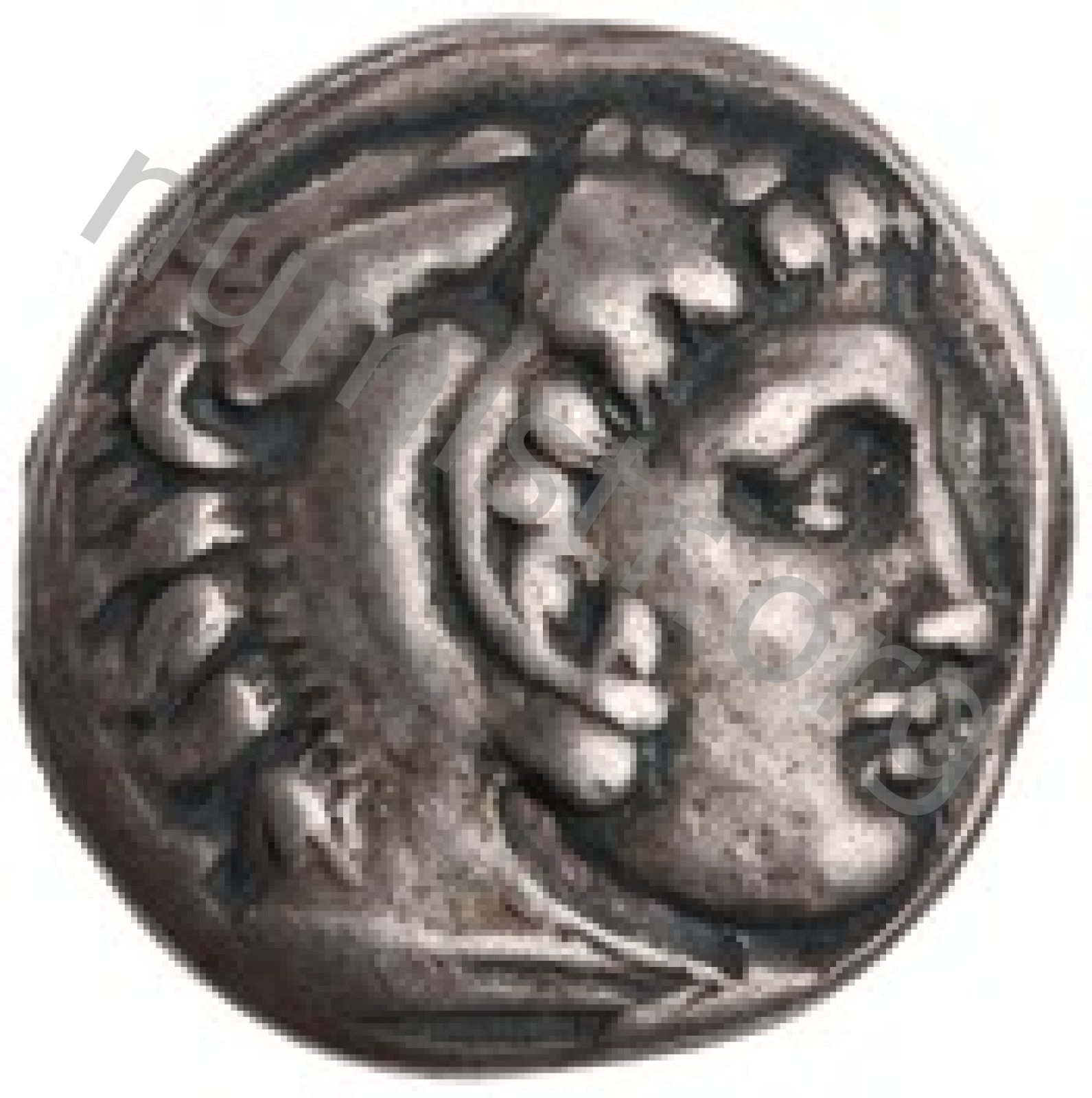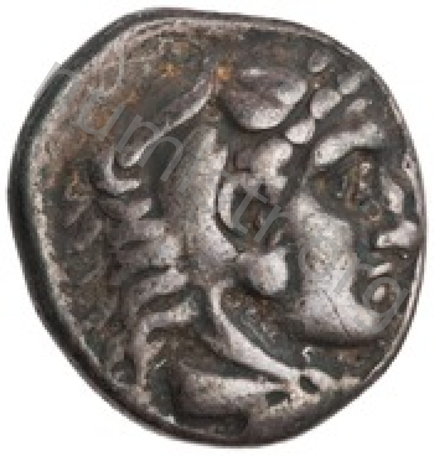 Head of beardless Heracles right wearing lion skin headdress -[en]