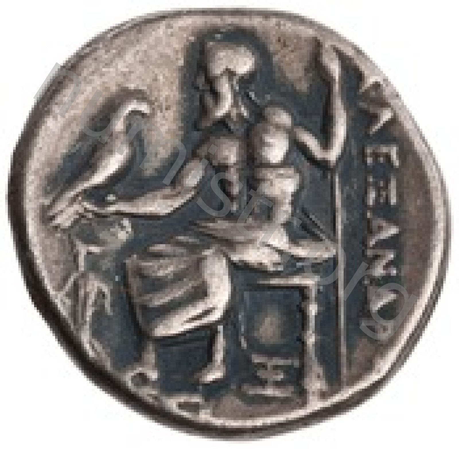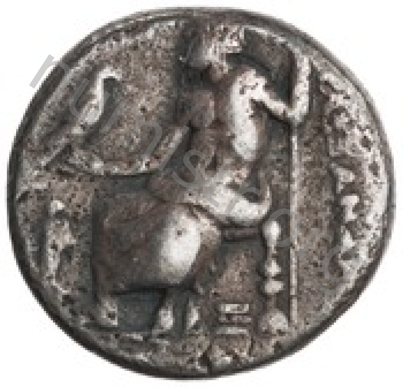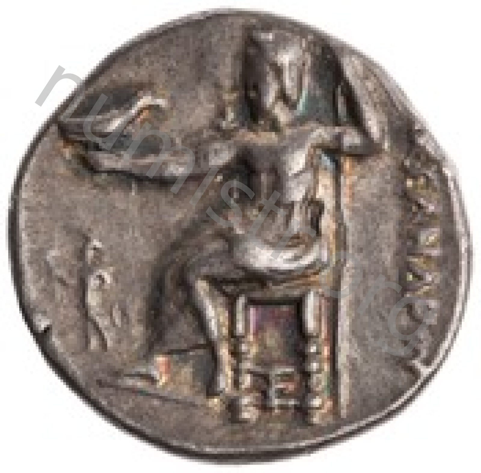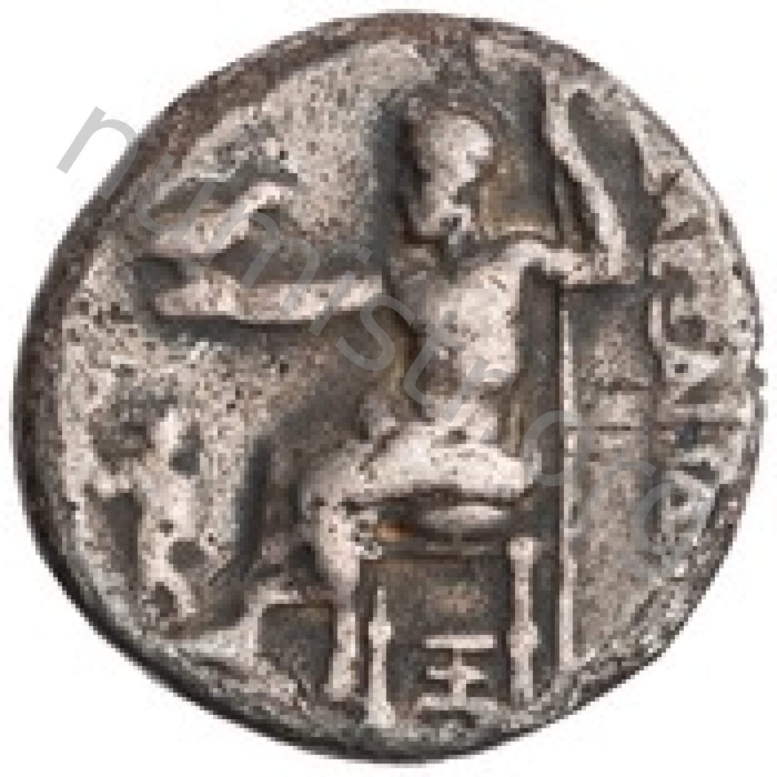 Zeus tabure-tahtta oturuyor sol elinde kartal sağ elinde asa var.