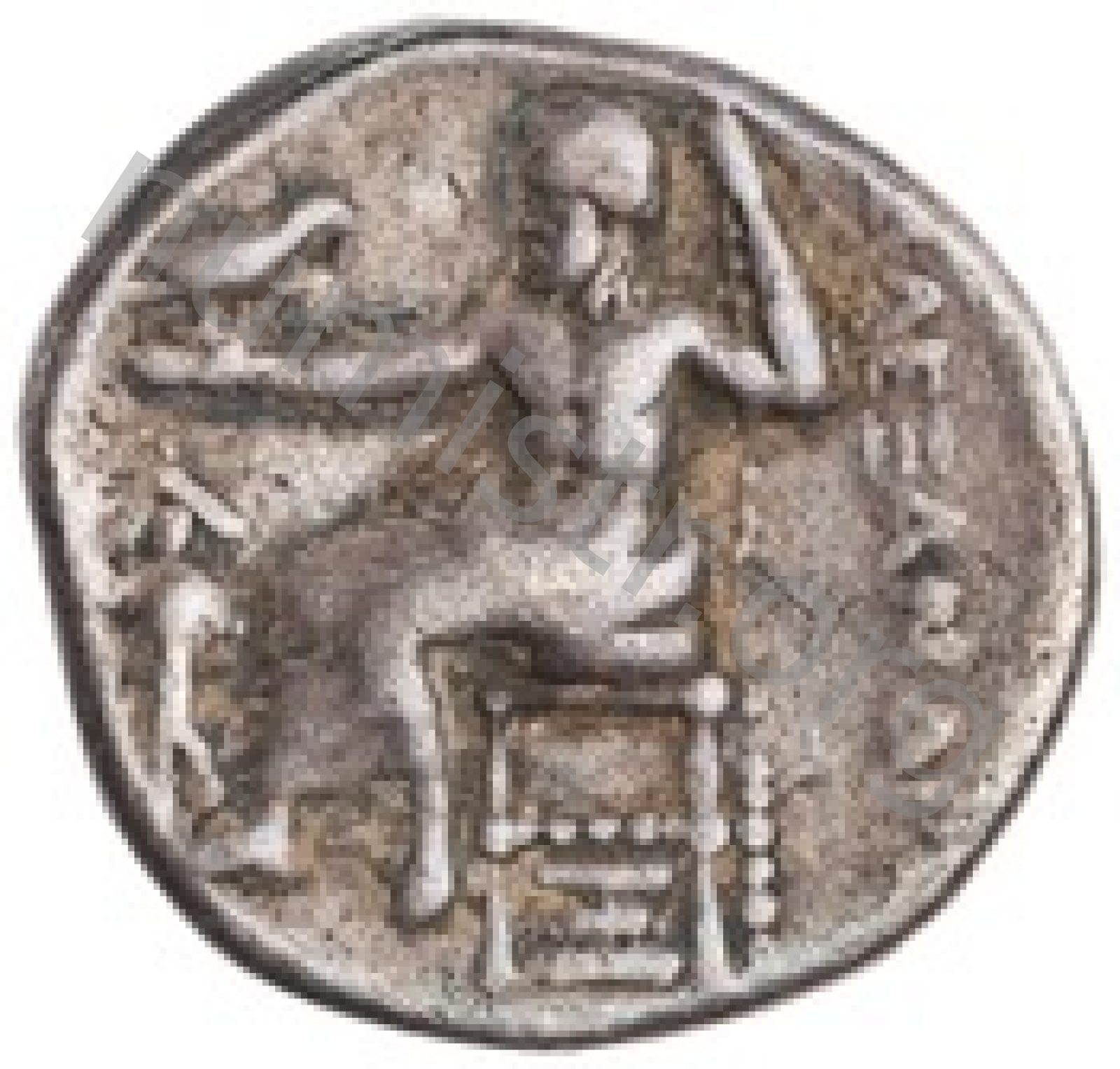 Zeus seated on stool-throne left eagle on outstretched right hand sceptre in left hand -[en]