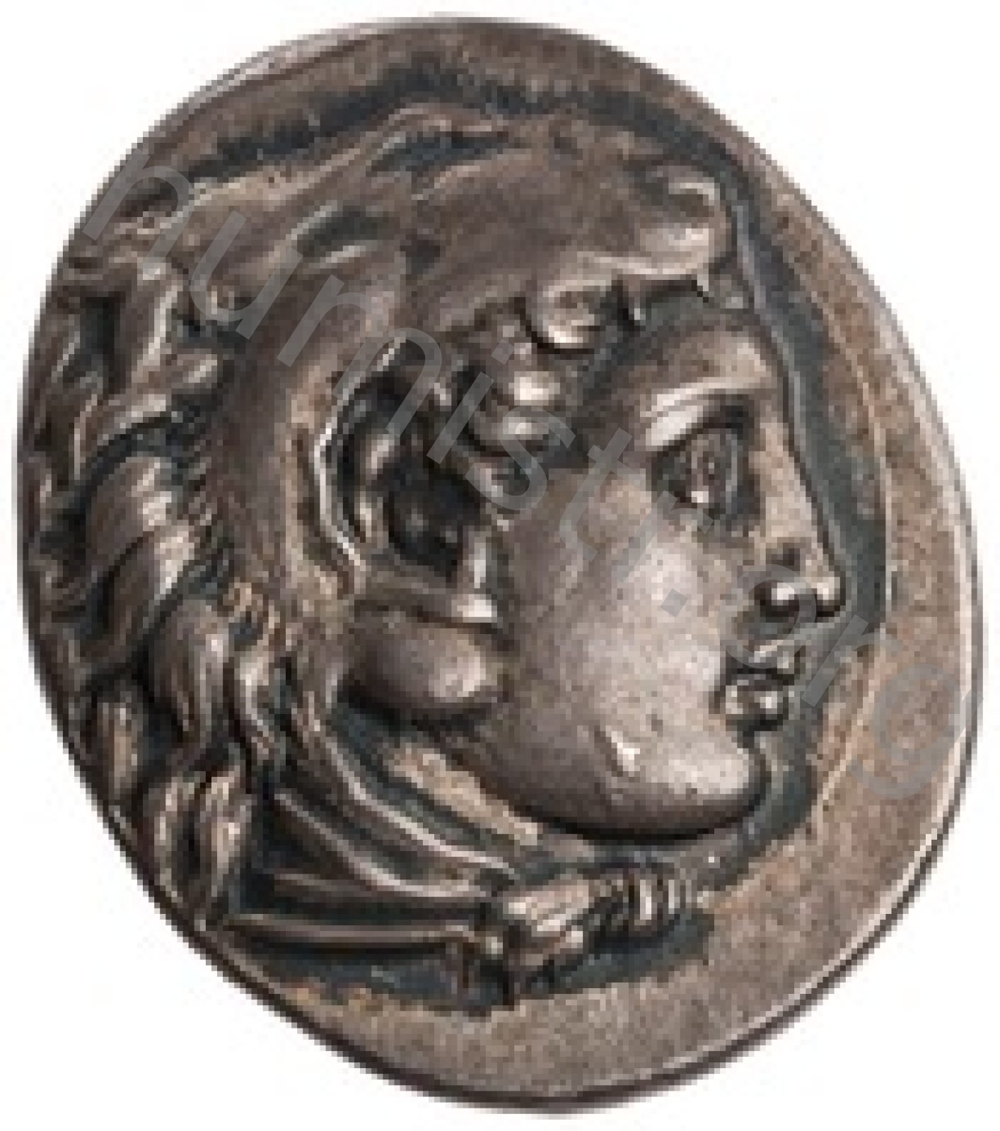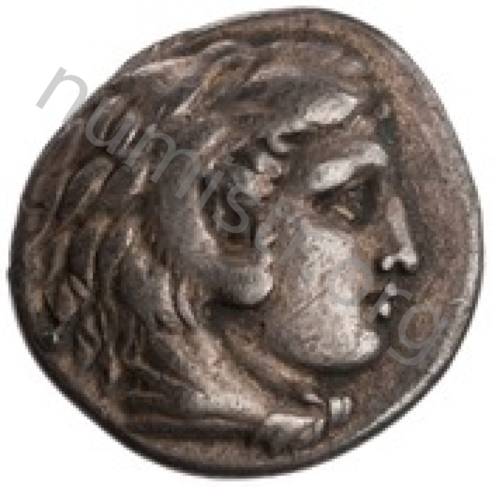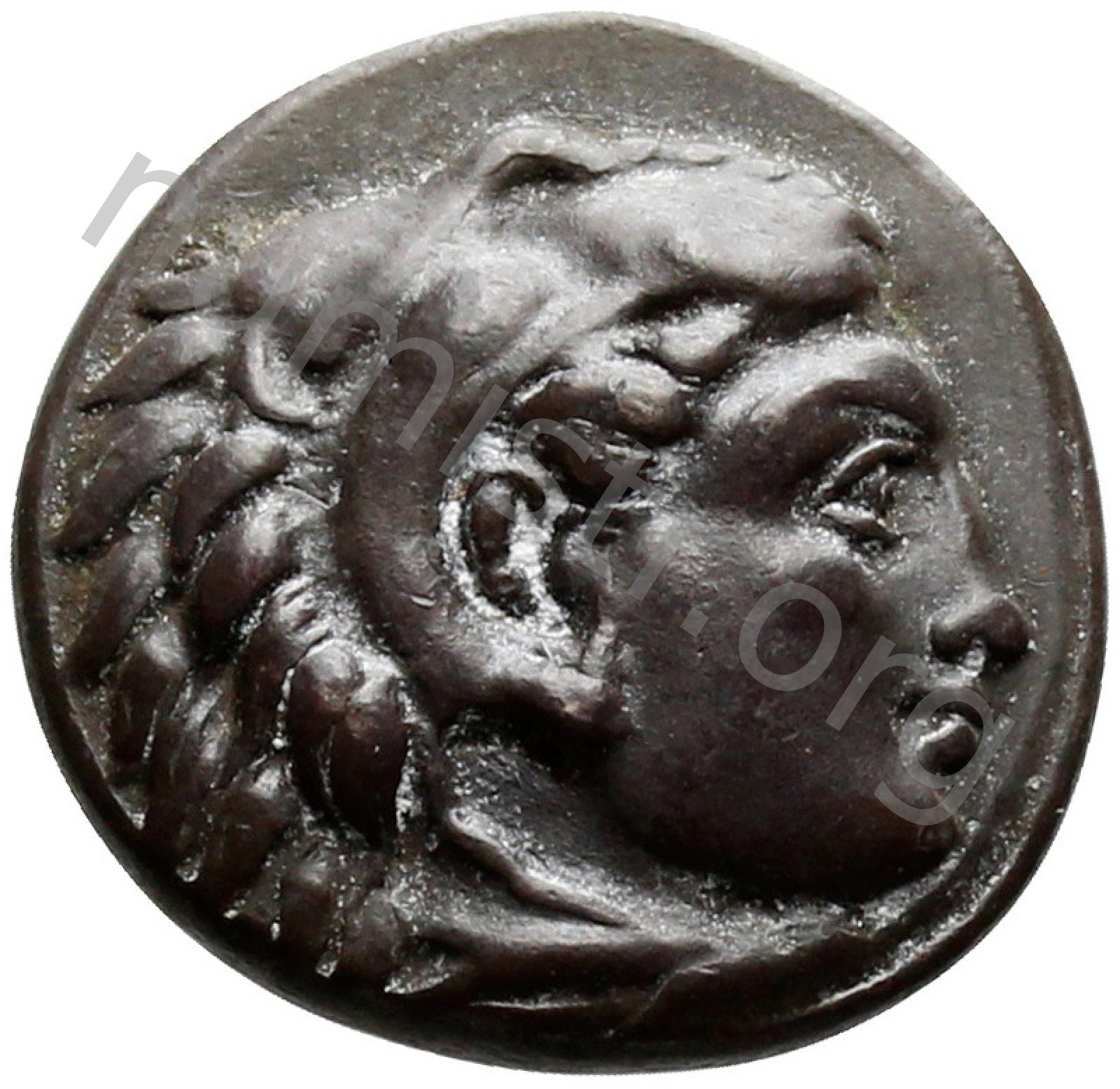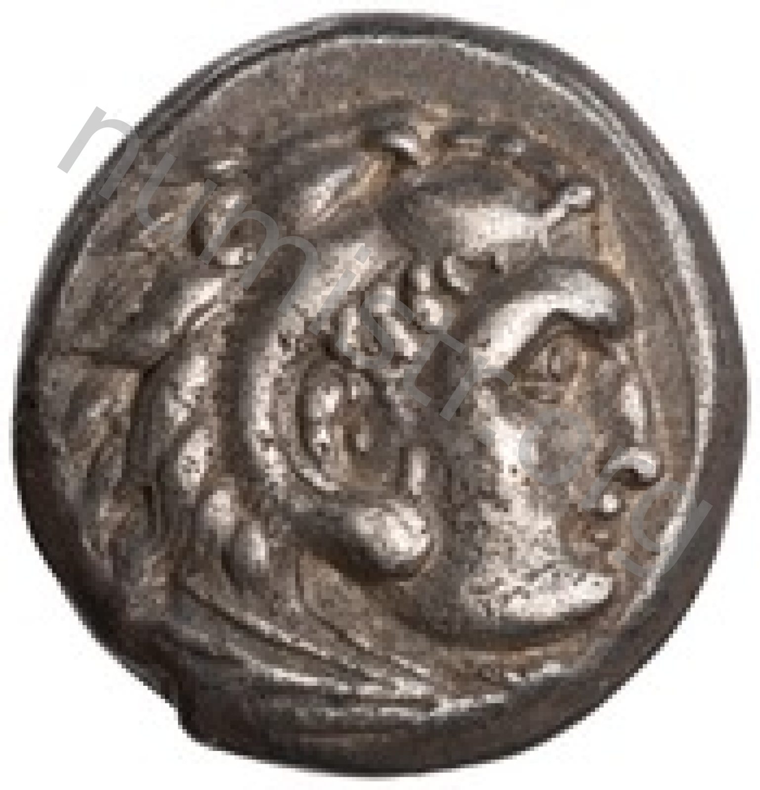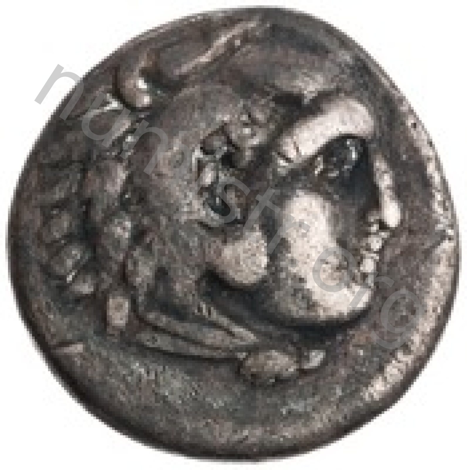 Head of beardless Heracles right wearing lion skin headdress -[en]