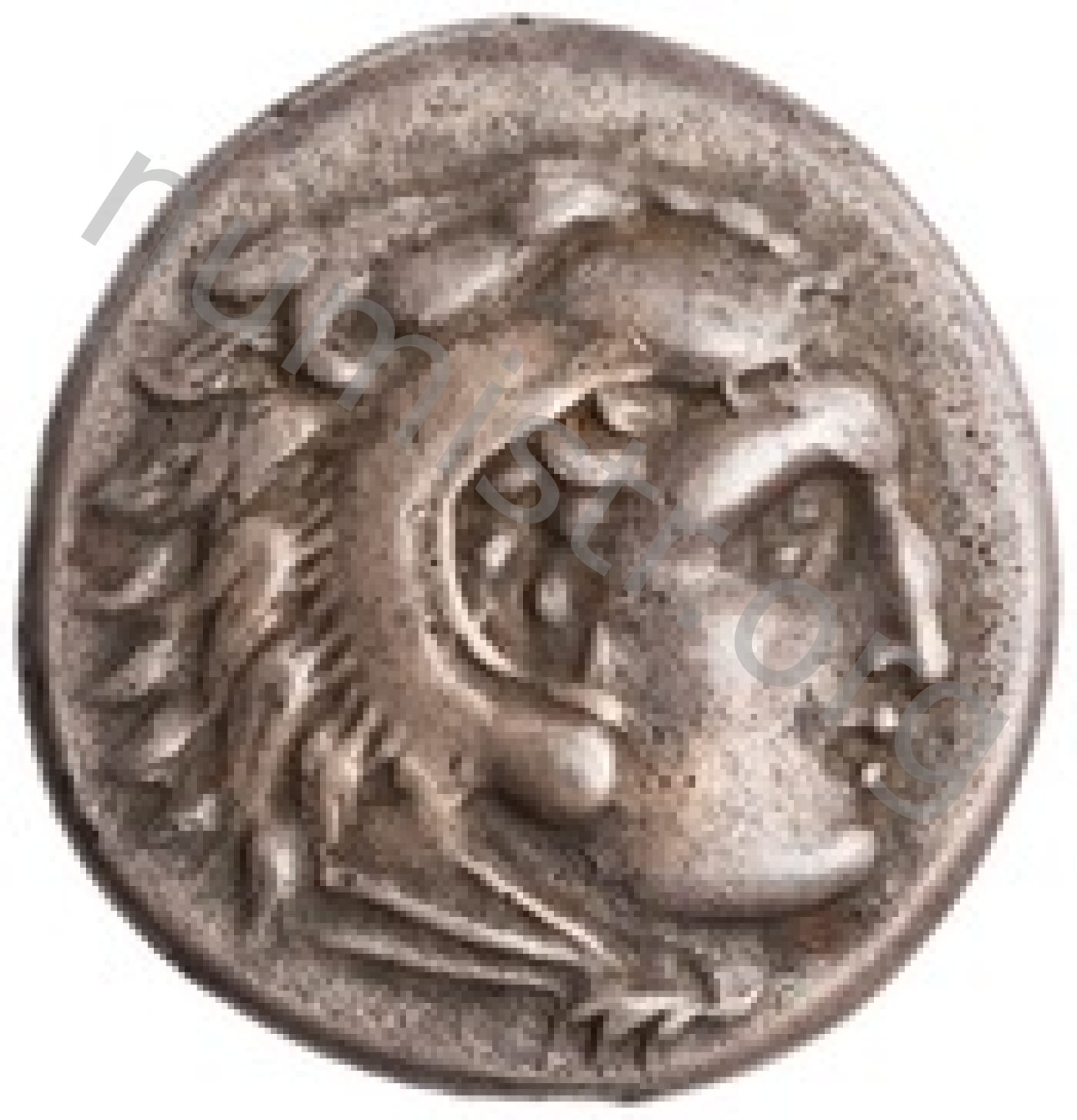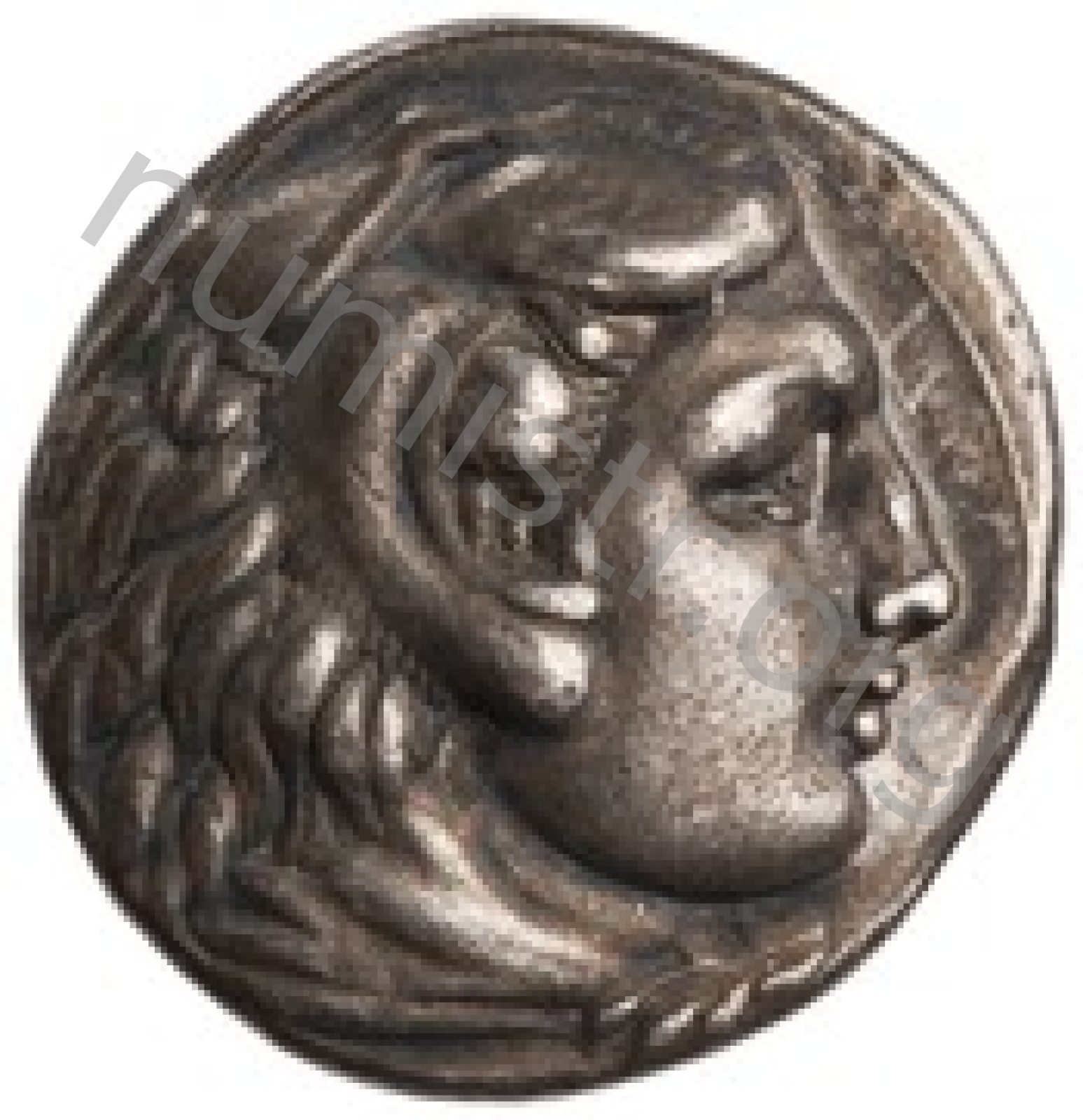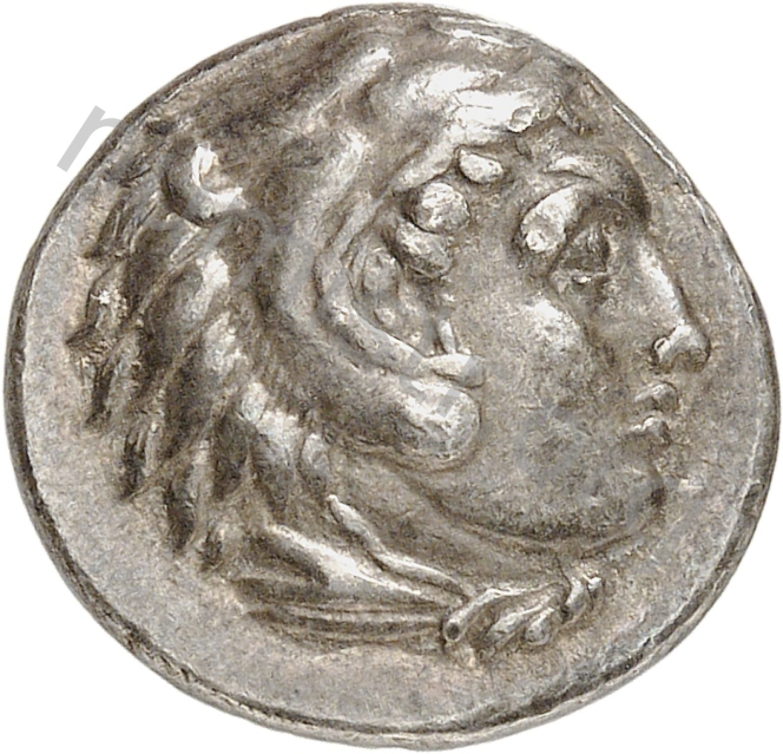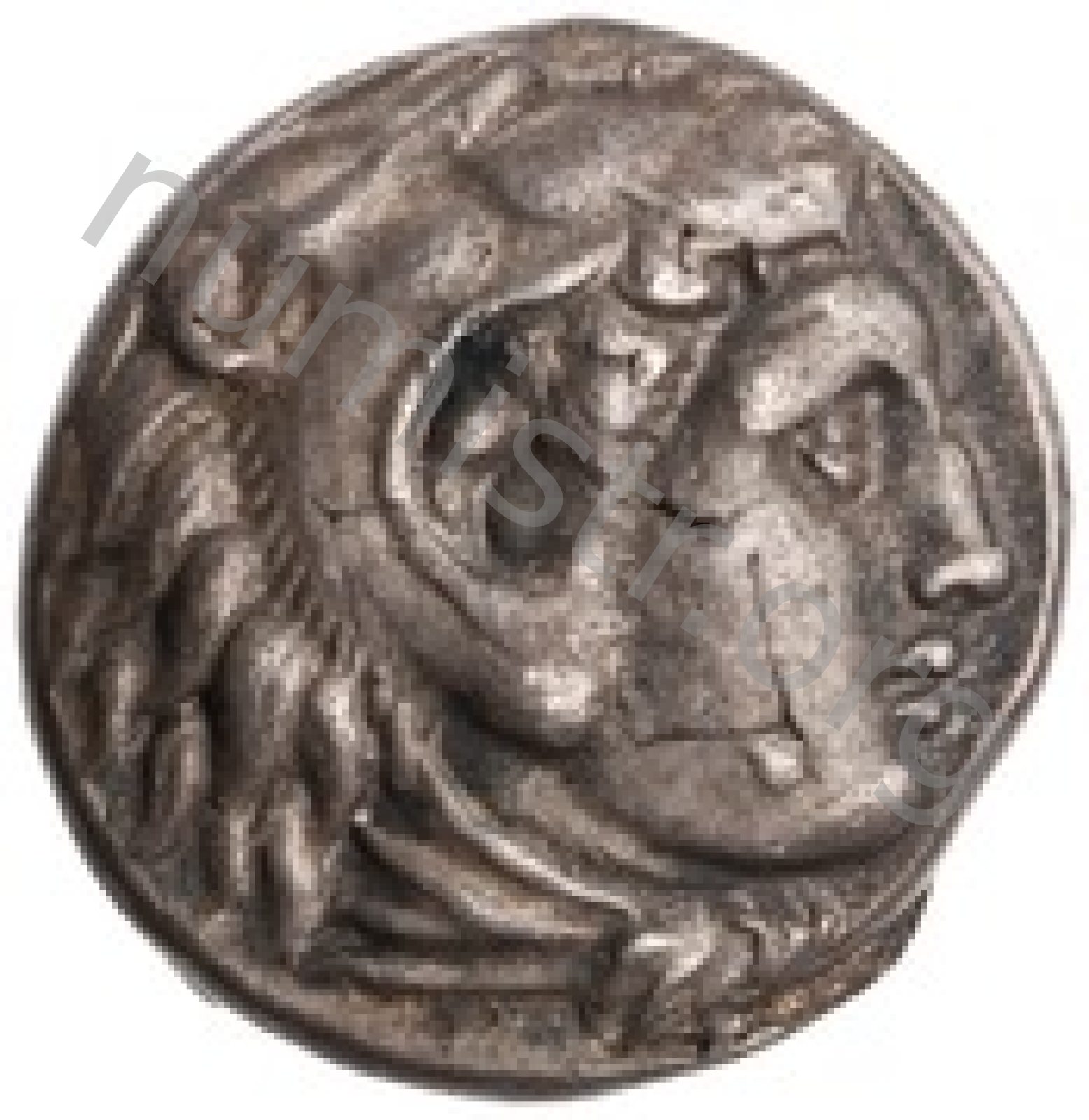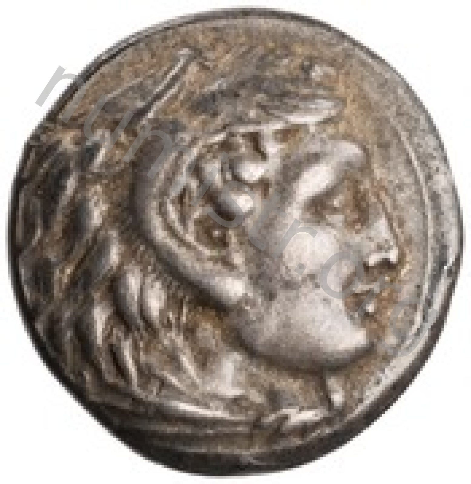 Head of beardless Heracles right wearing lion skin headdress -[en]