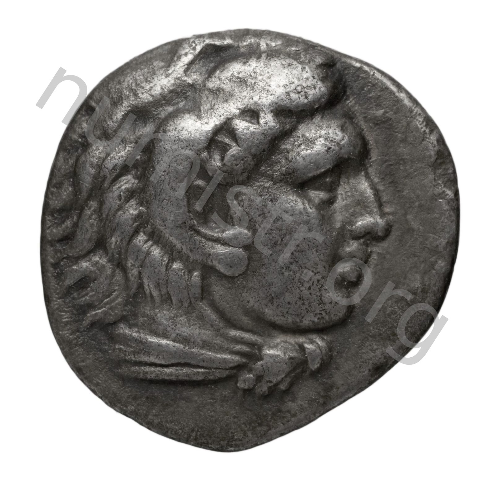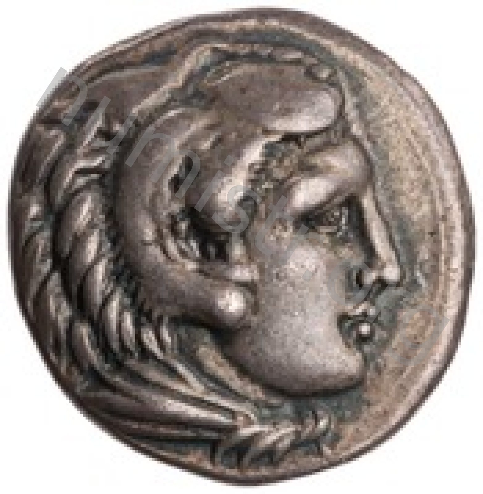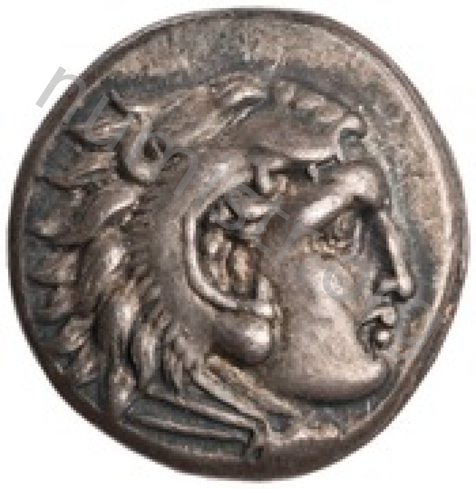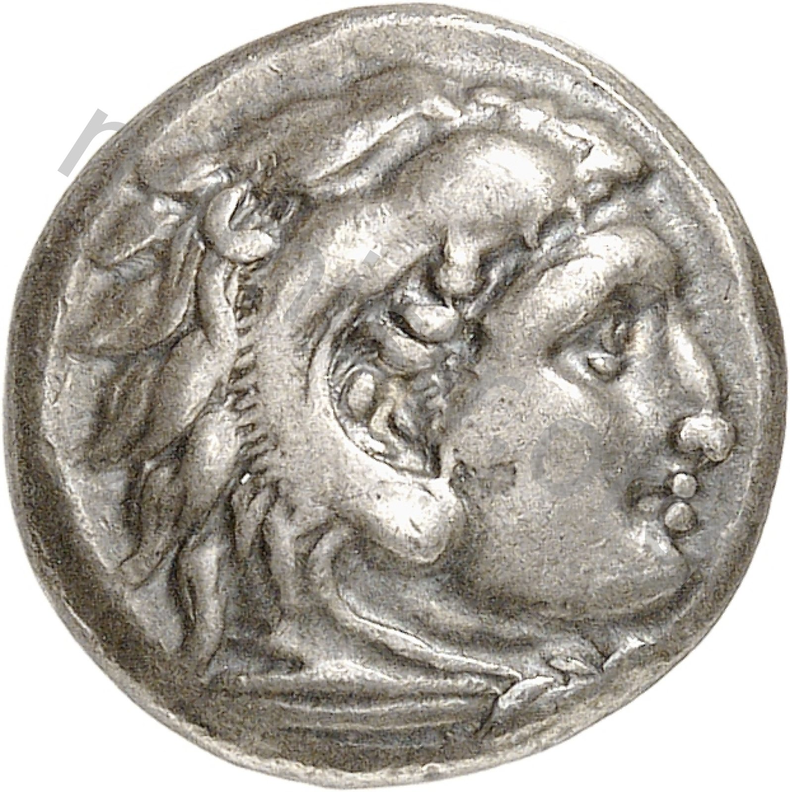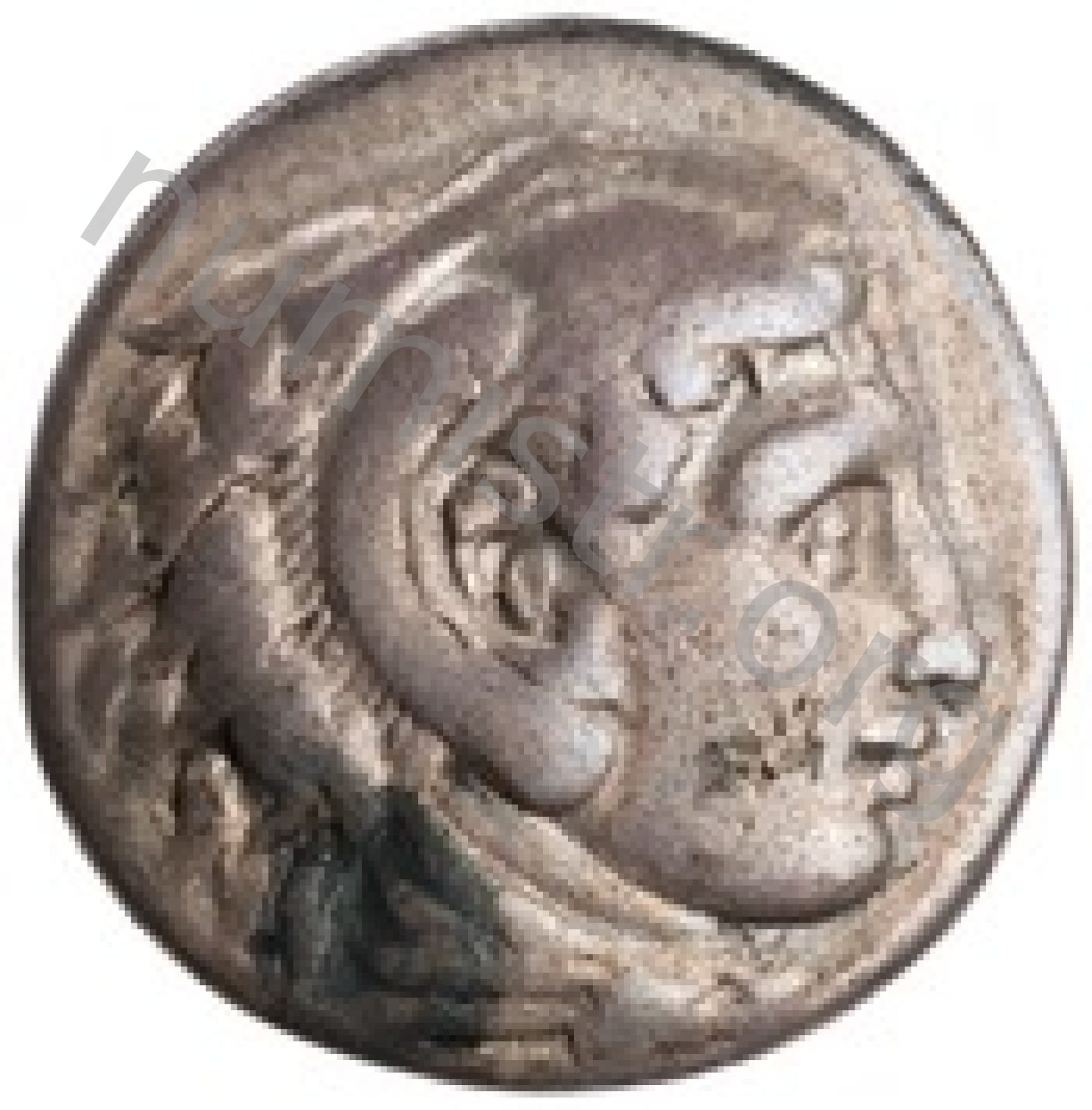 Head of beardless Heracles right wearing lion skin headdress -[en]