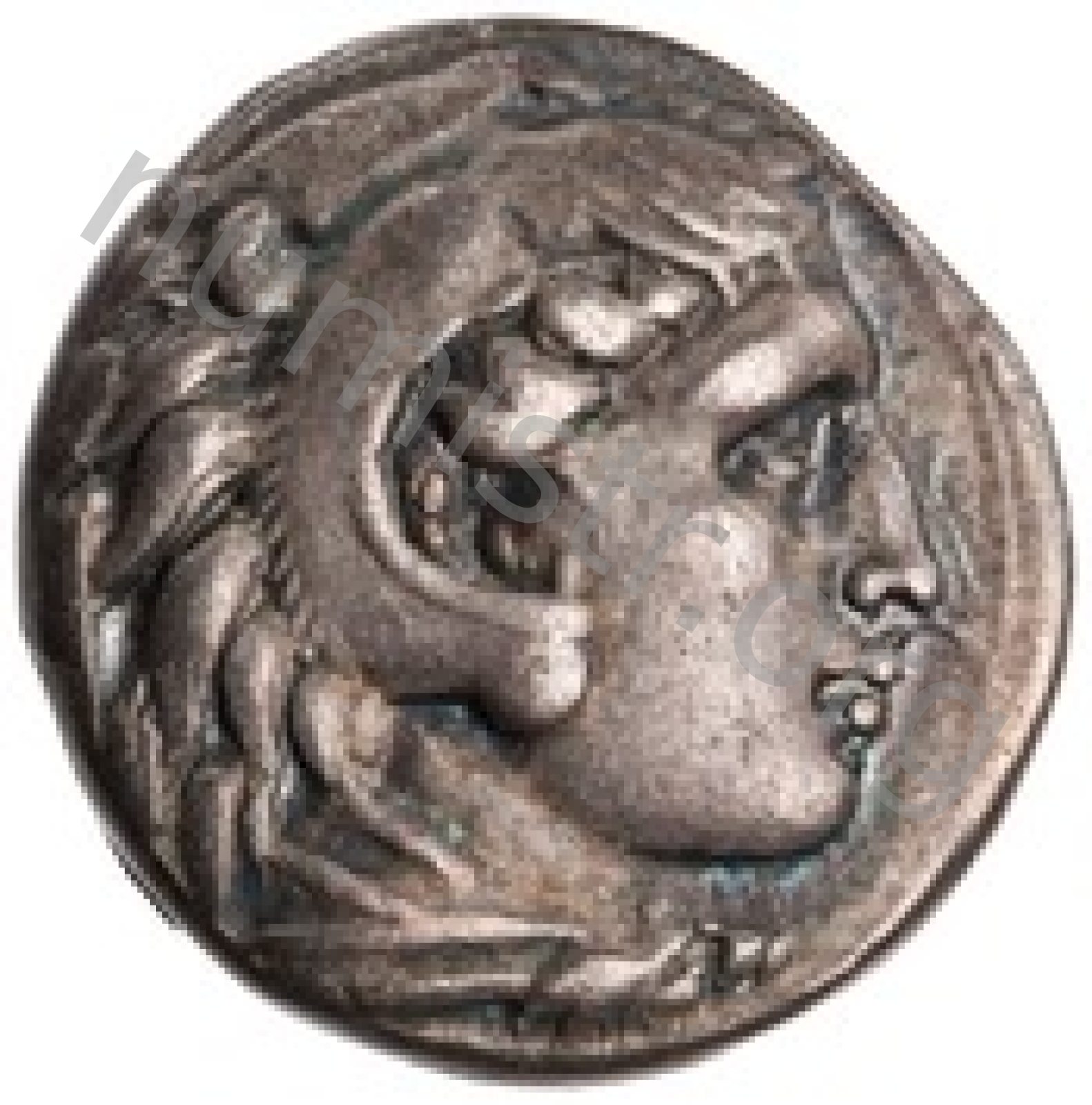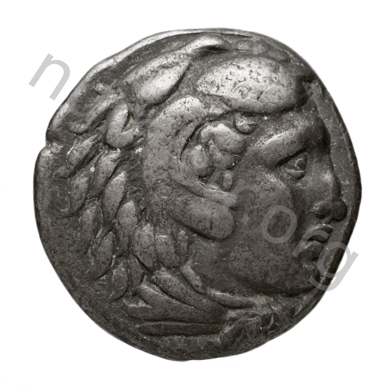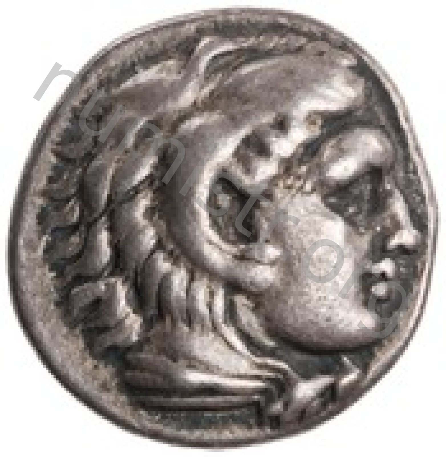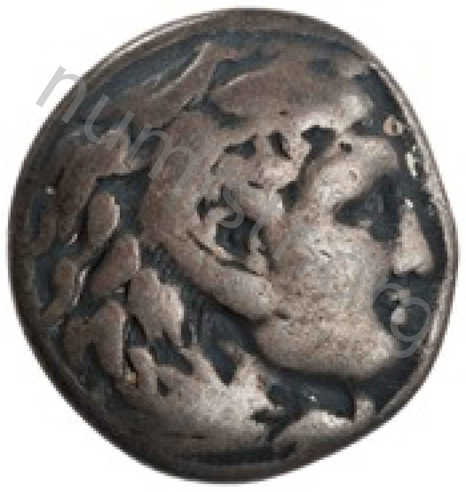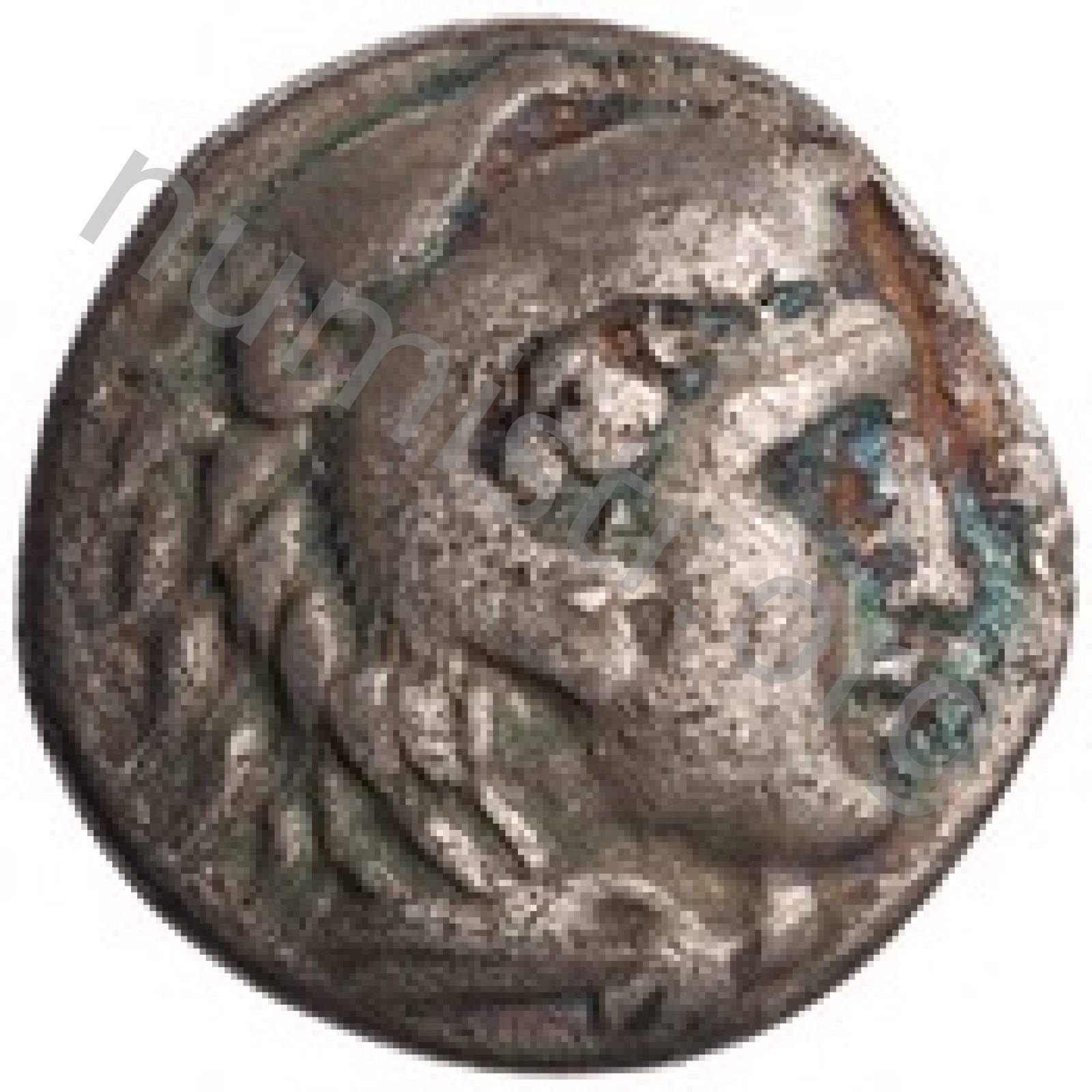 Head of beardless Heracles right wearing lion skin headdress -[en]