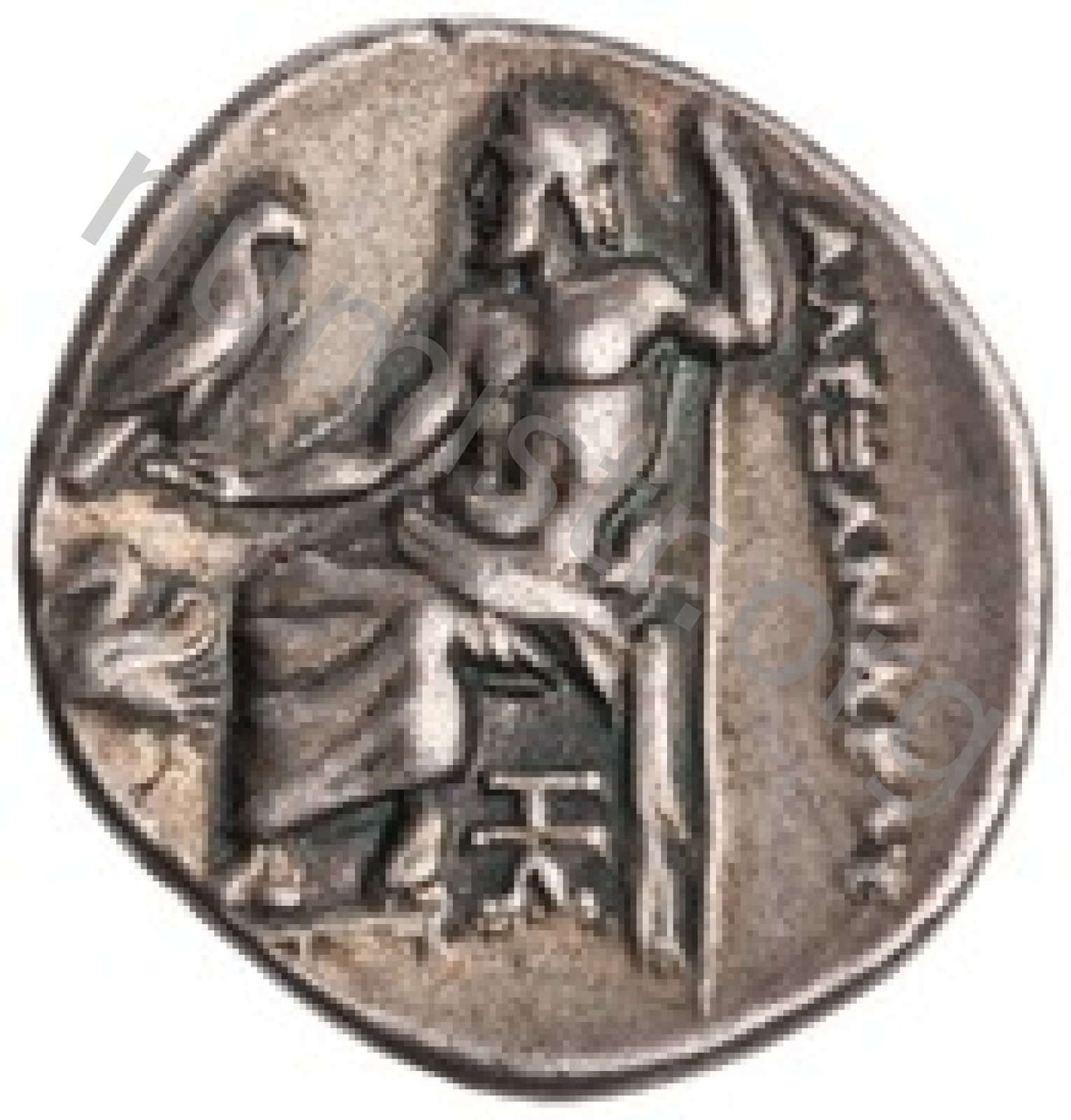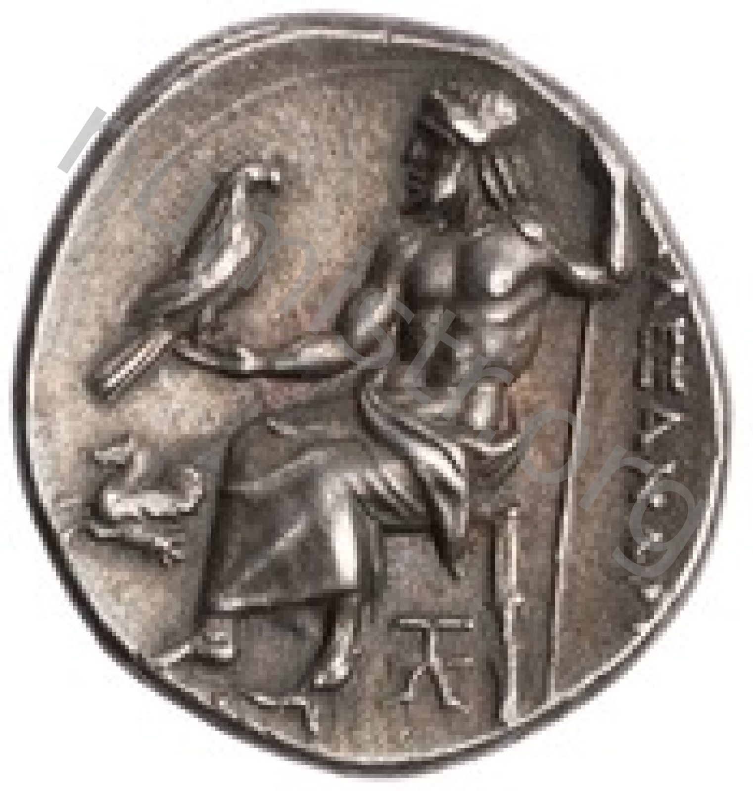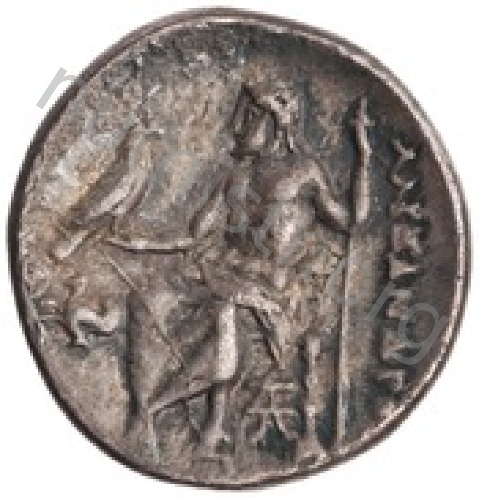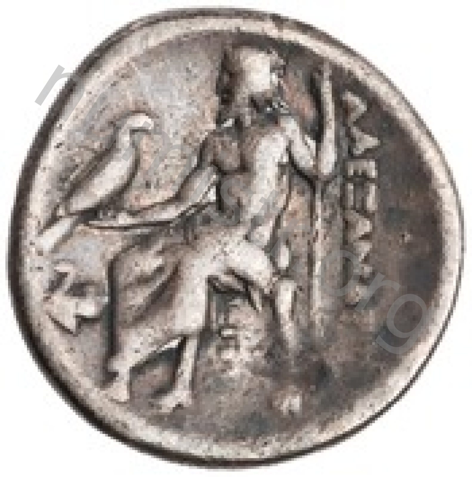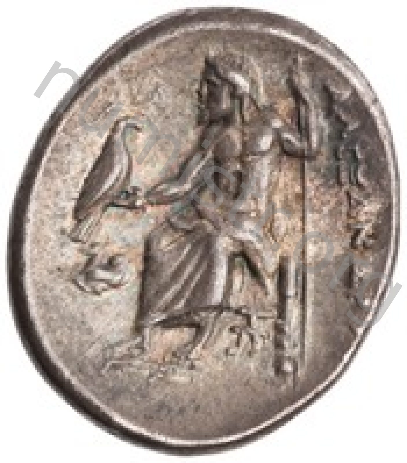 Zeus tabure-tahtta oturuyor sol elinde kartal sağ elinde asa var.