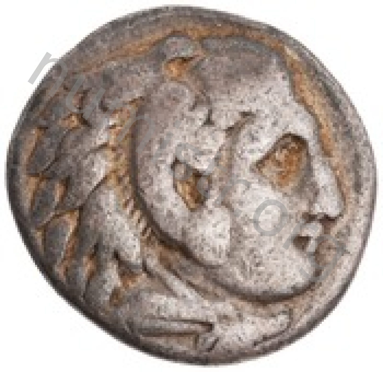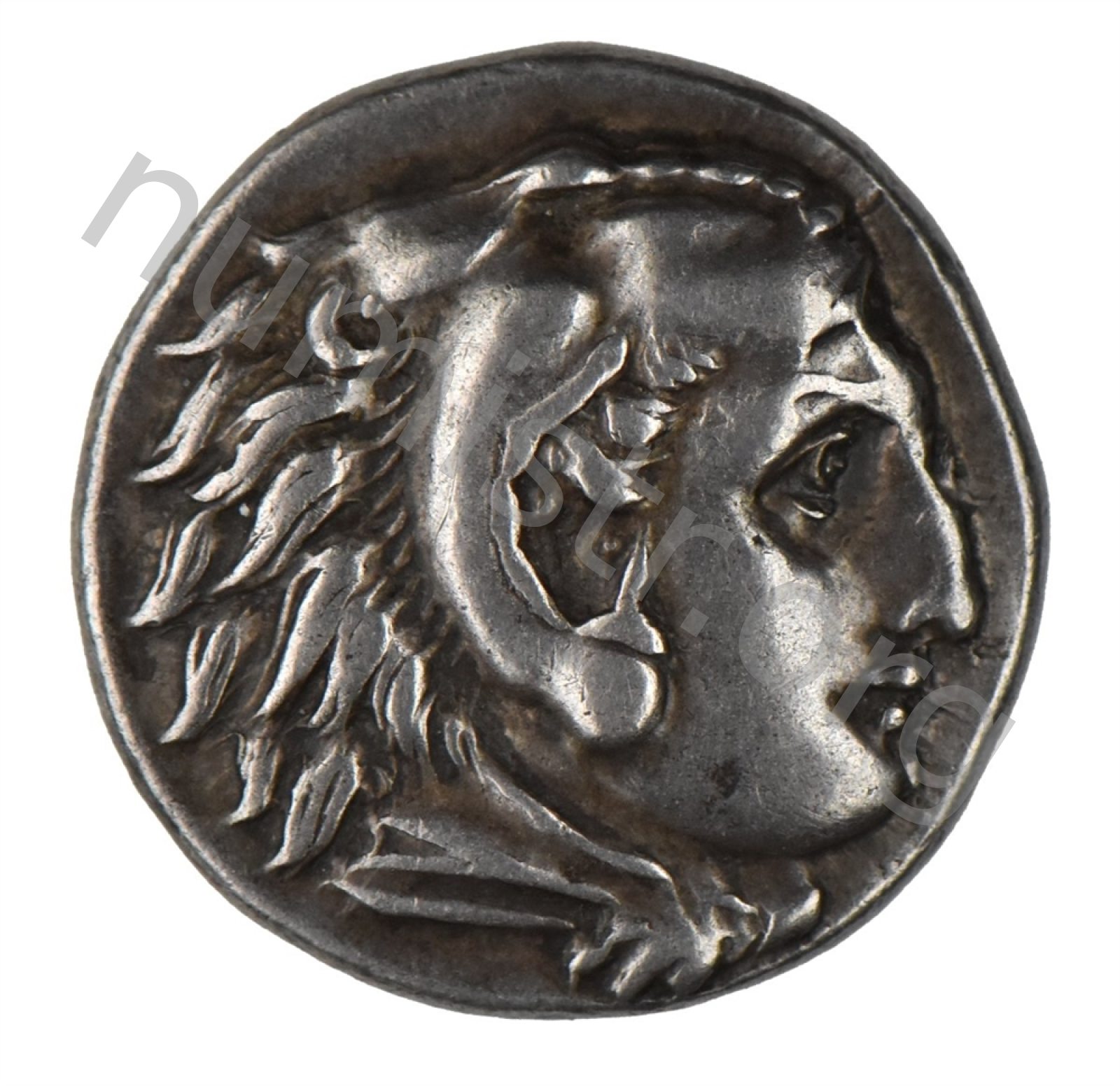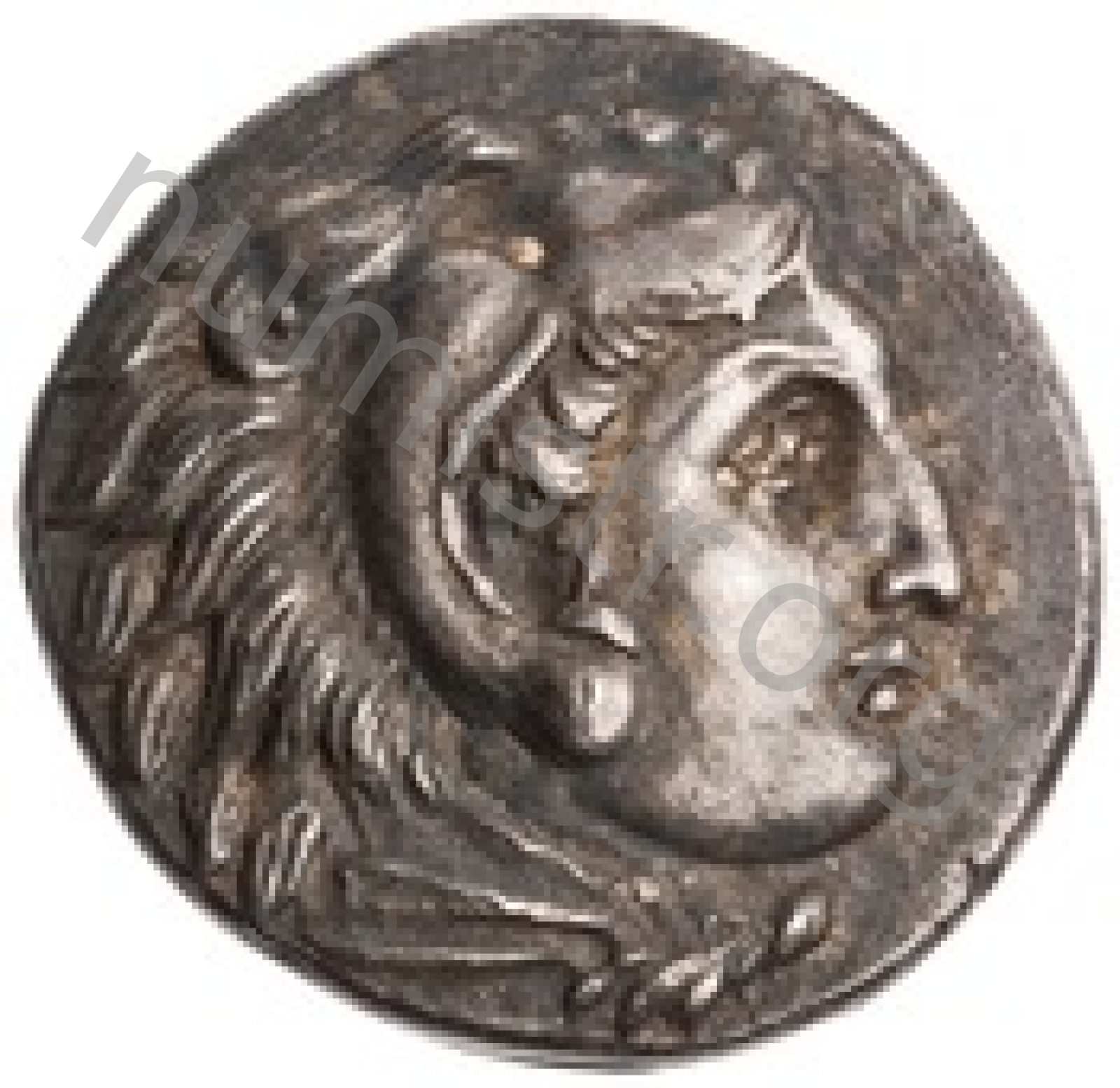 Head of beardless Heracles right wearing lion skin headdress -[en]