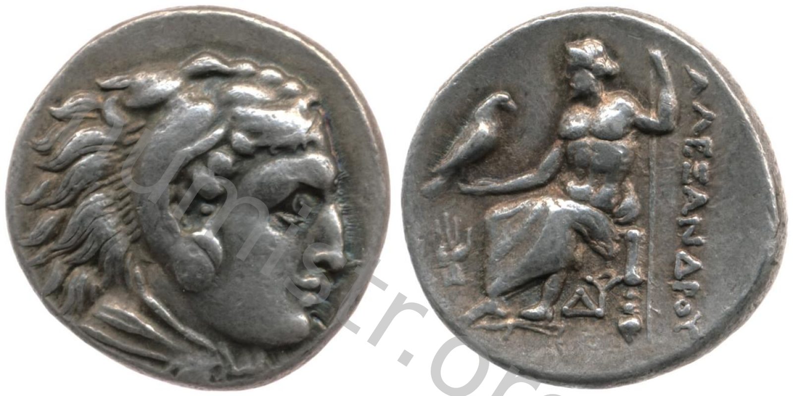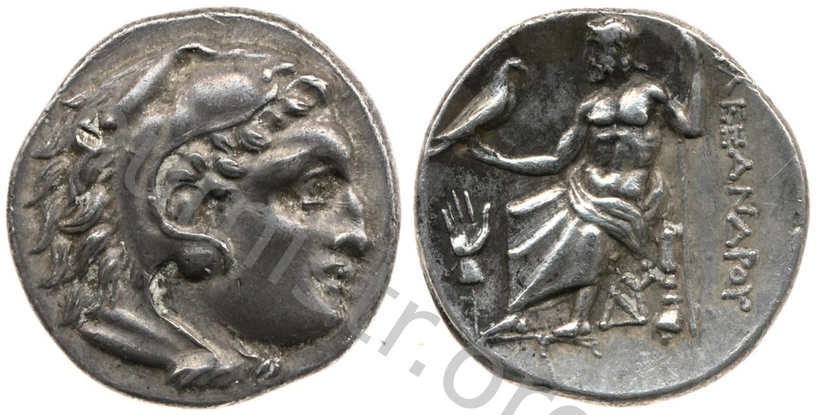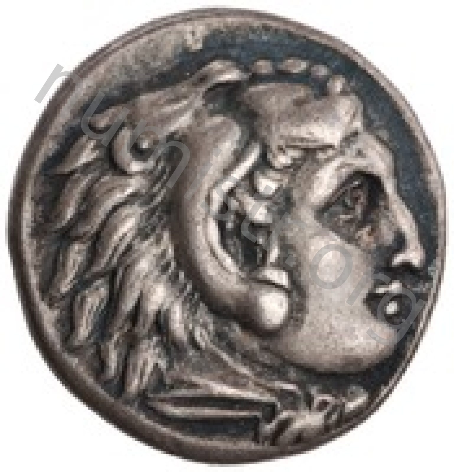 Head of beardless Heracles right wearing lion skin headdress -[en]