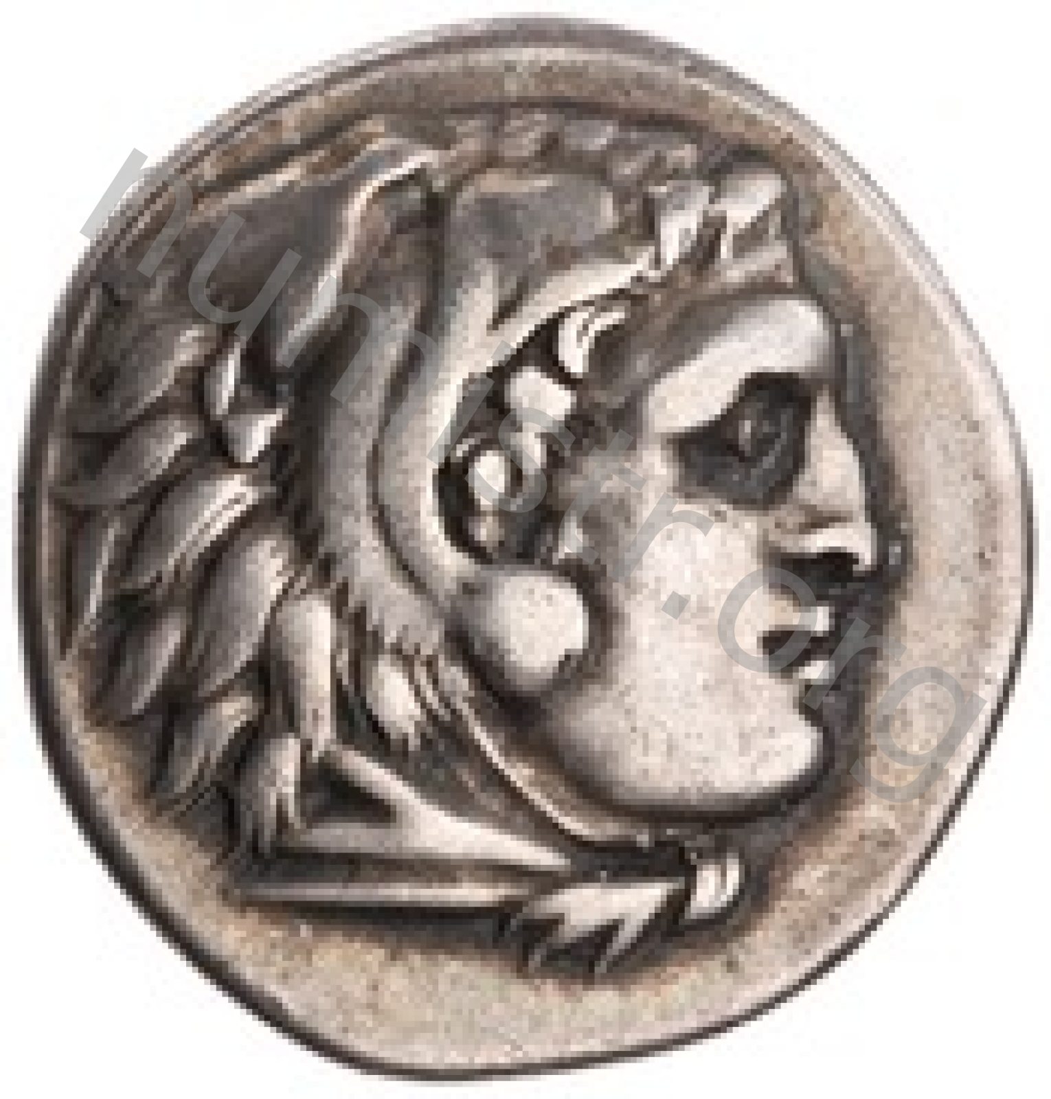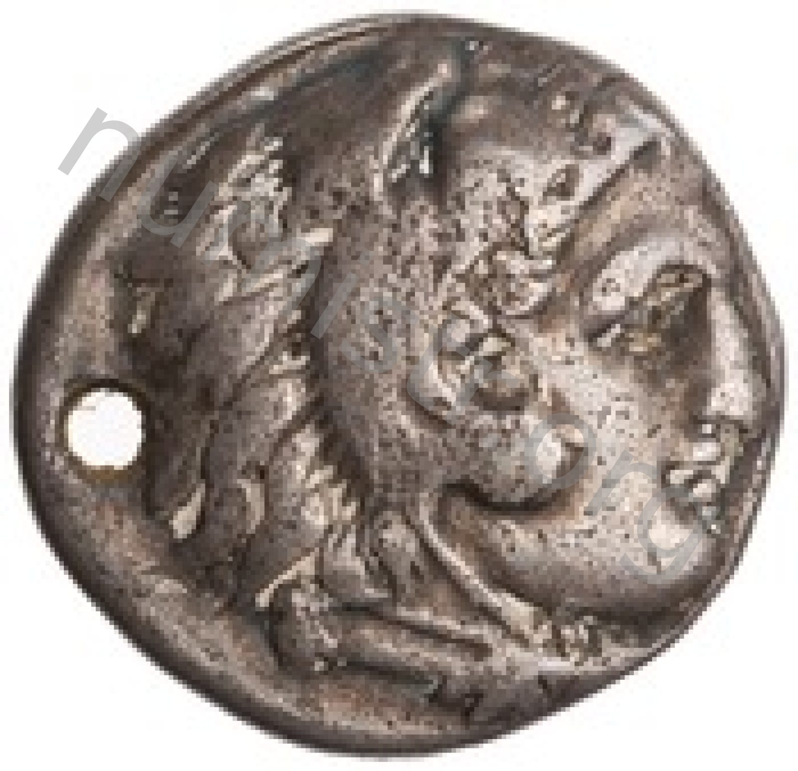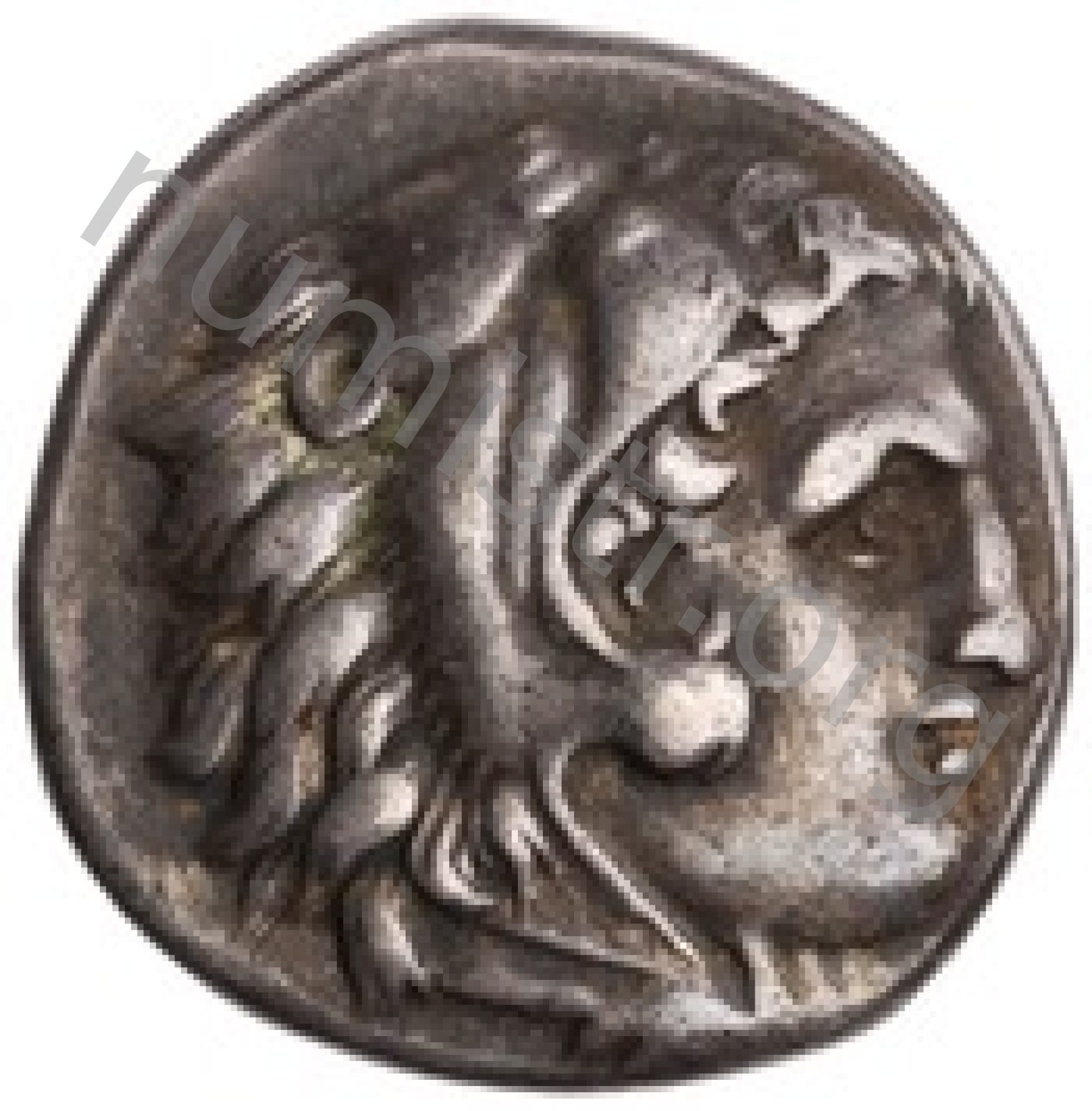 Head of beardless Heracles right wearing lion skin headdress -[en]