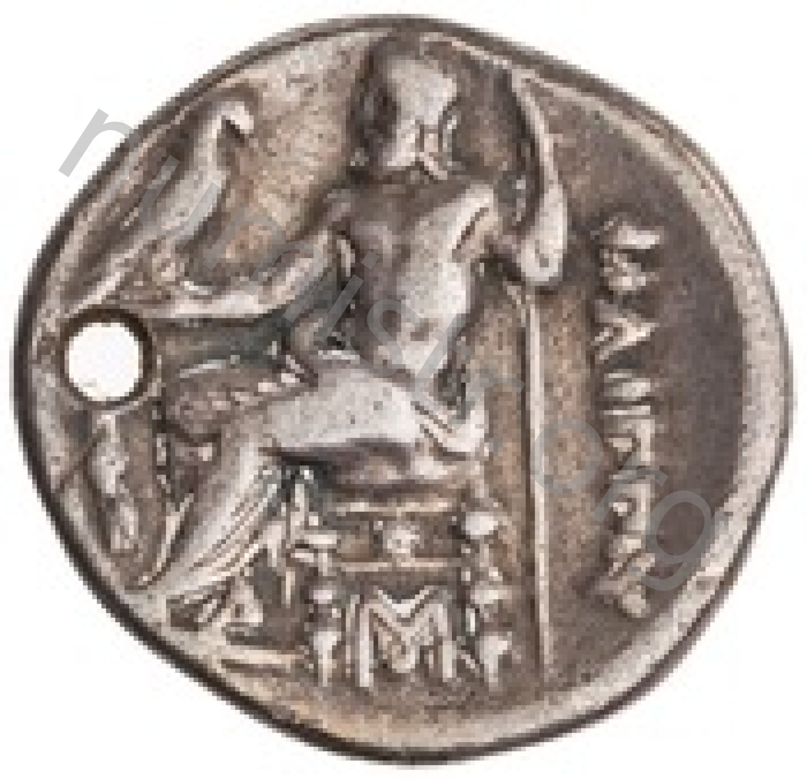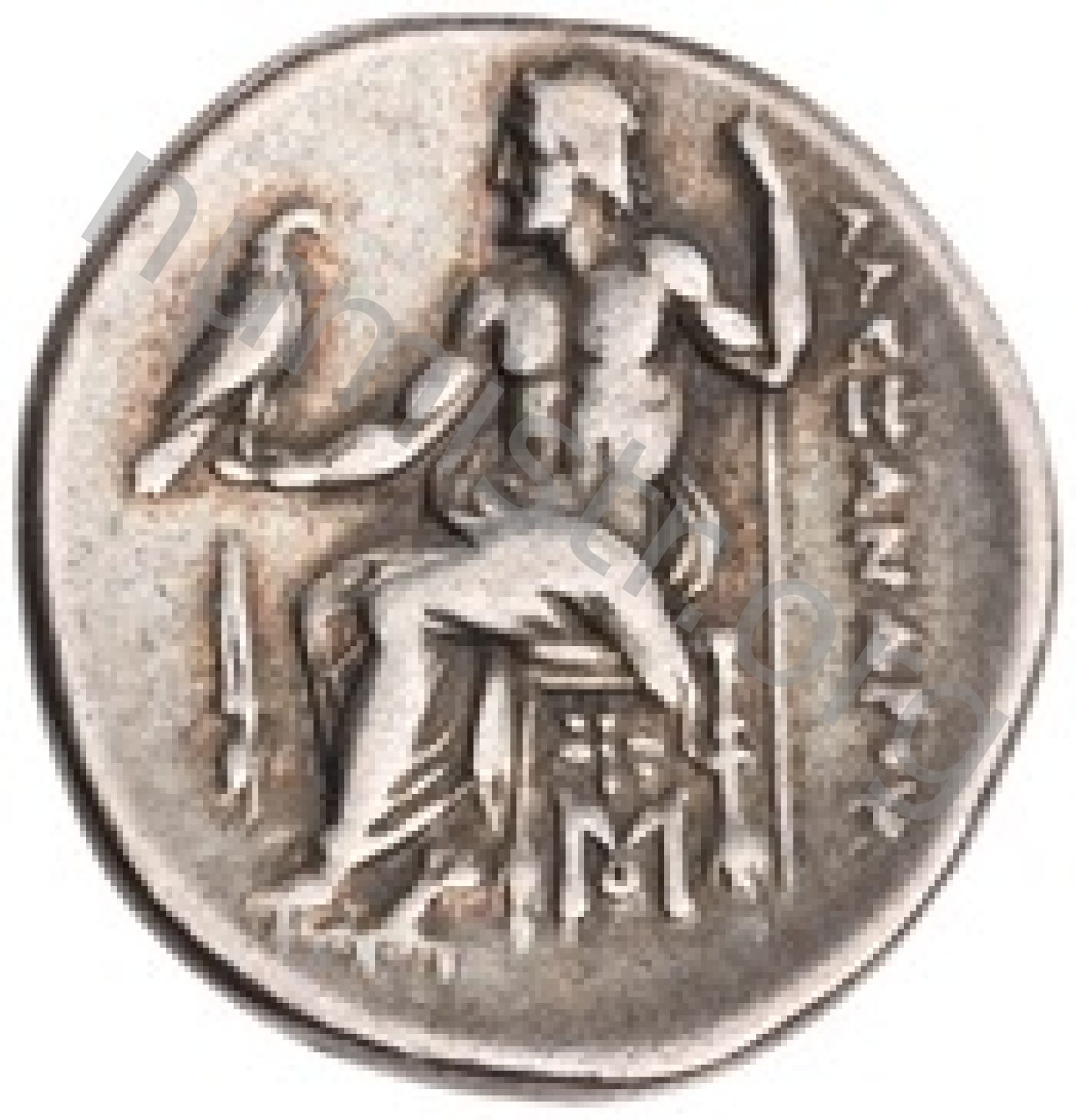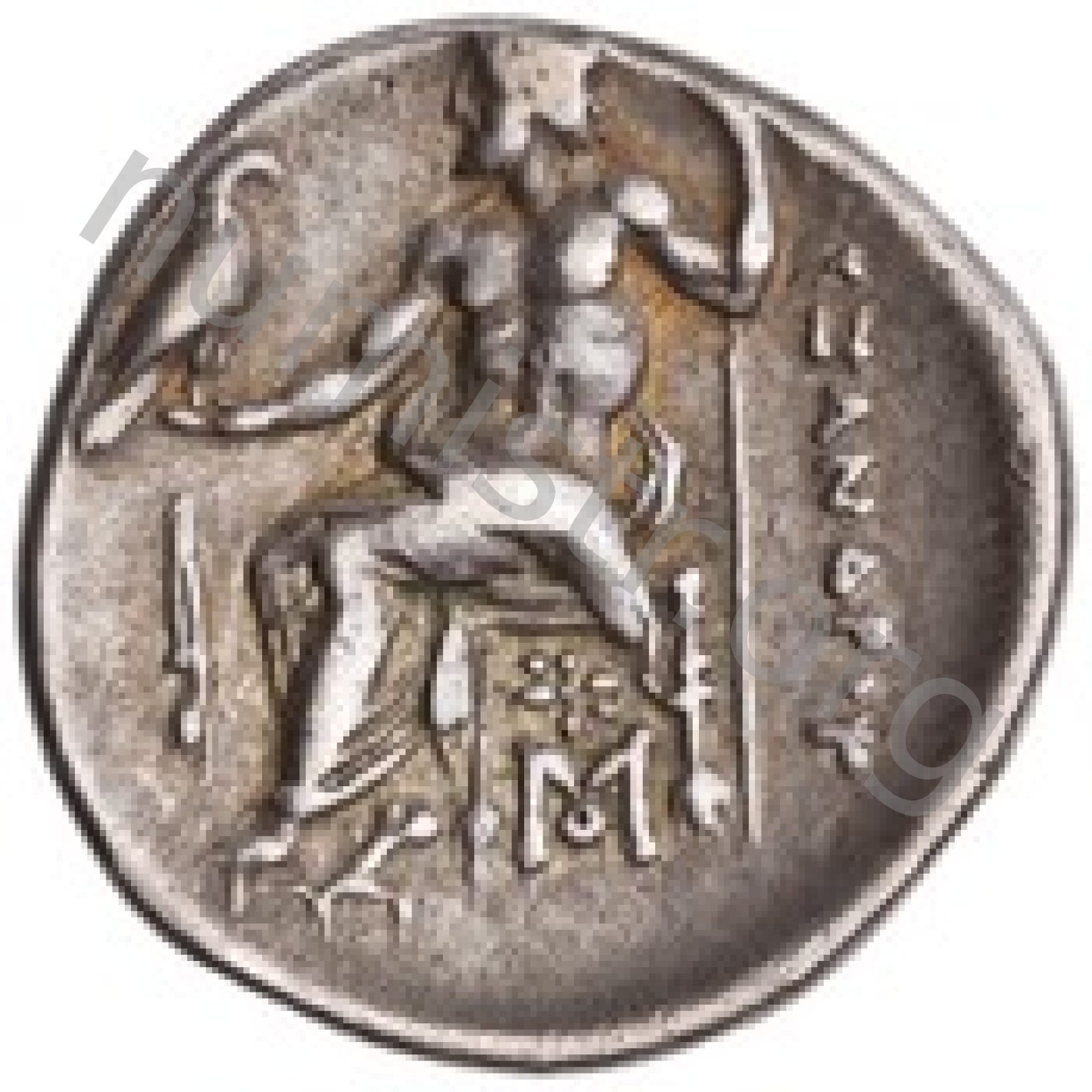 Zeus seated on stool-throne left eagle on outstretched right hand sceptre in left hand -[en]