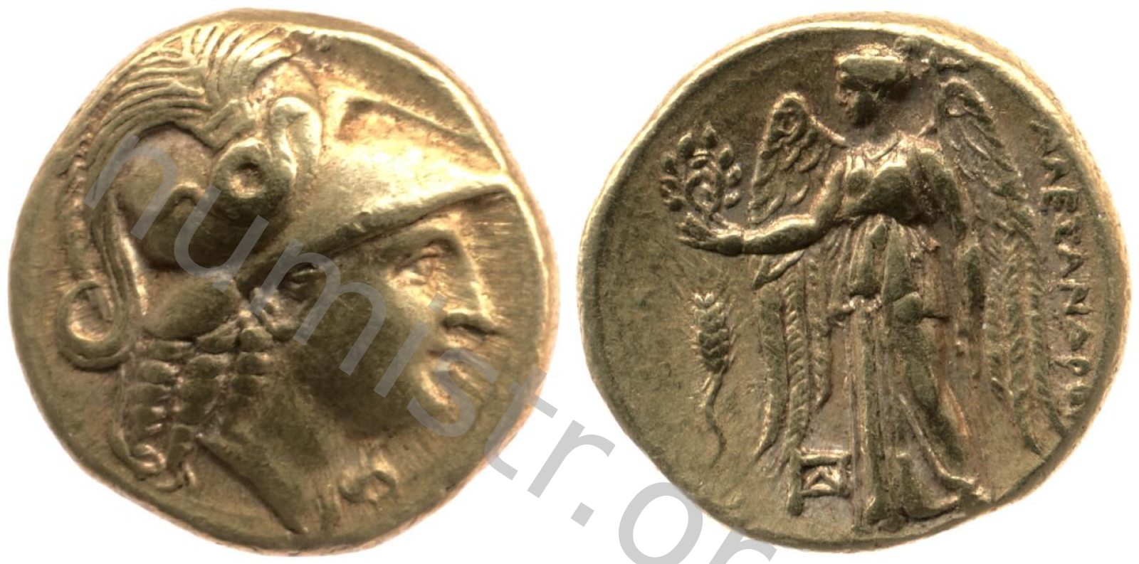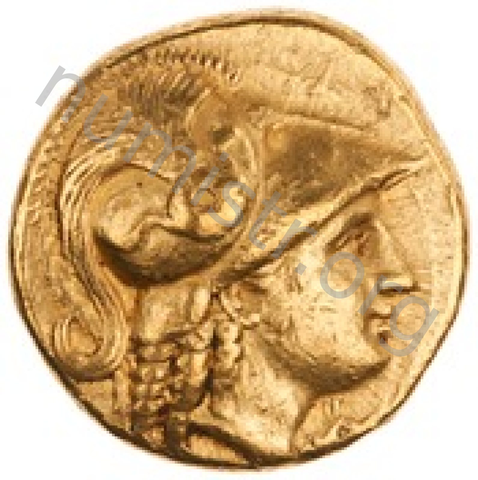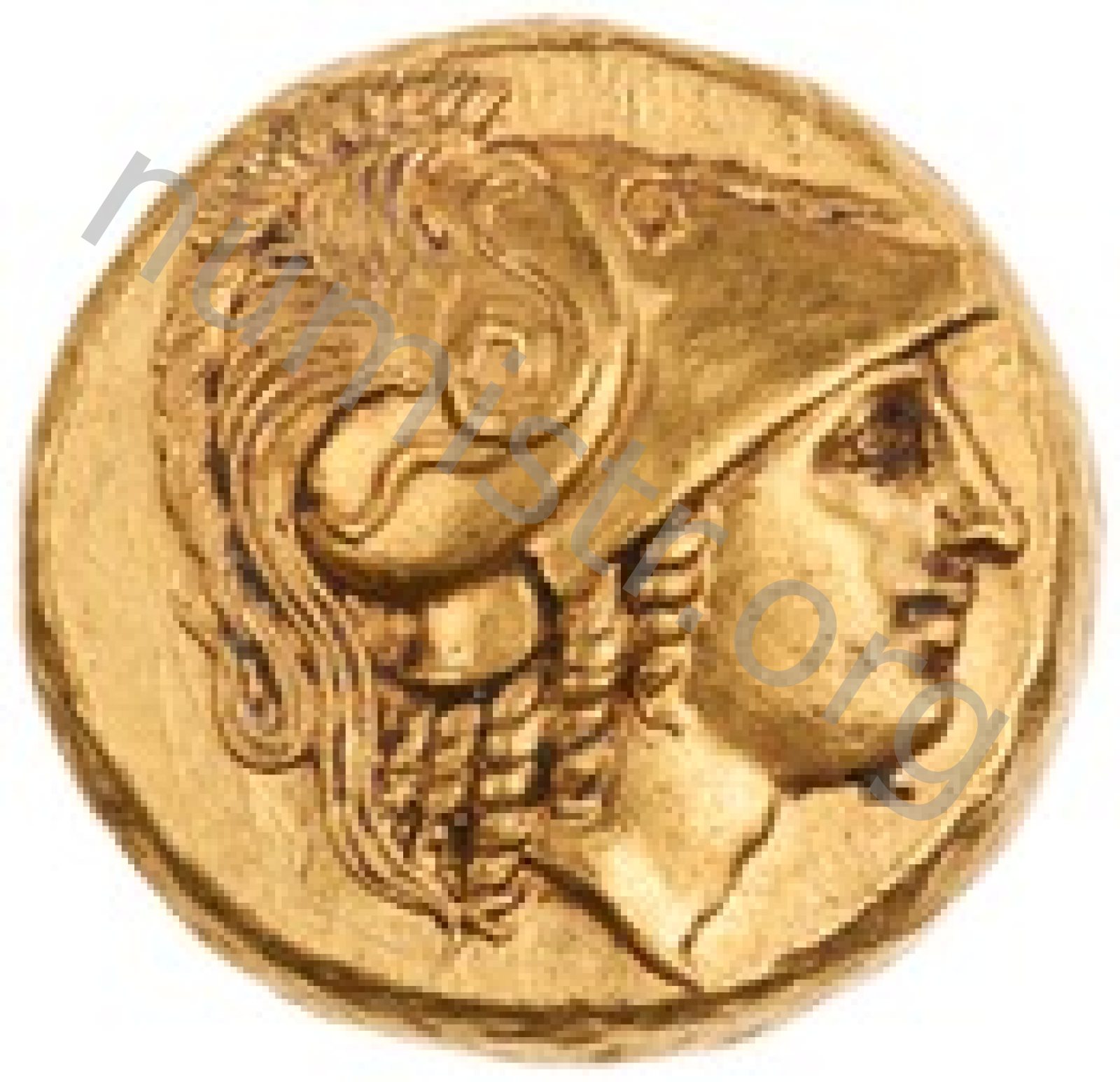 Head of Athena right wearing Corinthian helmet with crest -[en]