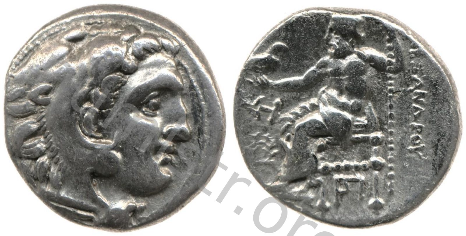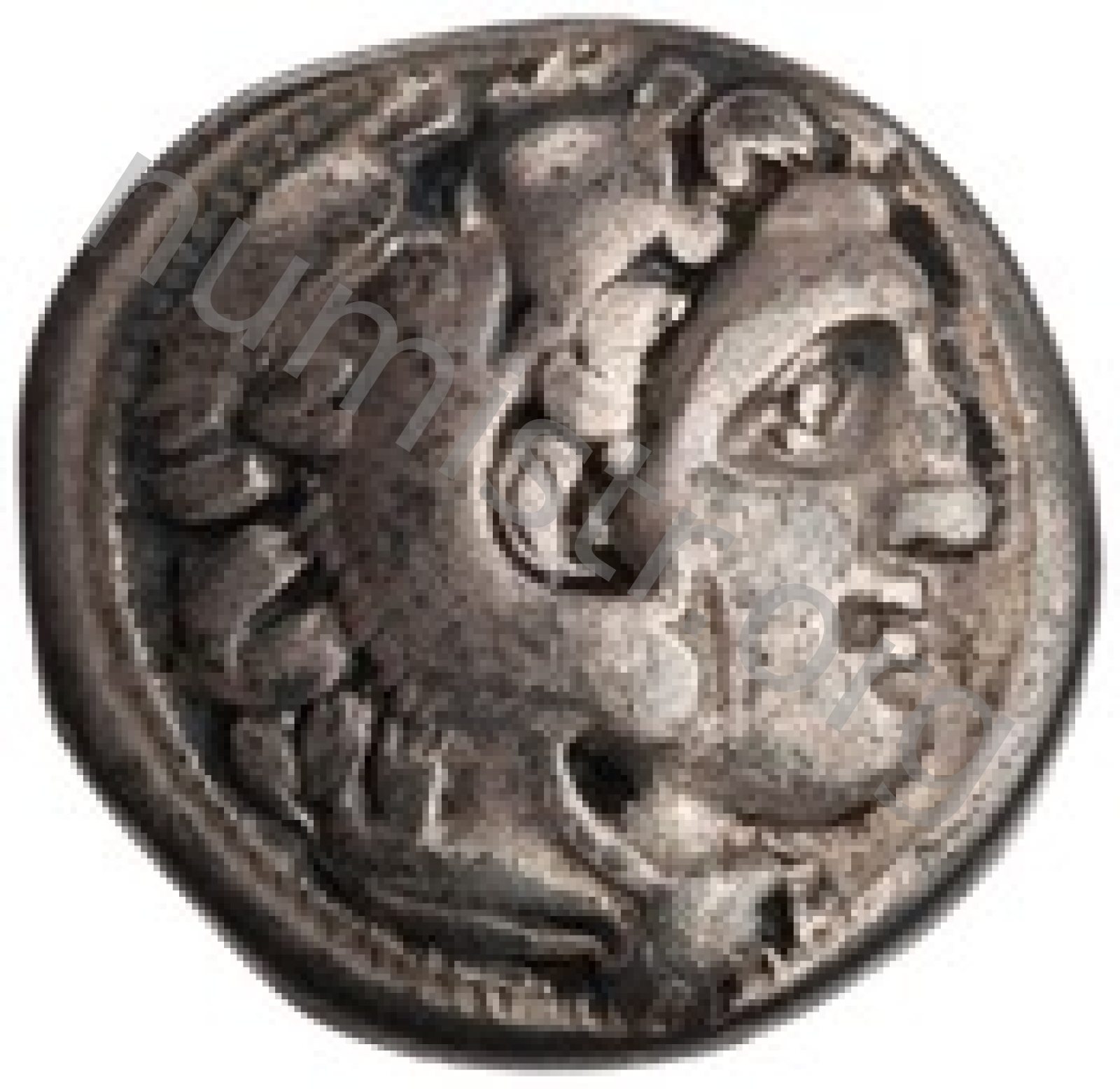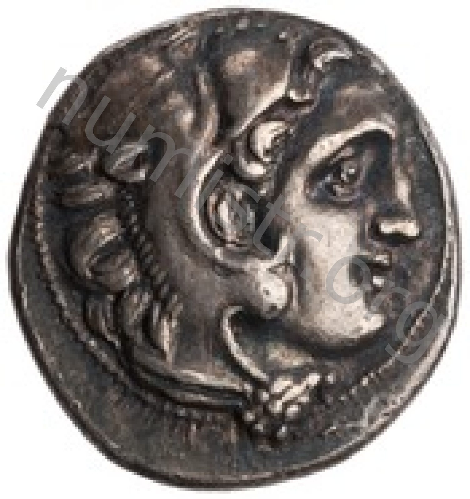 Head of beardless Heracles right wearing lion skin headdress -[en]