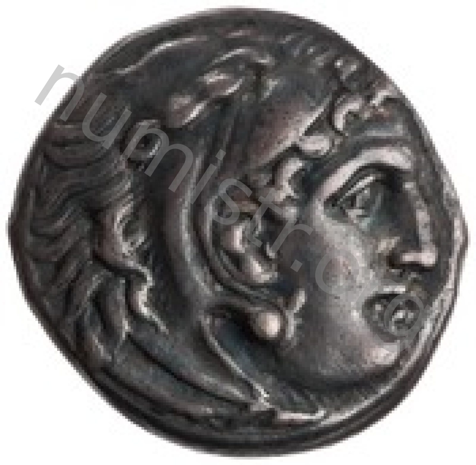 Head of beardless Heracles right wearing lion skin headdress -[en]