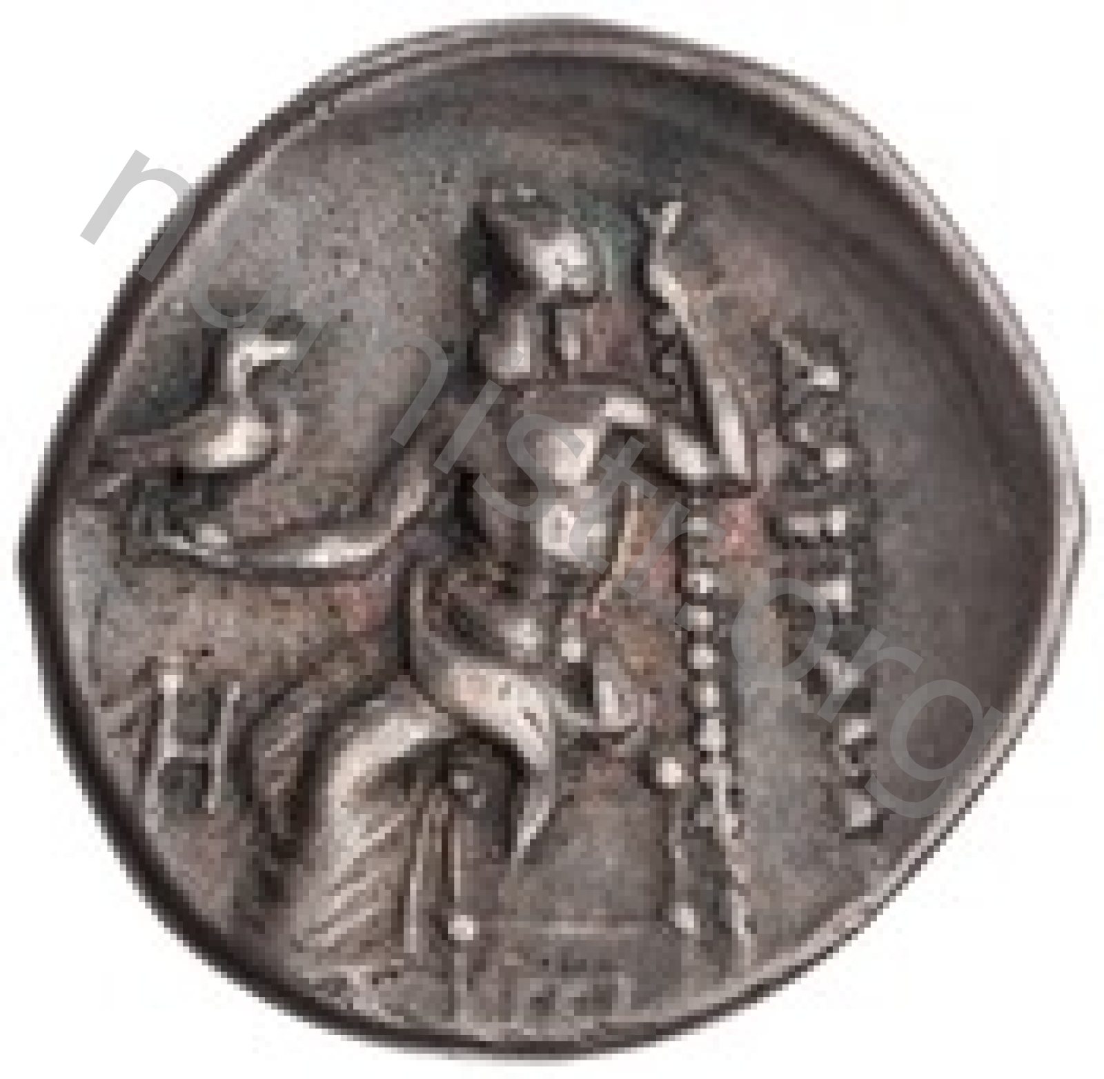 Zeus seated on stool-throne left eagle on outstretched right hand sceptre in left hand -[en]