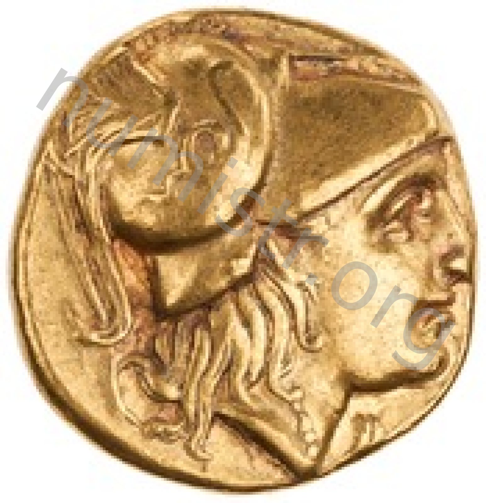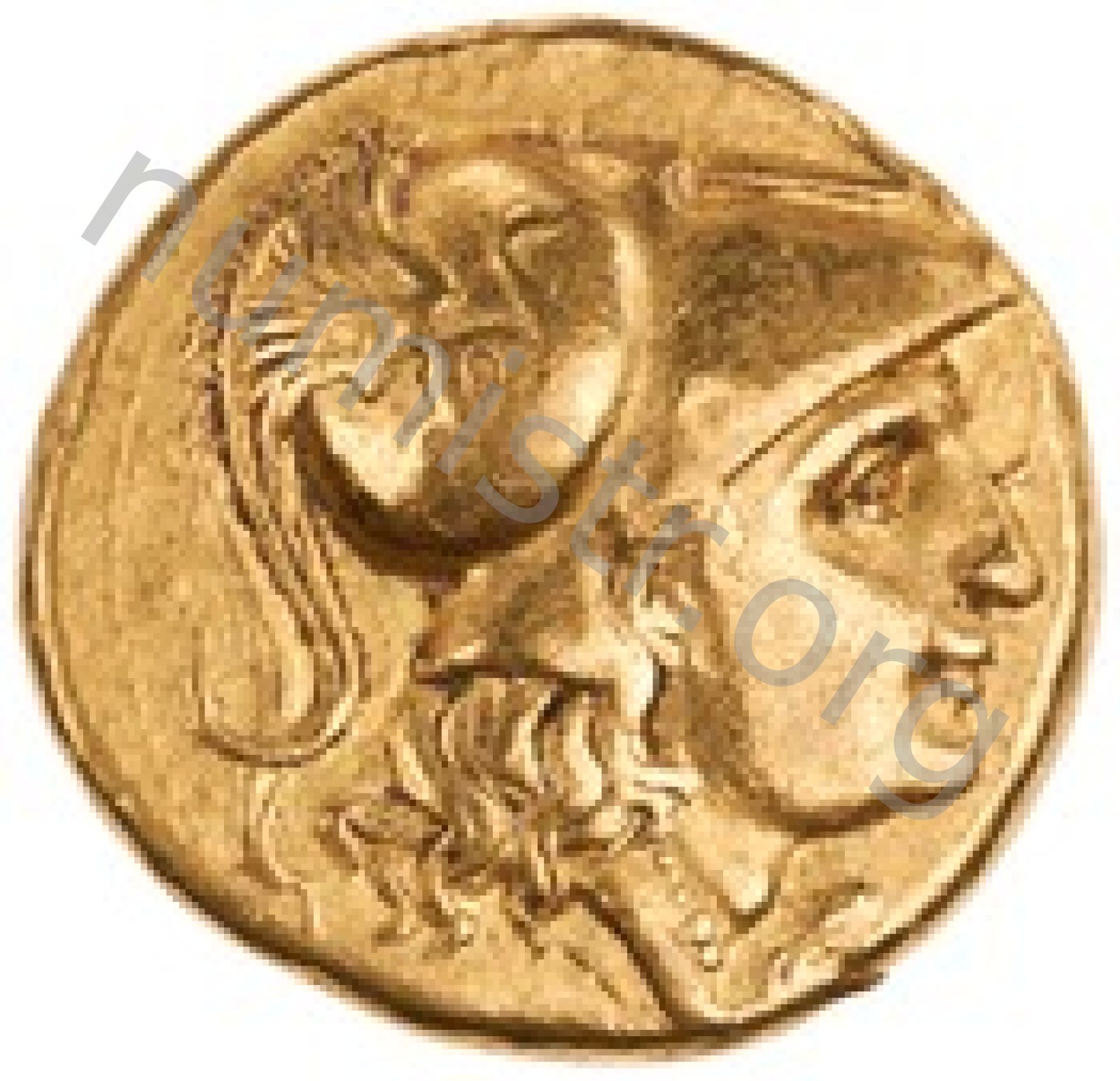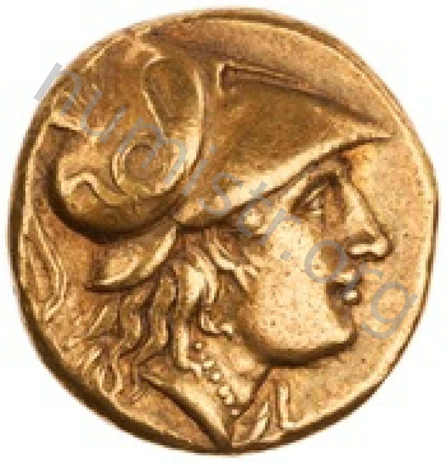 Head of Athena right wearing Corinthian helmet with crest -[en]