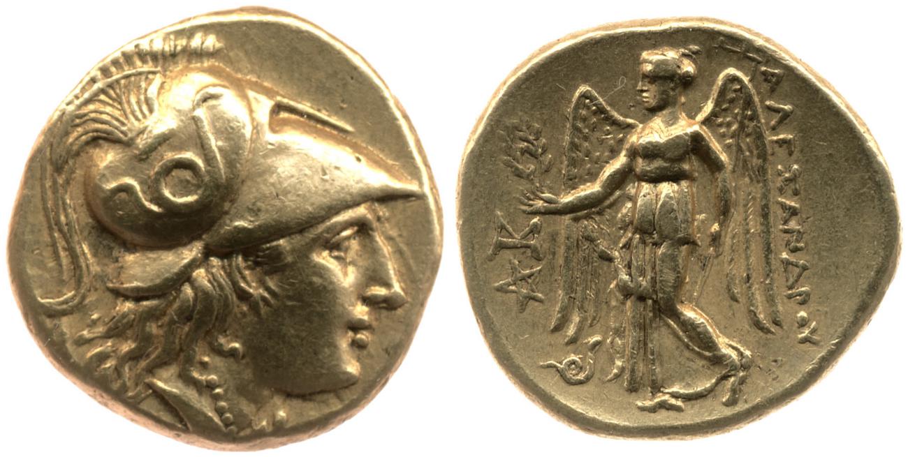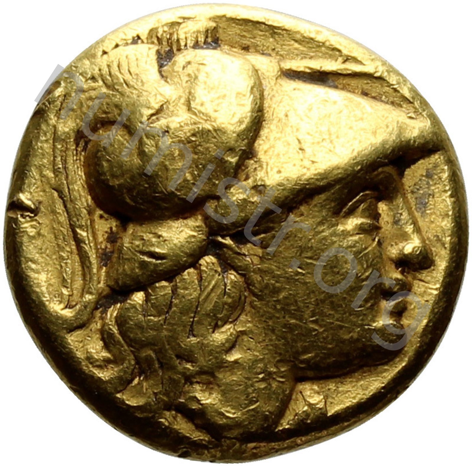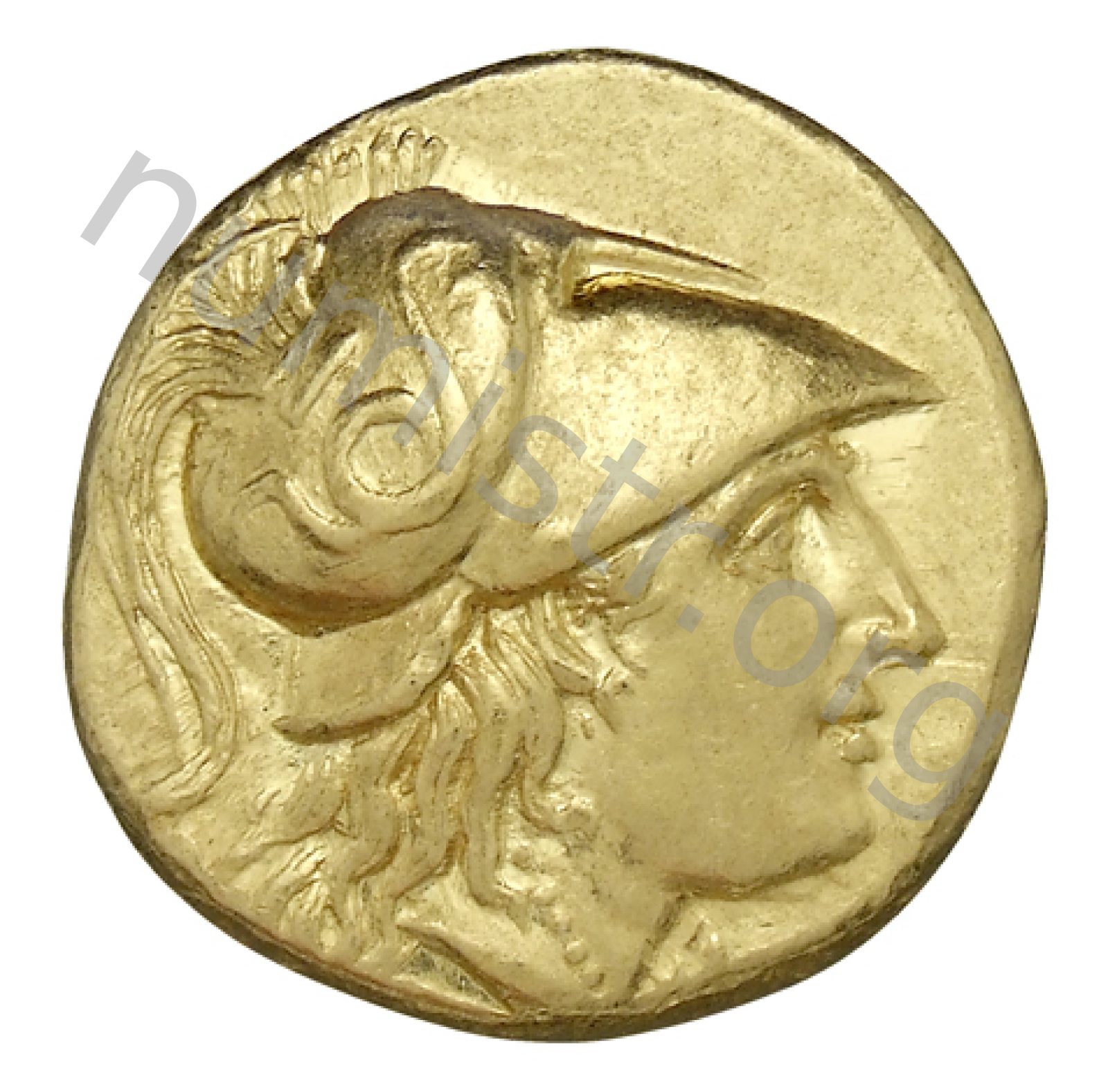 Head of Athena right wearing Corinthian helmet with crest -[en]