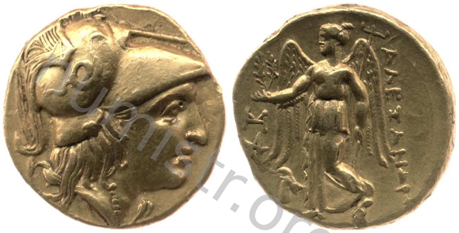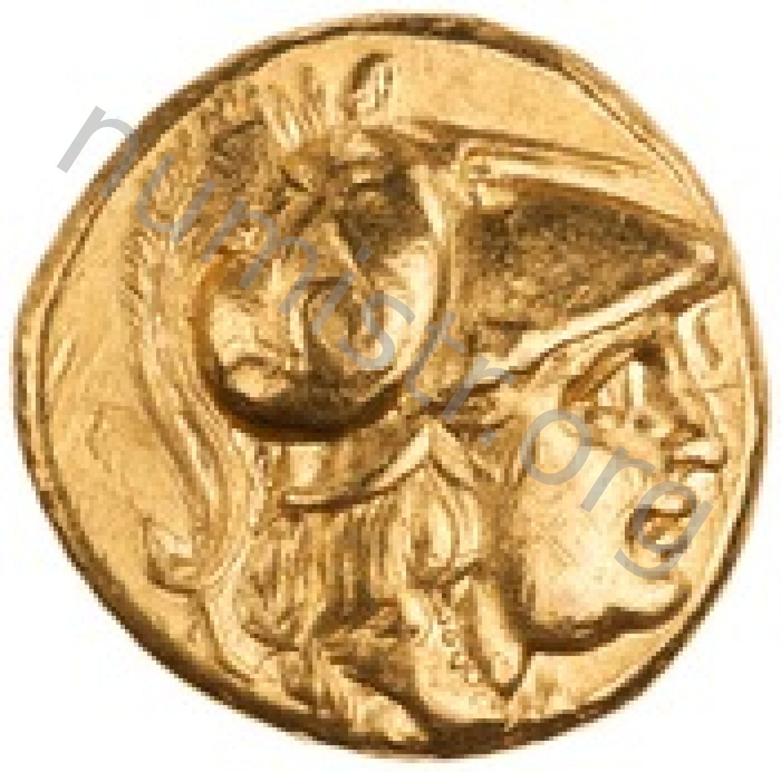 Head of Athena right wearing Corinthian helmet with crest -[en]