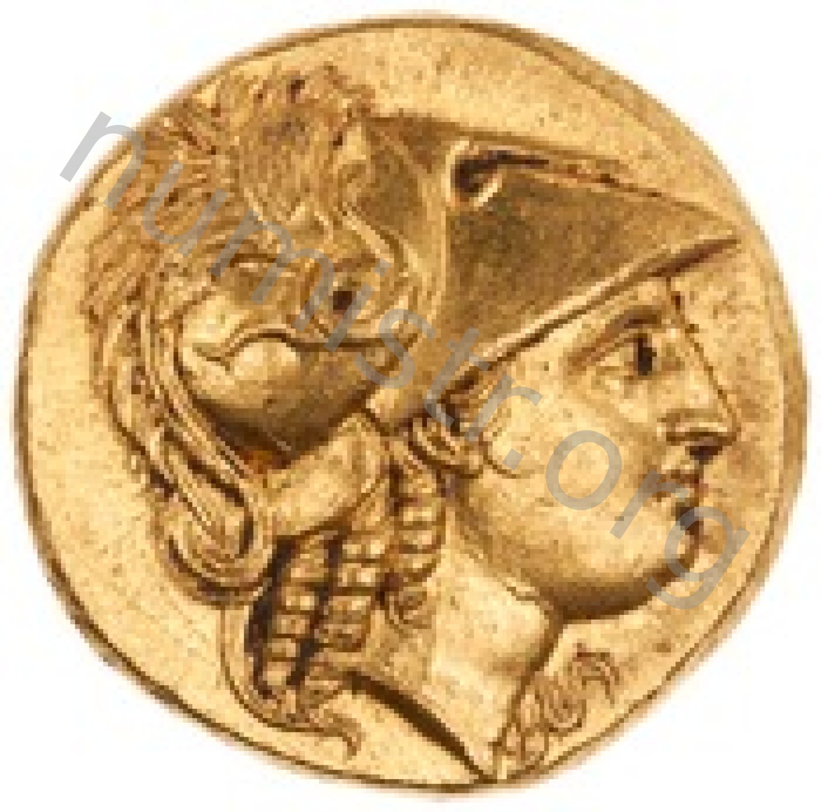 Head of Athena right wearing Corinthian helmet with crest -[en]