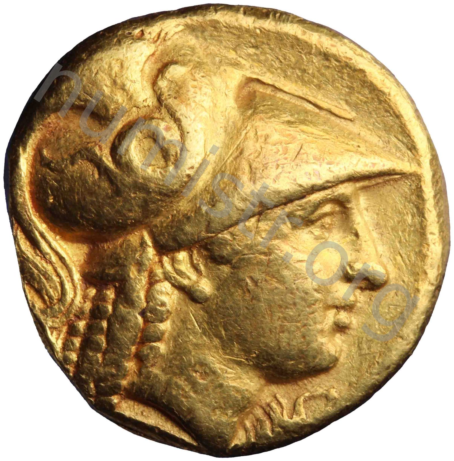 Head of Athena right wearing Corinthian helmet with crest -[en]