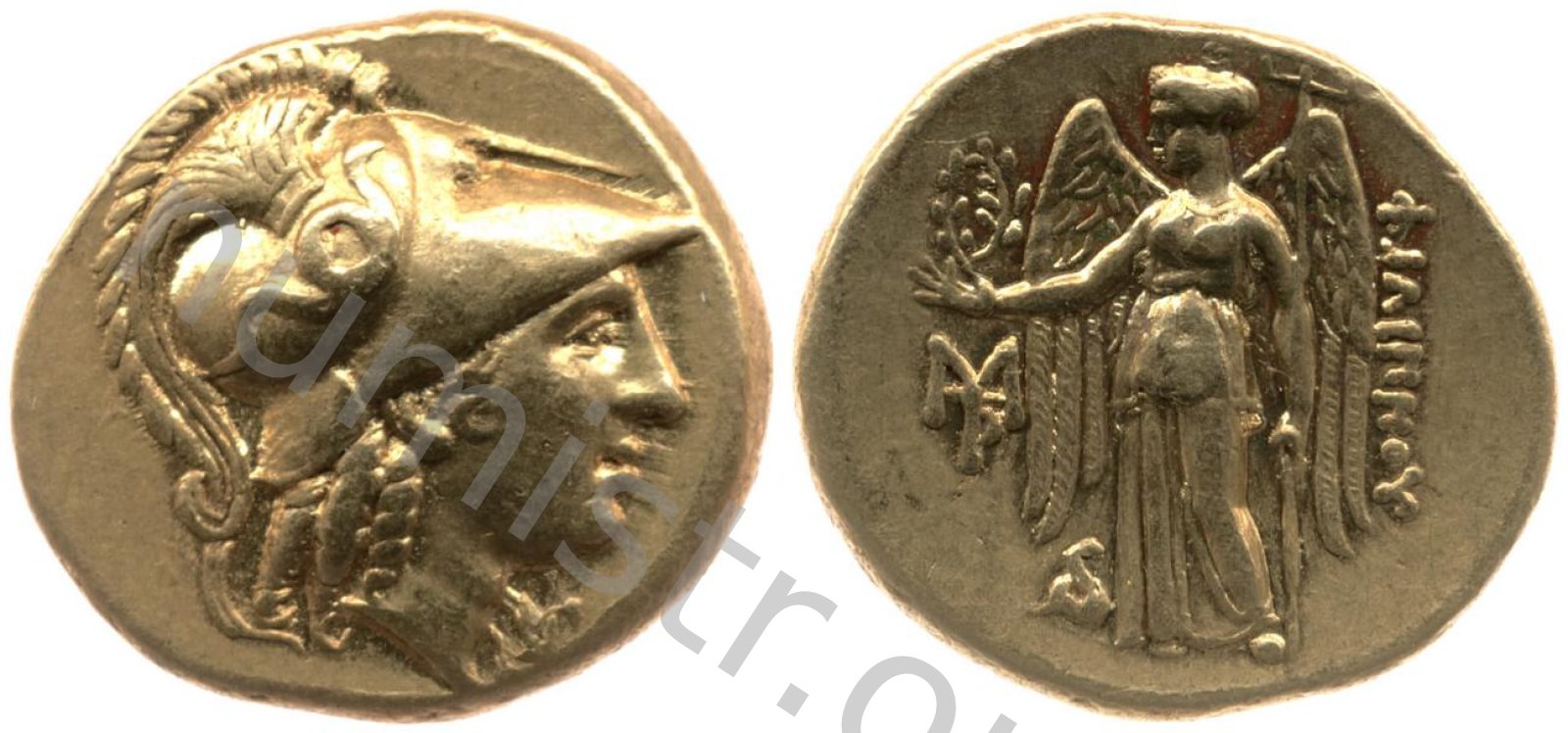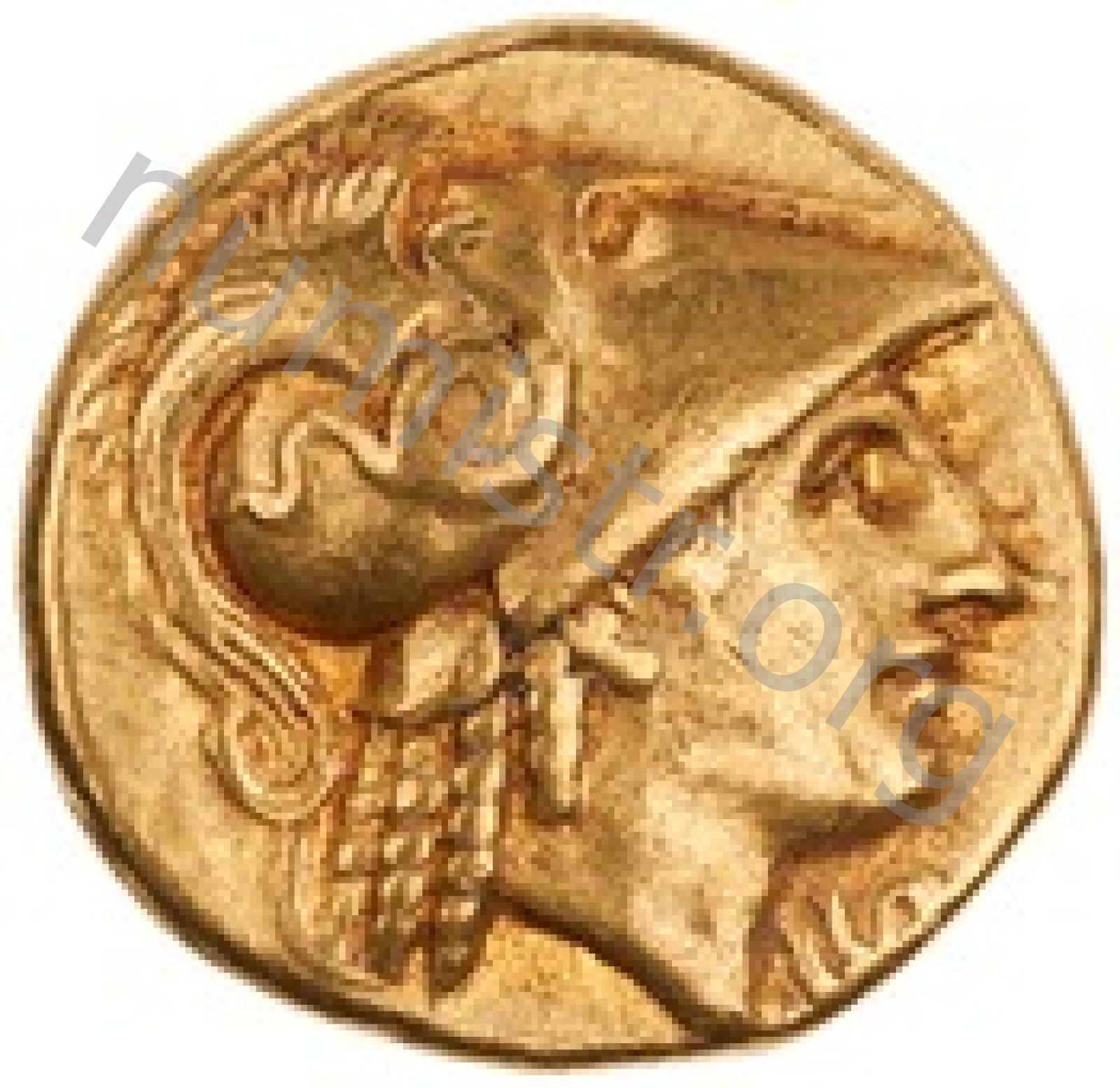 Head of Athena right wearing Corinthian helmet with crest -[en]