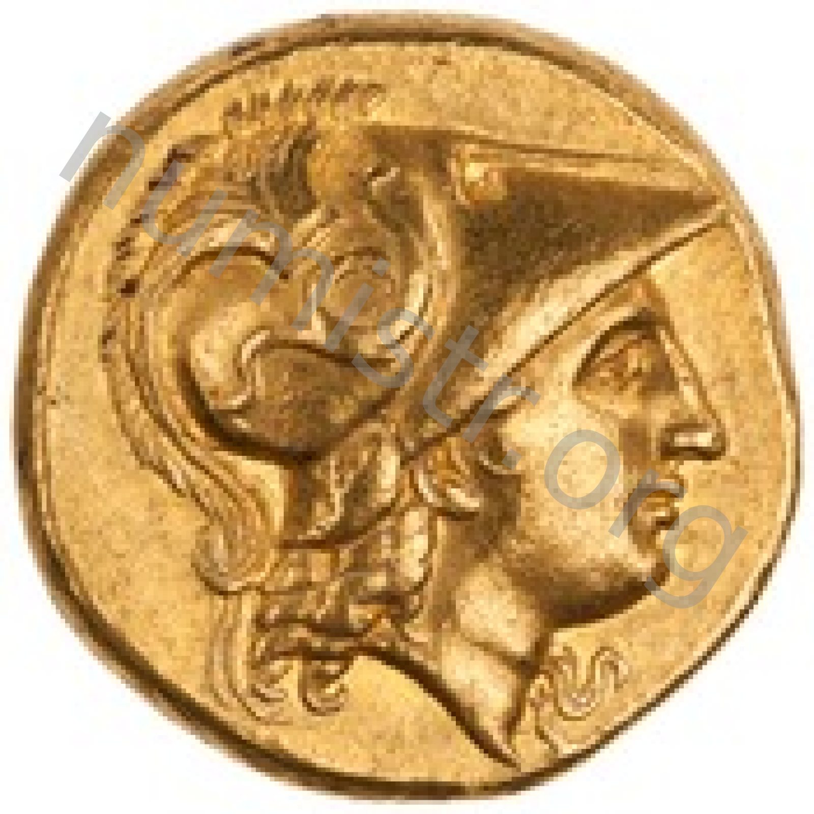 Head of Athena right wearing Corinthian helmet with crest -[en]