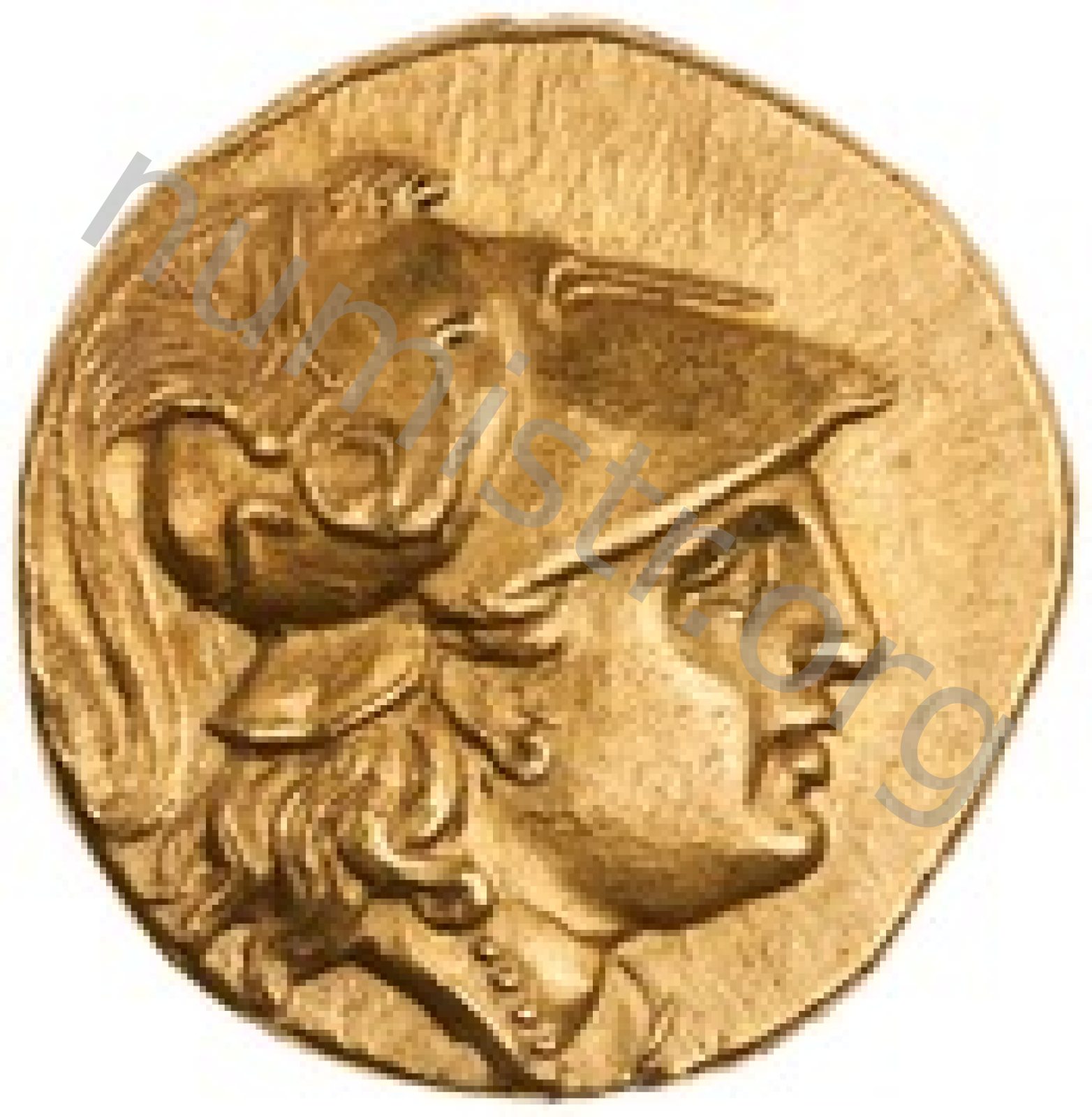 Head of Athena right wearing Corinthian helmet with crest -[en]