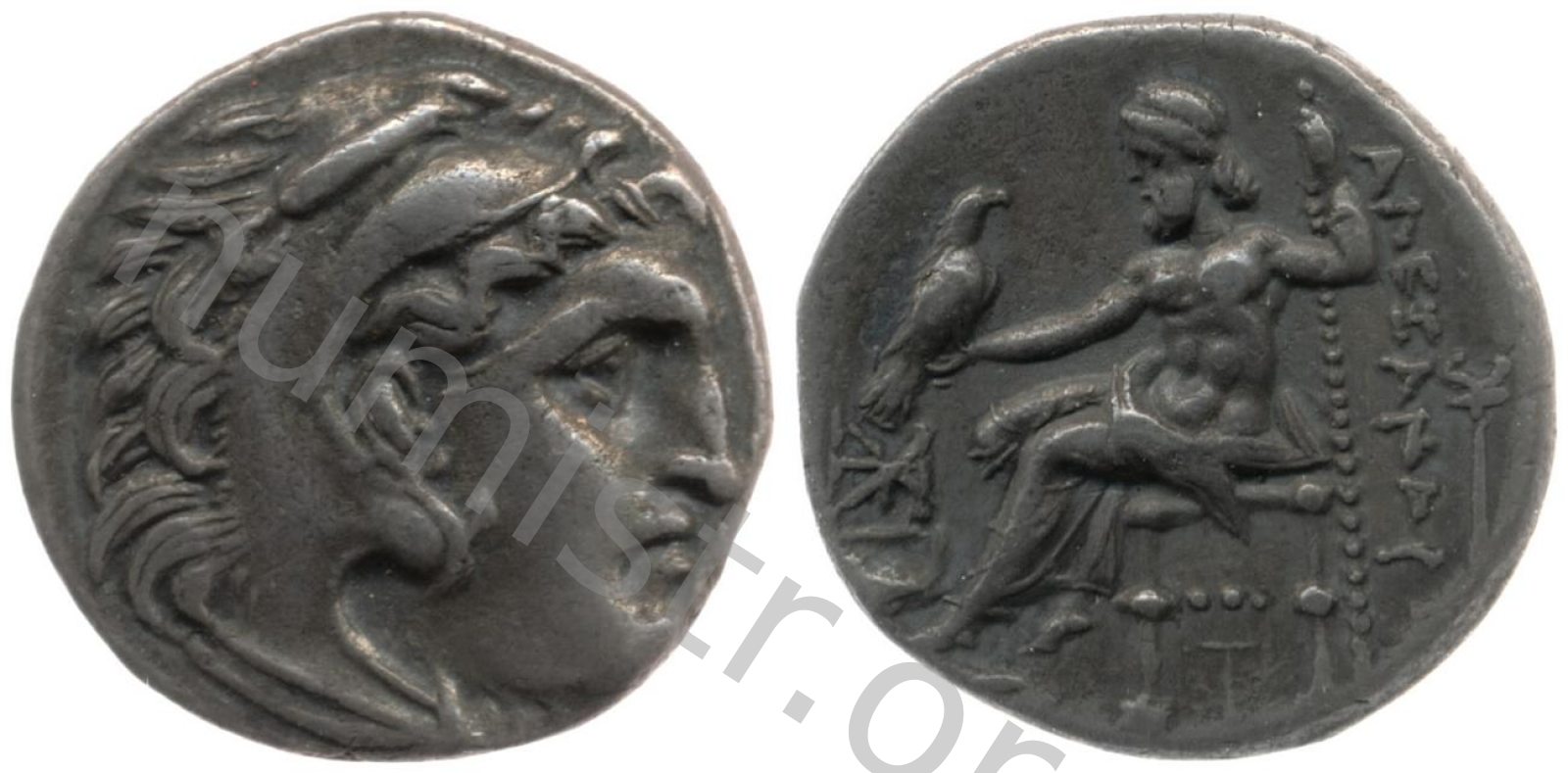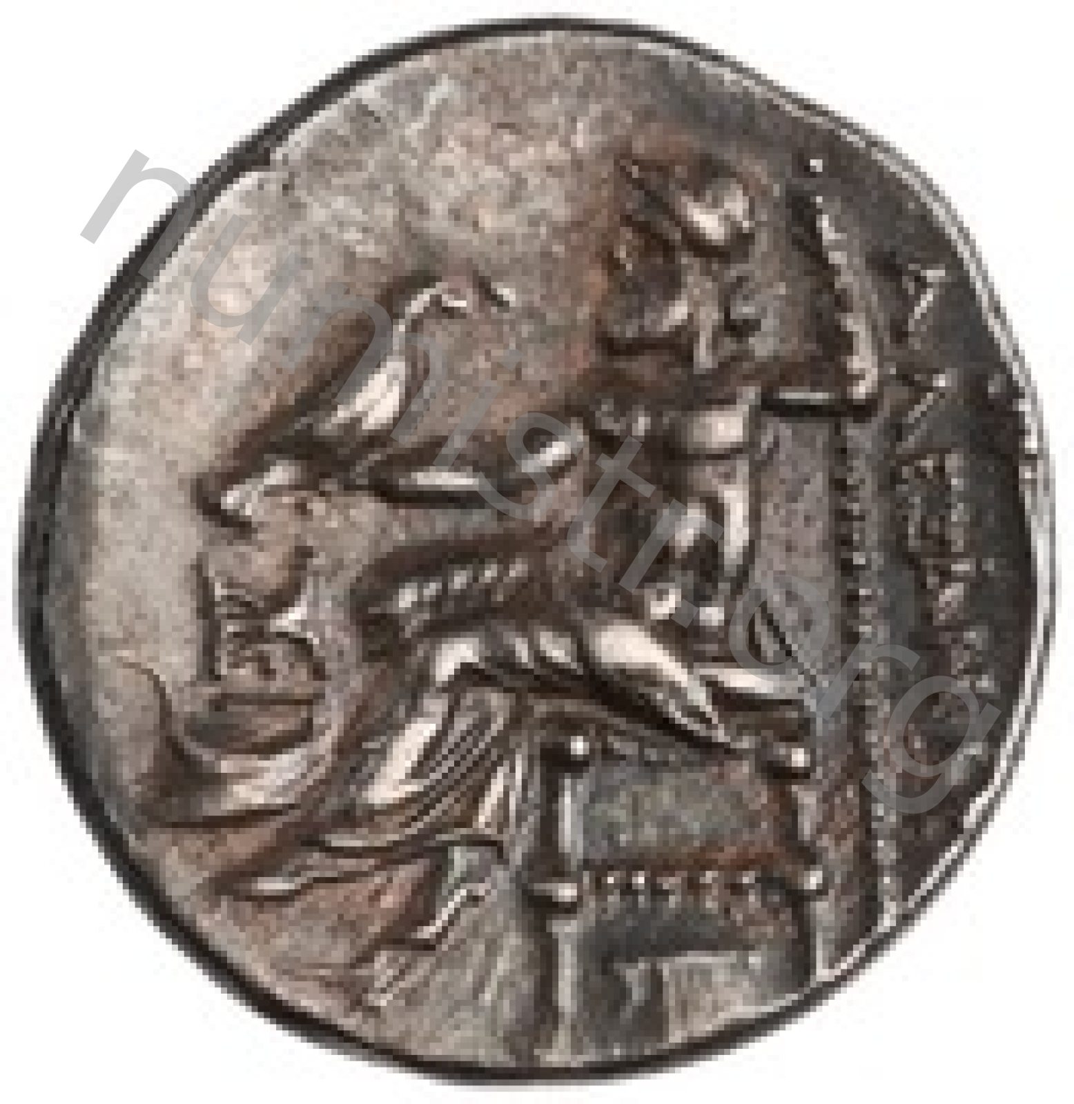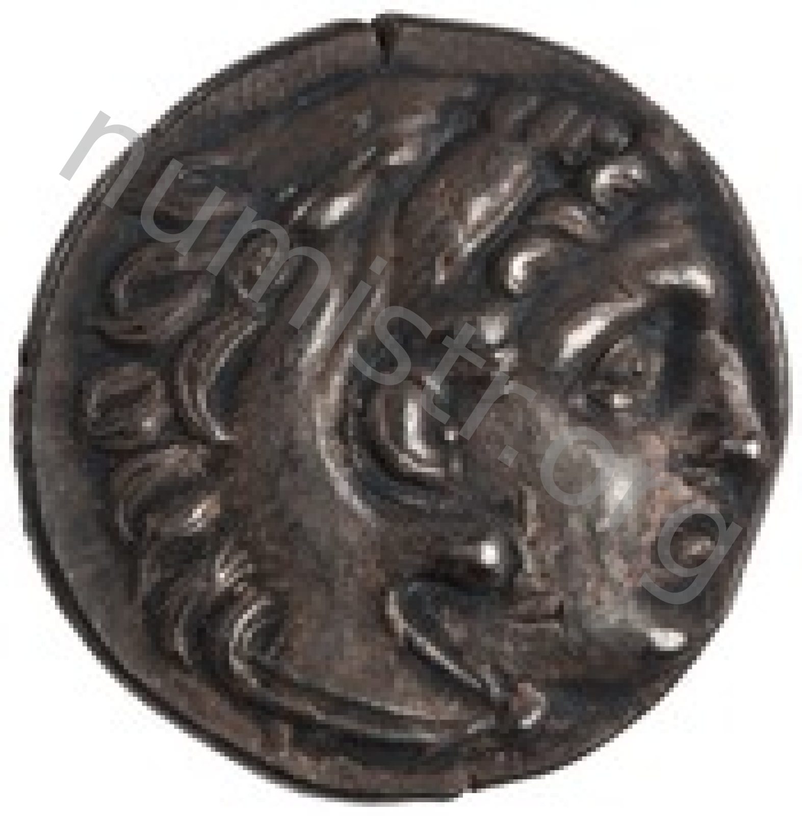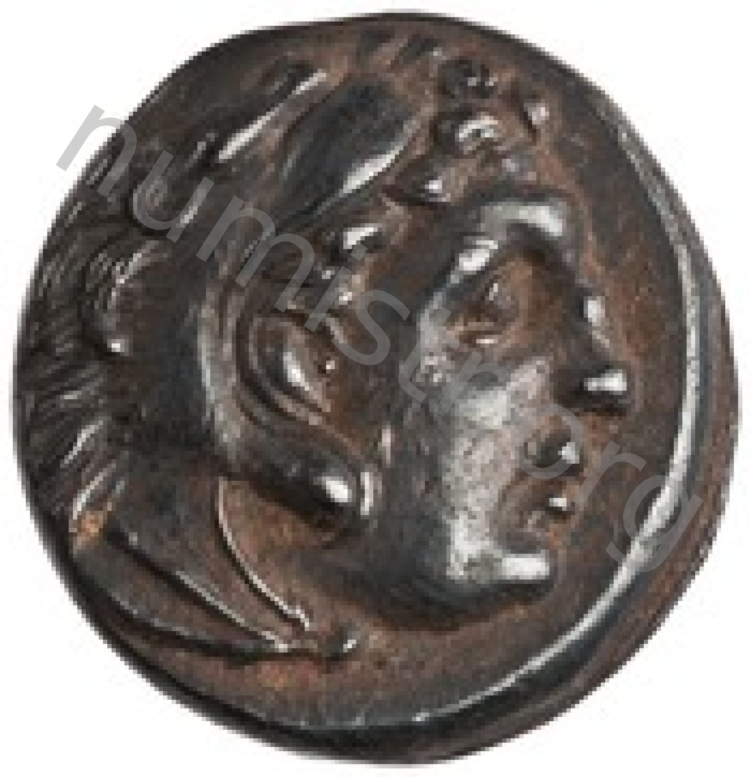 Head of beardless Heracles right wearing lion skin headdress -[en]