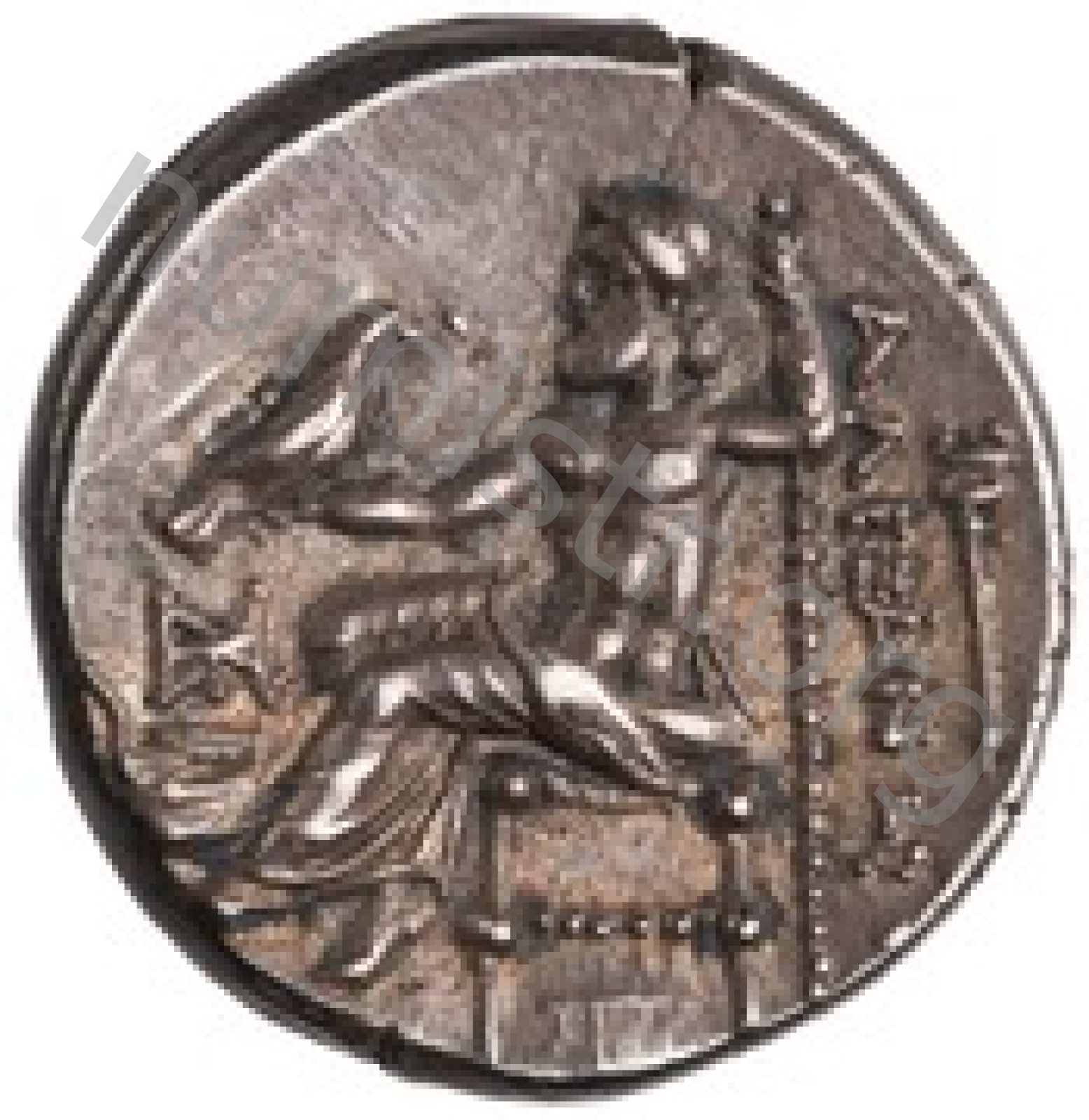 Zeus seated on stool-throne left eagle on outstretched right hand sceptre in left hand -[en]