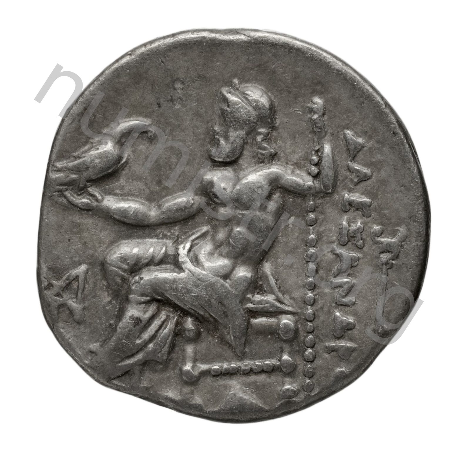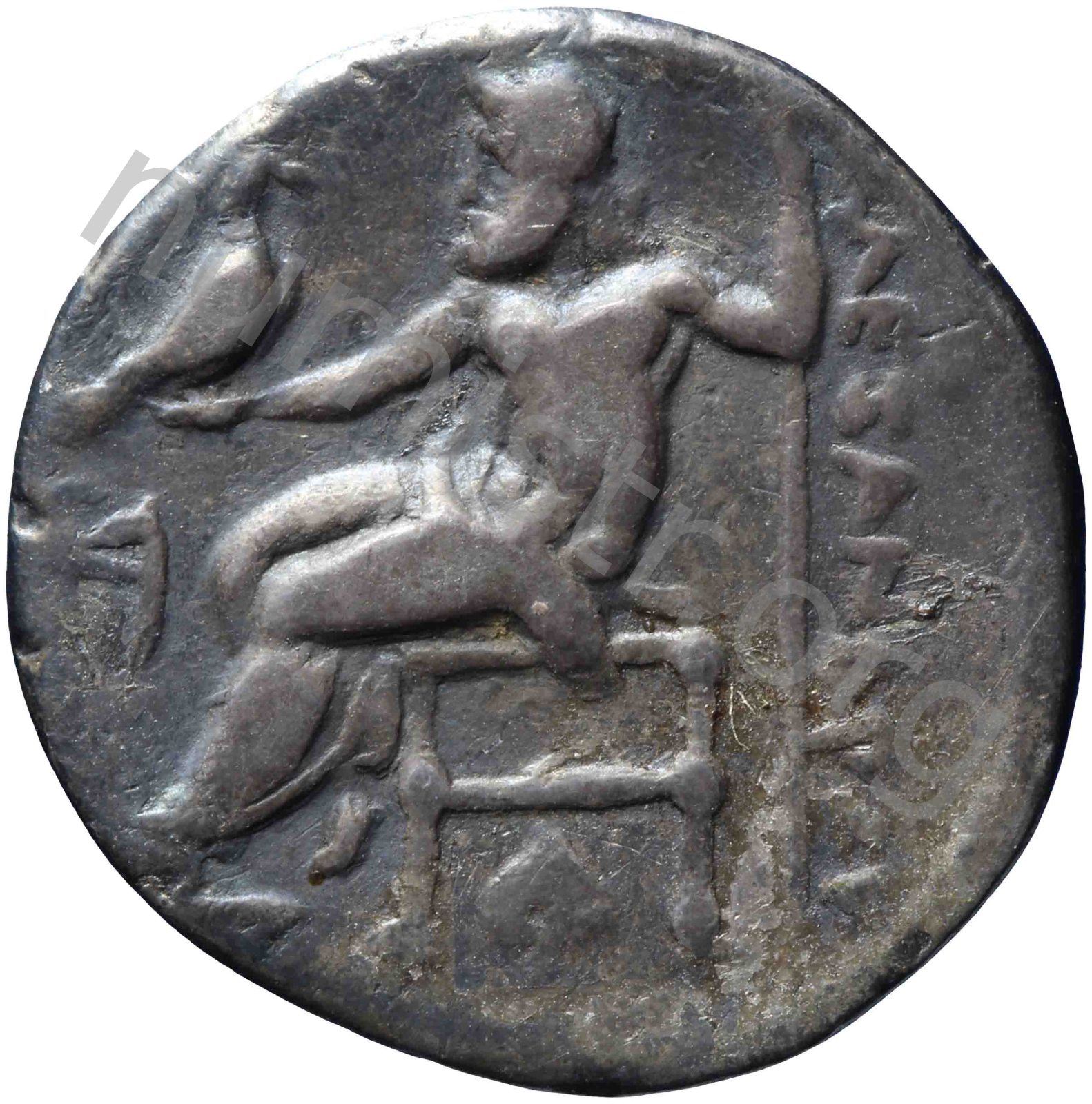 Zeus tabure-tahtta oturuyor sol elinde kartal sağ elinde asa var.