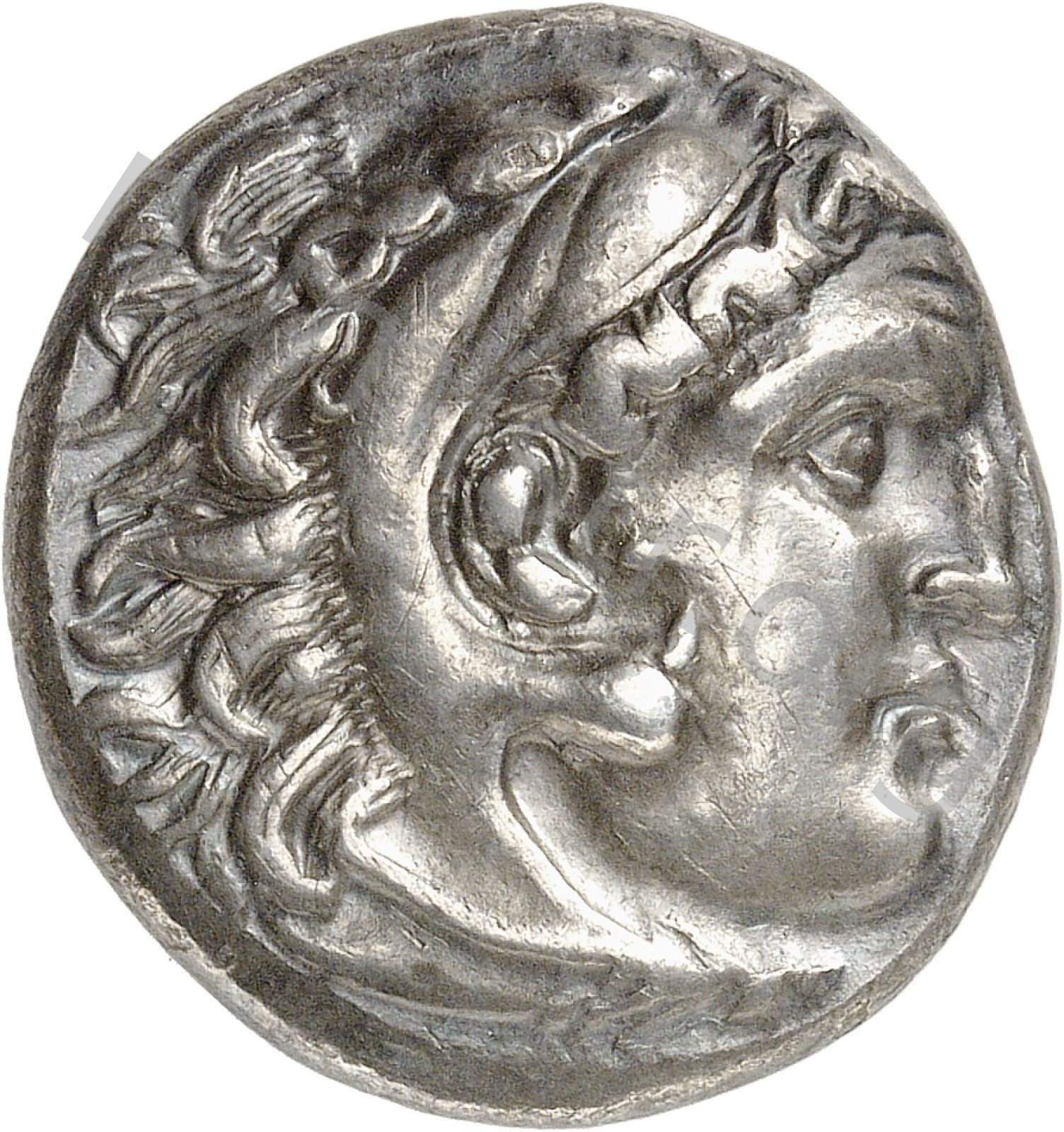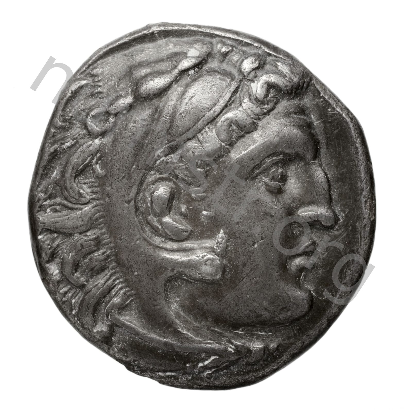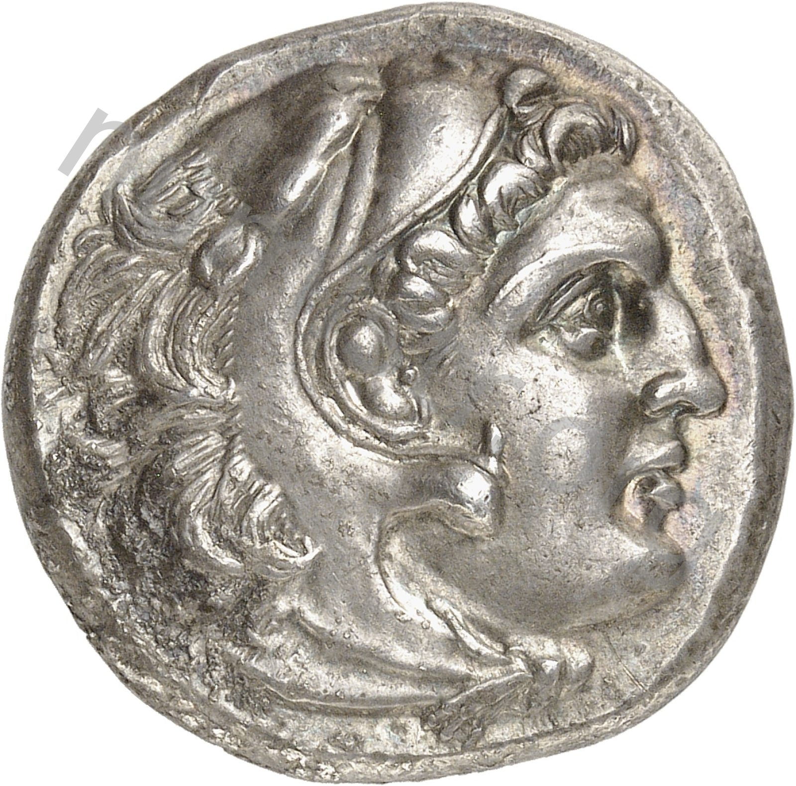 Head of beardless Heracles right wearing lion skin headdress -[en]