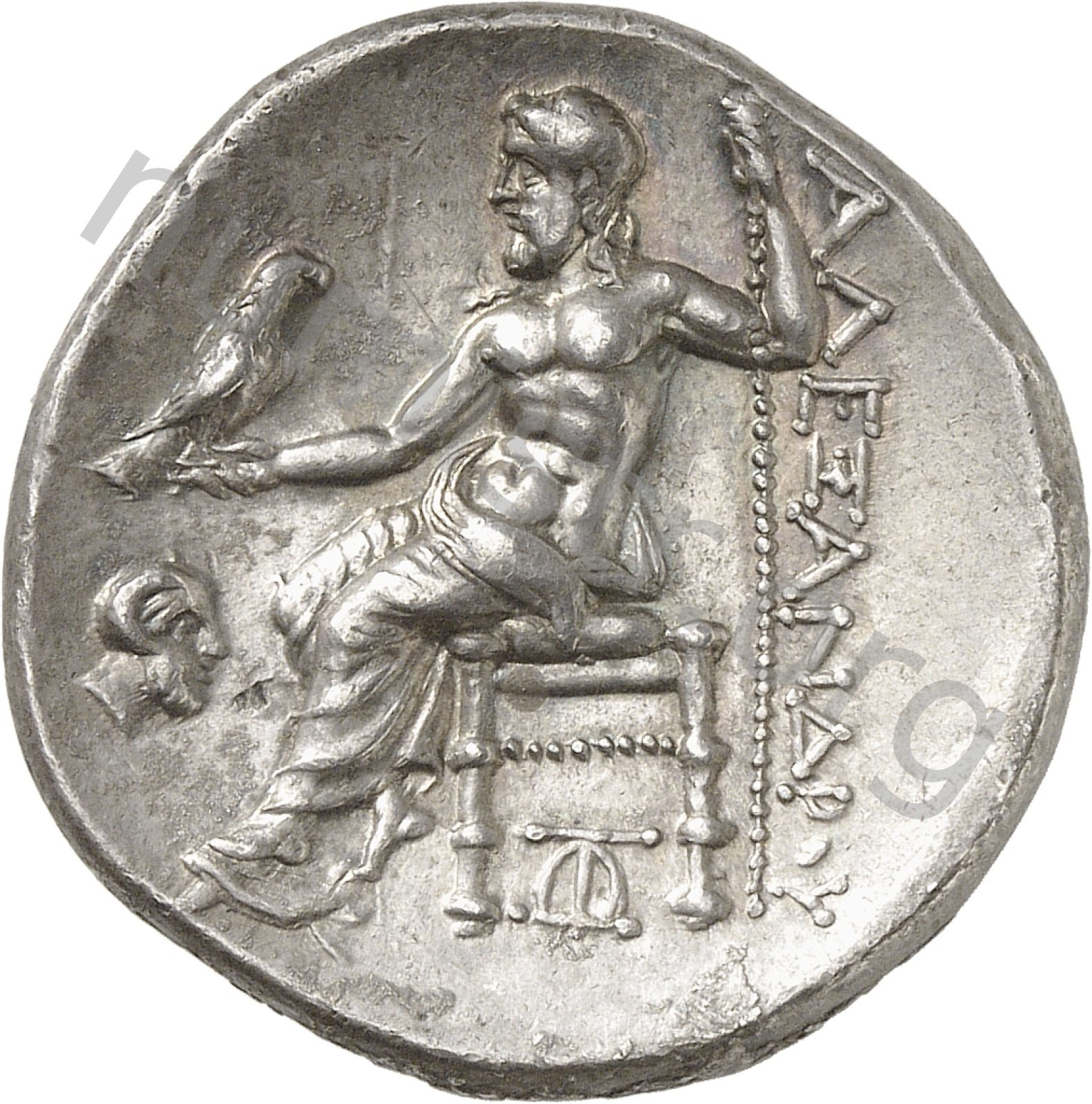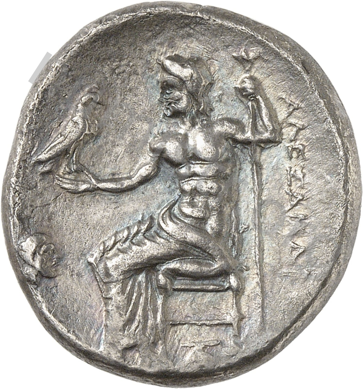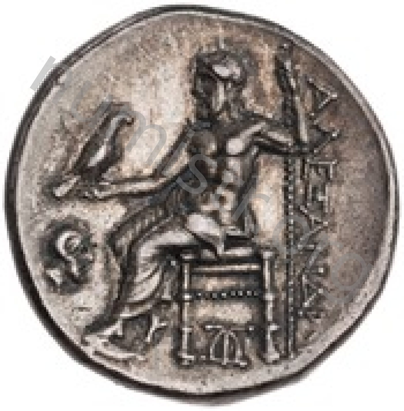 Zeus tabure-tahtta oturuyor sol elinde kartal sağ elinde asa var.