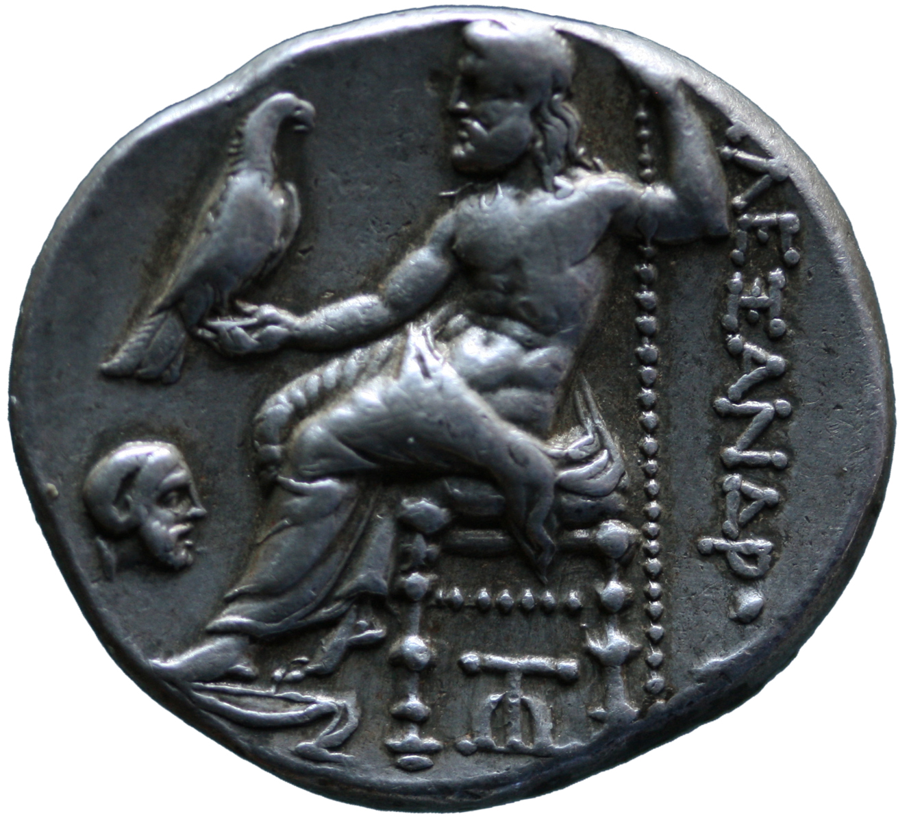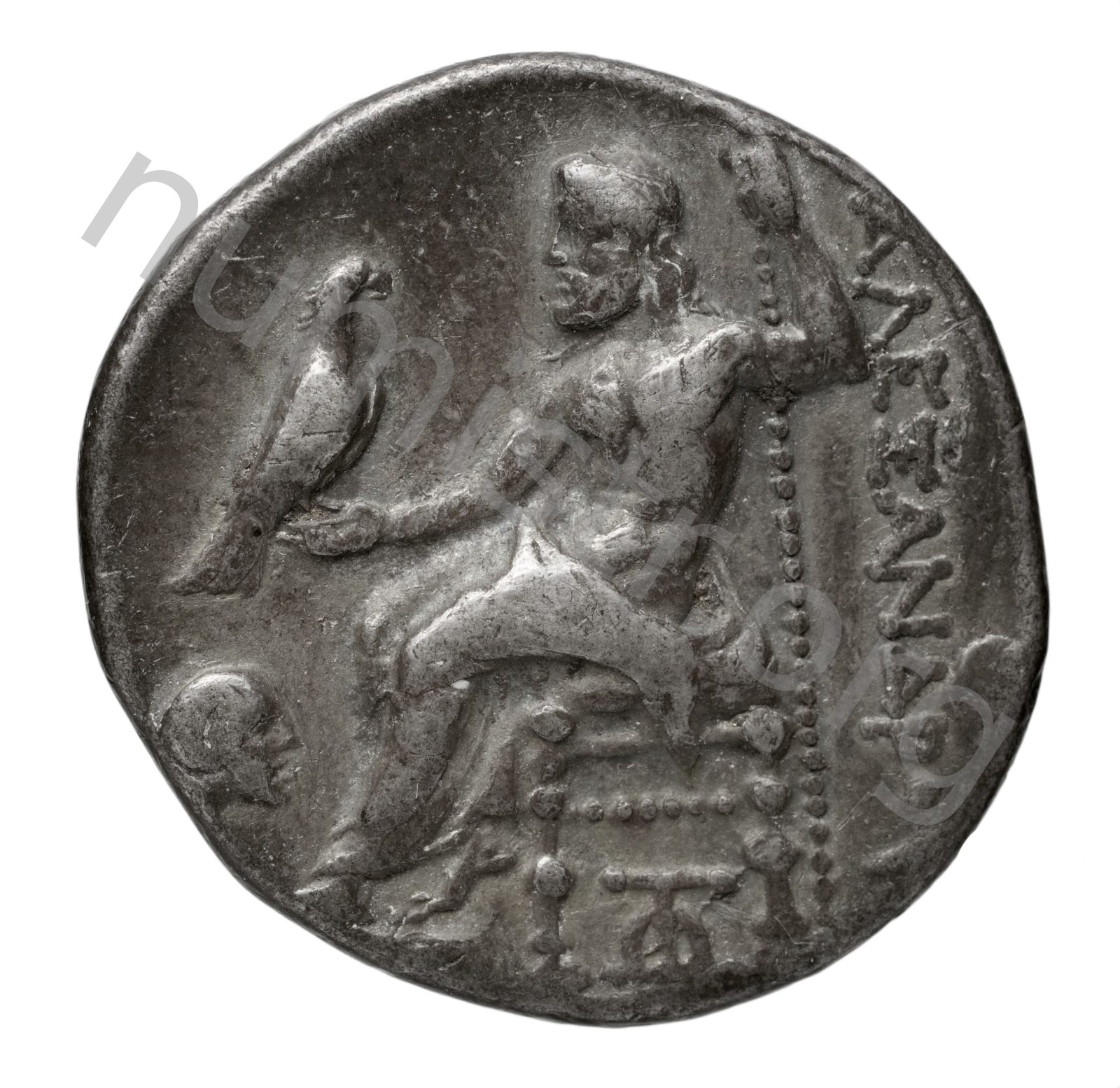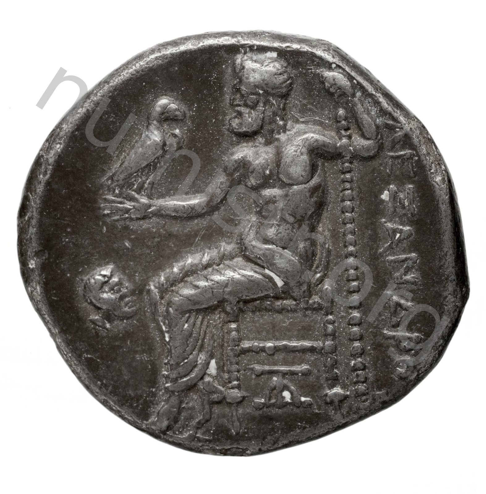 Zeus tabure-tahtta oturuyor sol elinde kartal sağ elinde asa var.