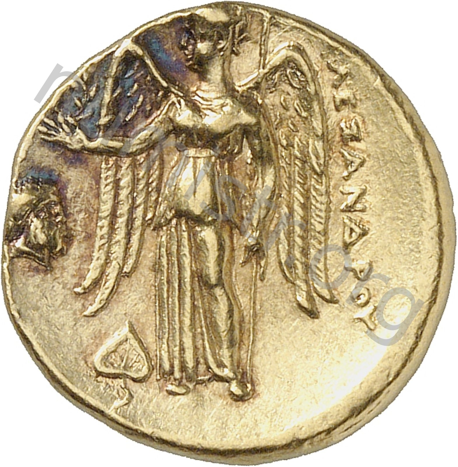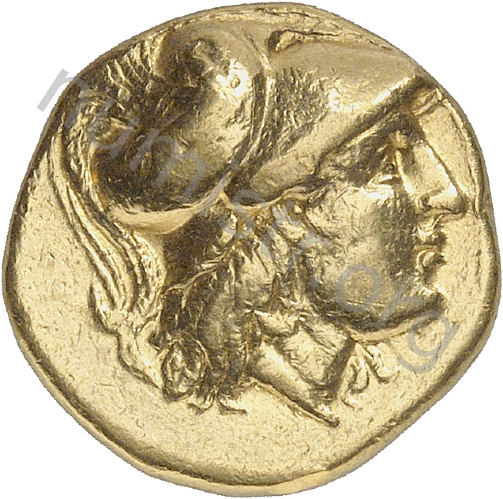 Sağda armalı Korint miğferi takan Athena başı; miğferin üstünde grifon figürü