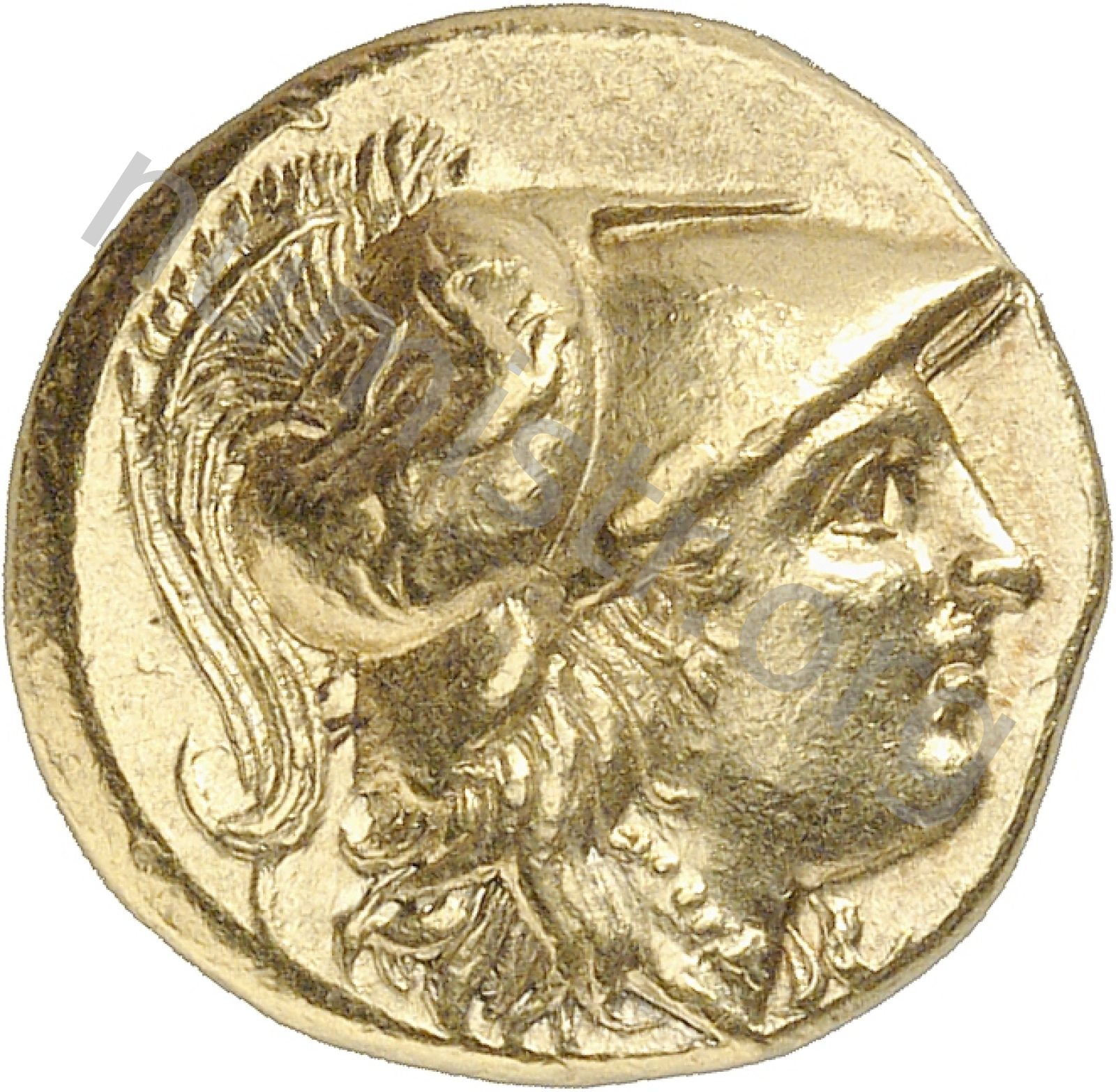 Head of Athena right wearing Corinthian helmet with crest; griffin on bowl of helmet -[en]