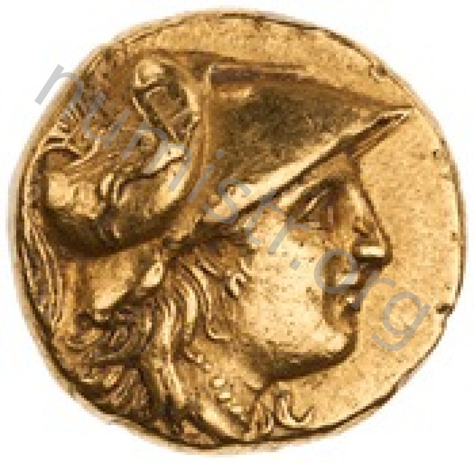 Head of Athena right wearing Corinthian helmet with crest -[en]