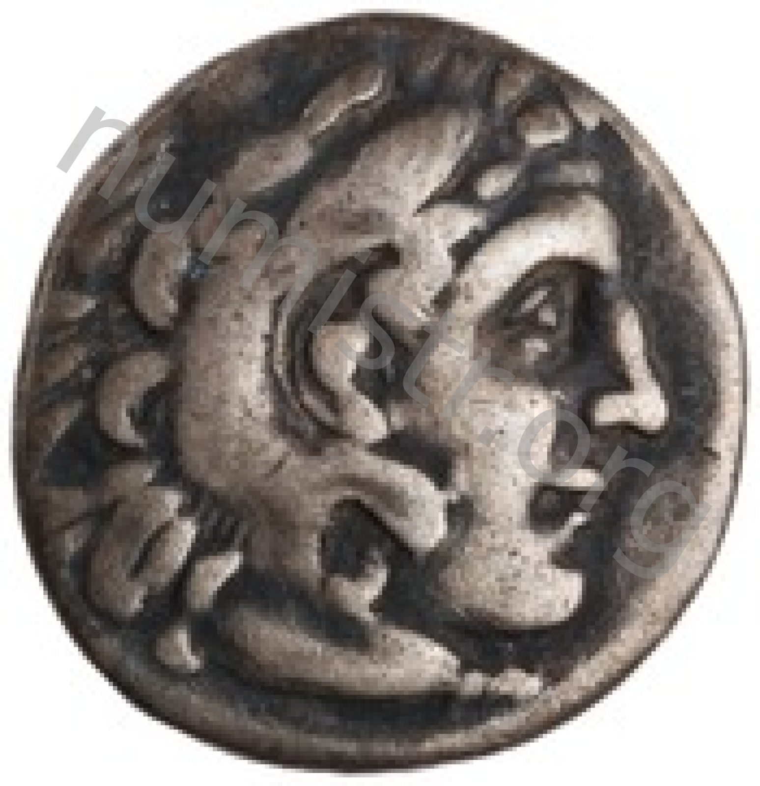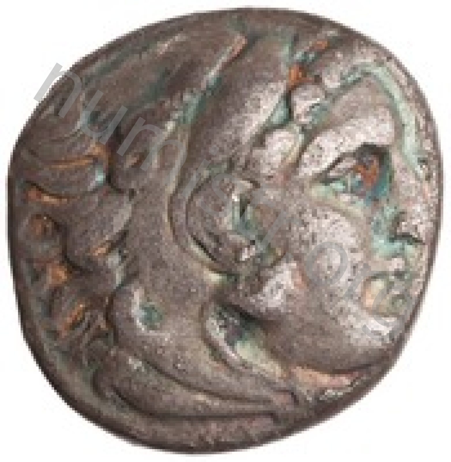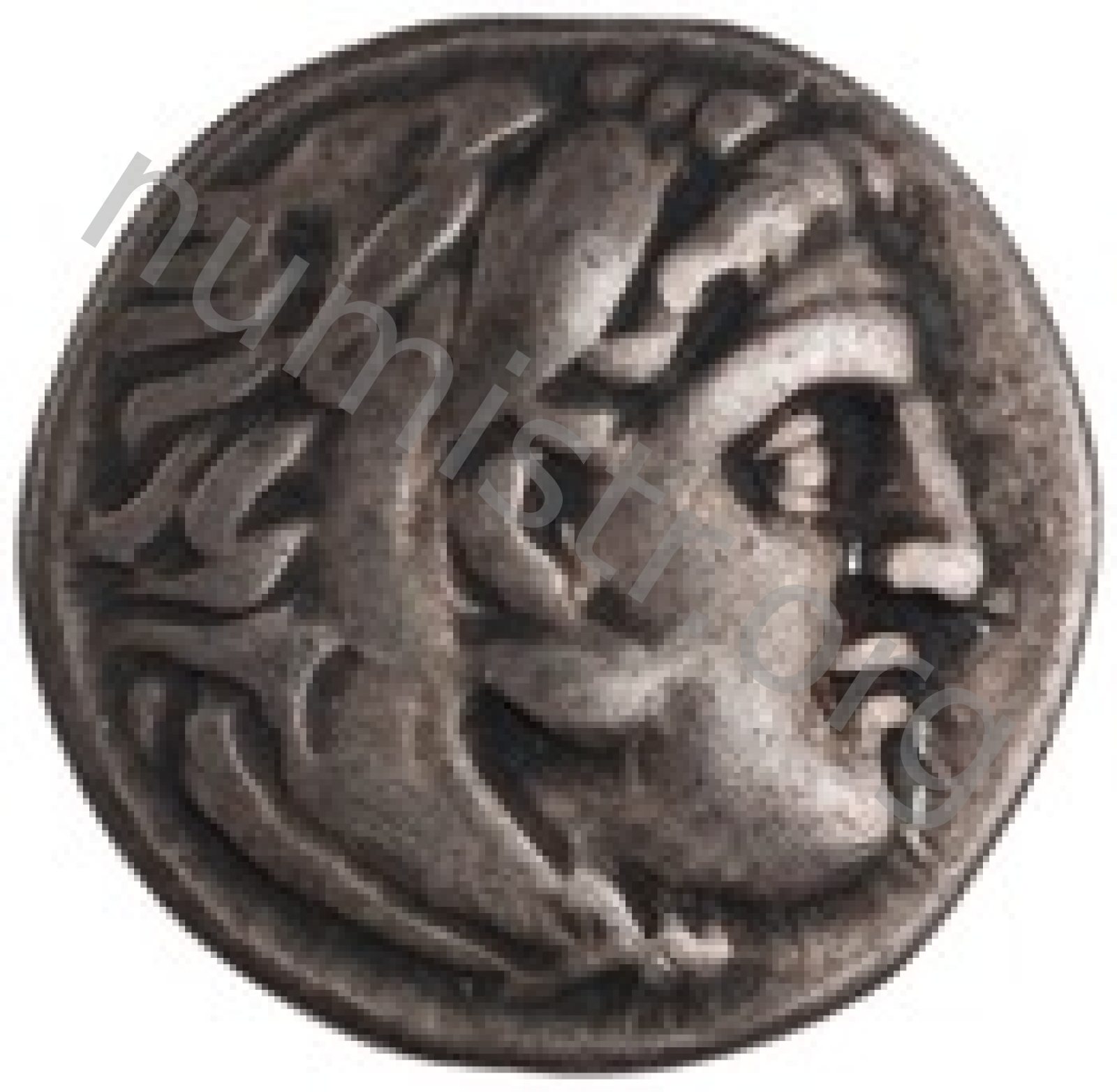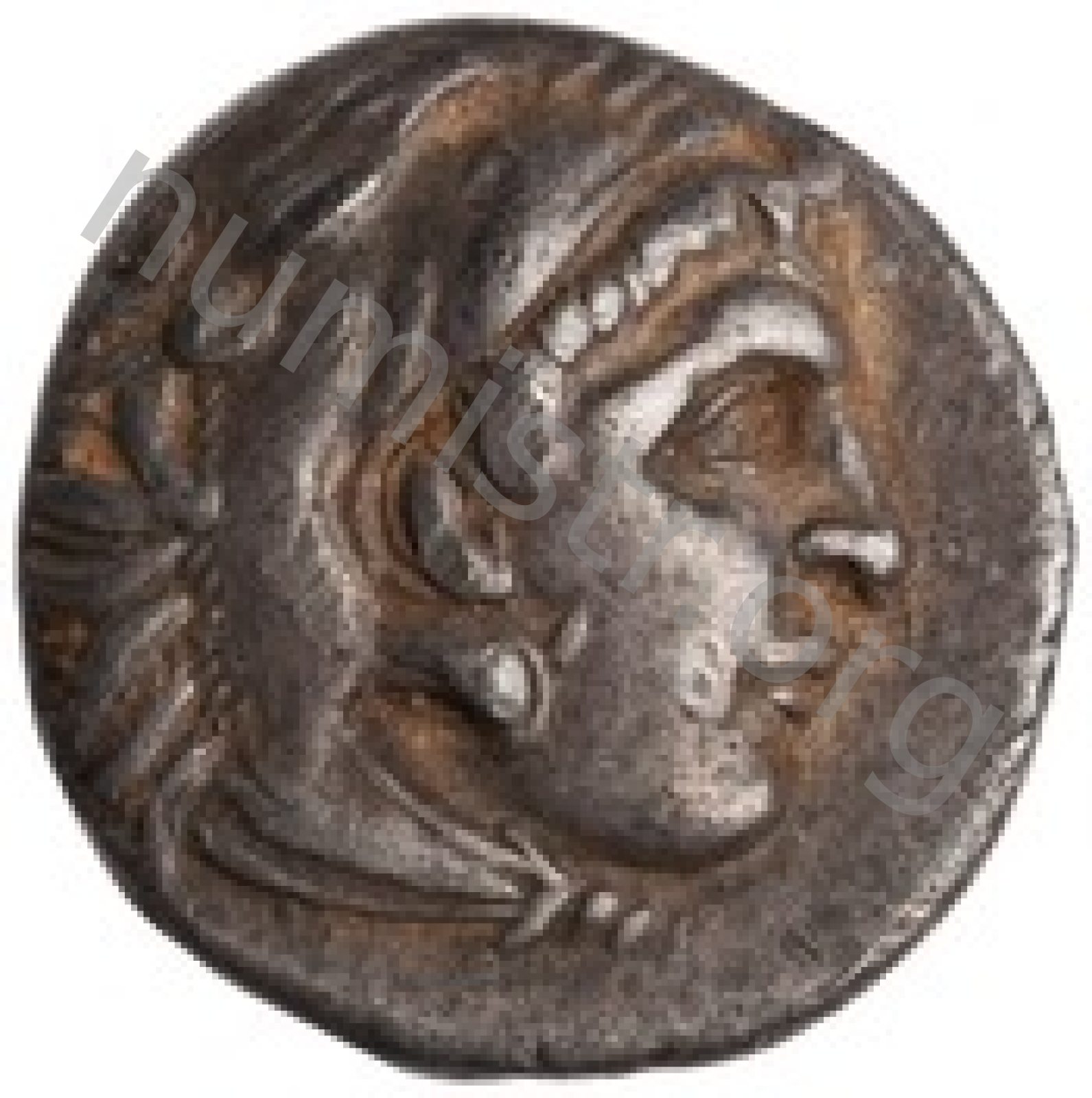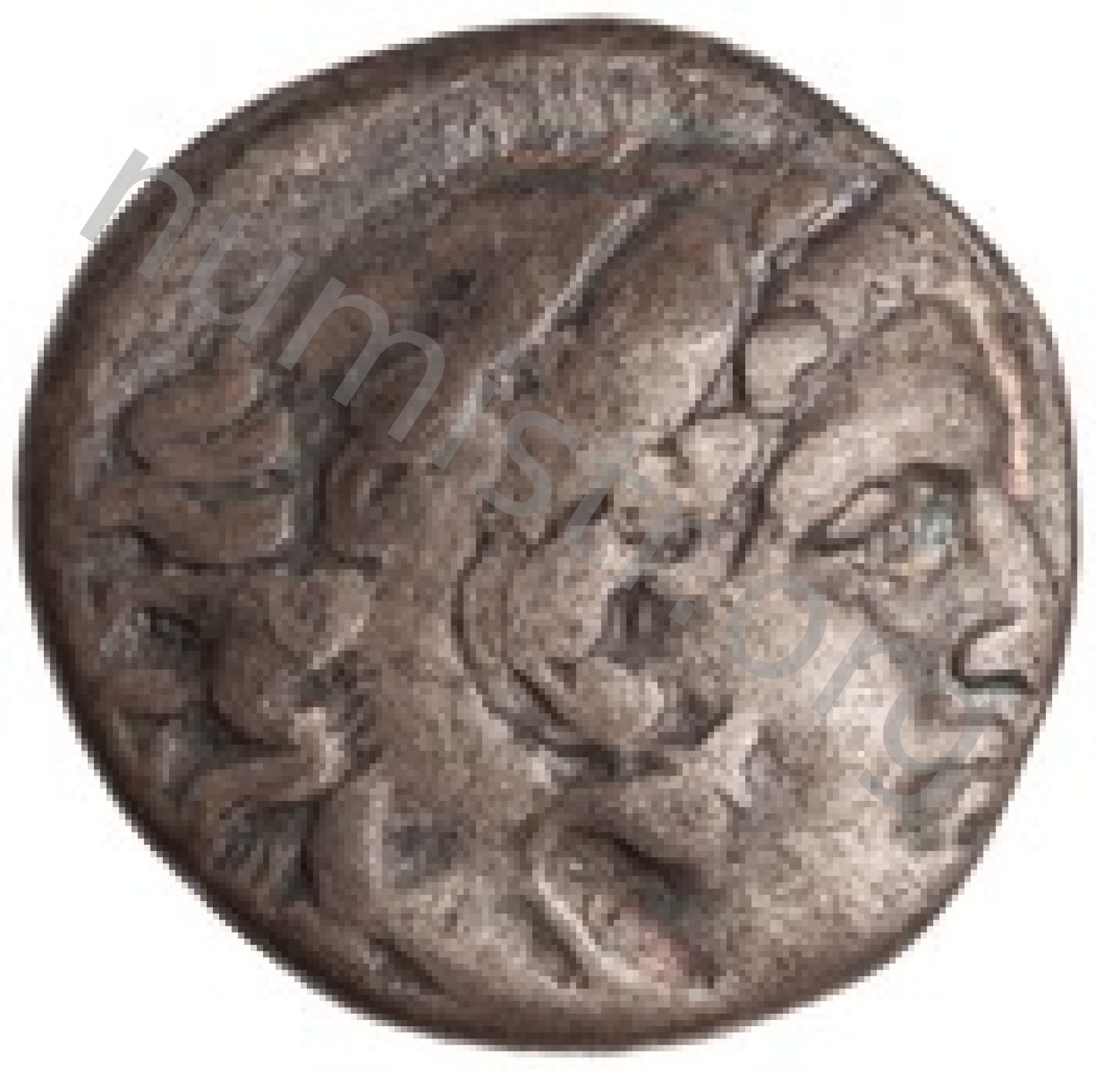 Head of beardless Heracles right wearing lion skin headdress -[en]